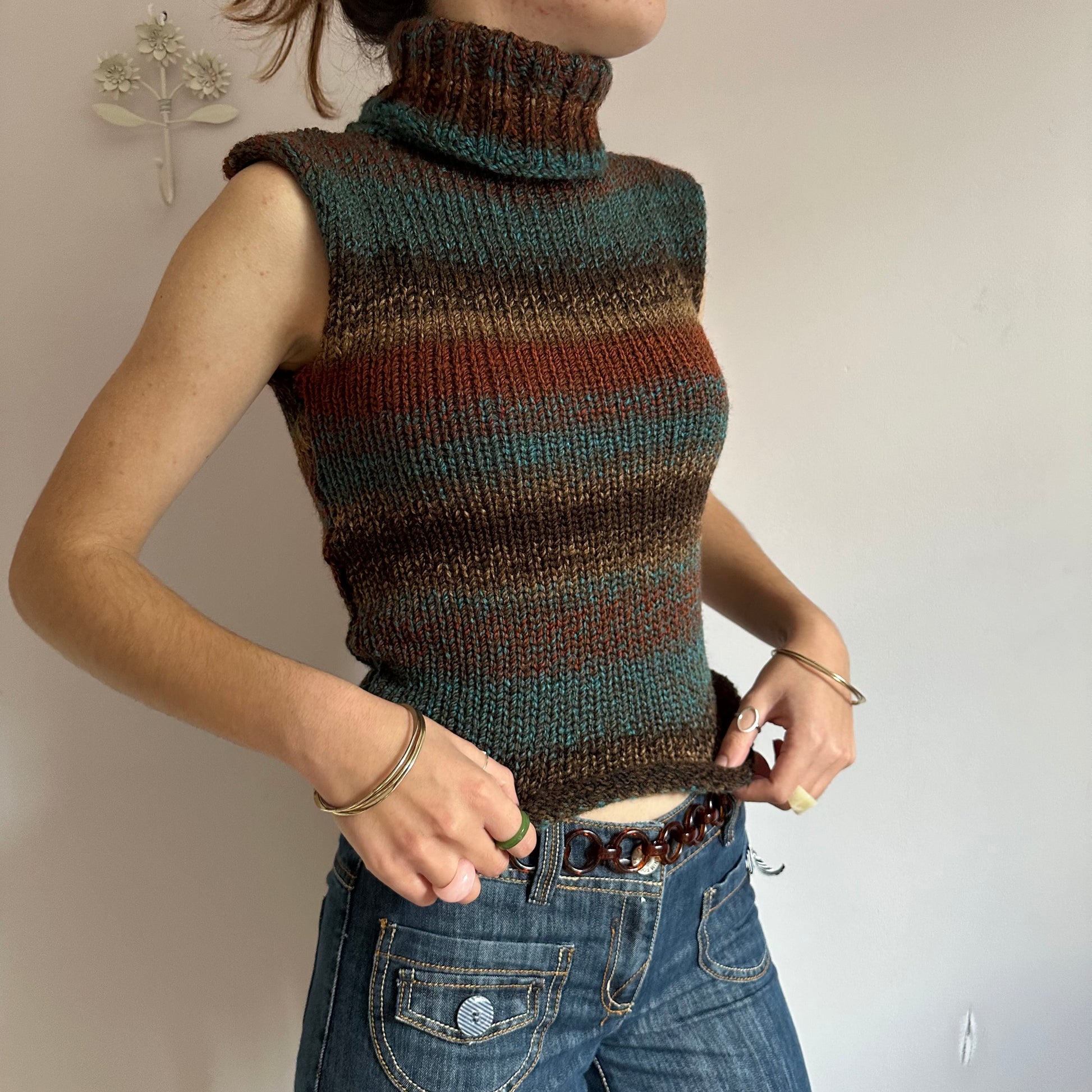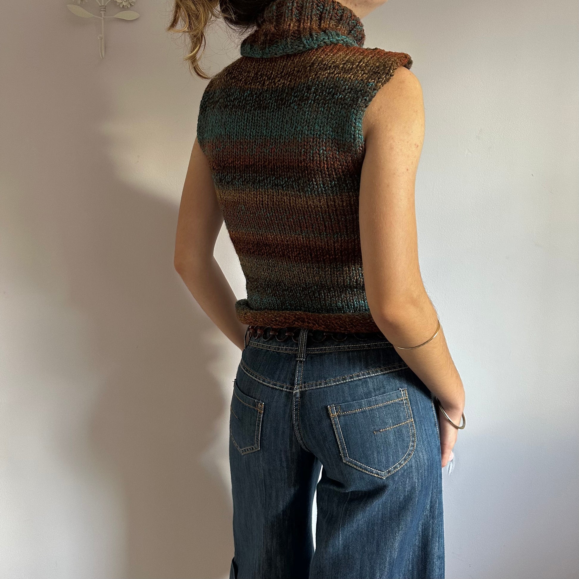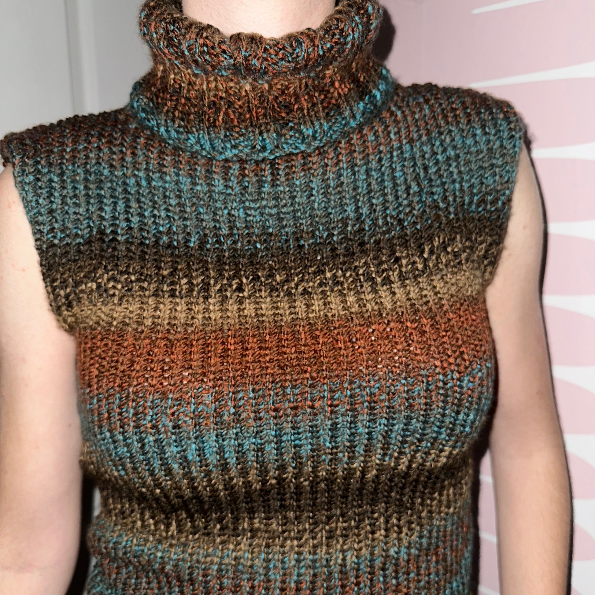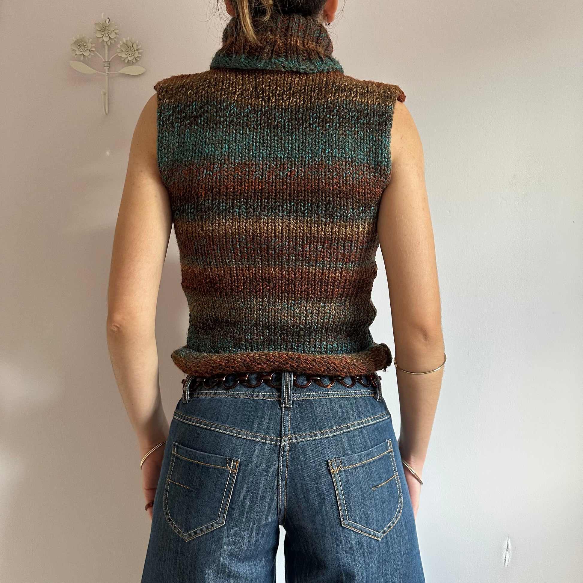 Chunky knitted roll neck sweater vest in the most gorgeous brown and blue colours 🦋 great for layering or on its own!