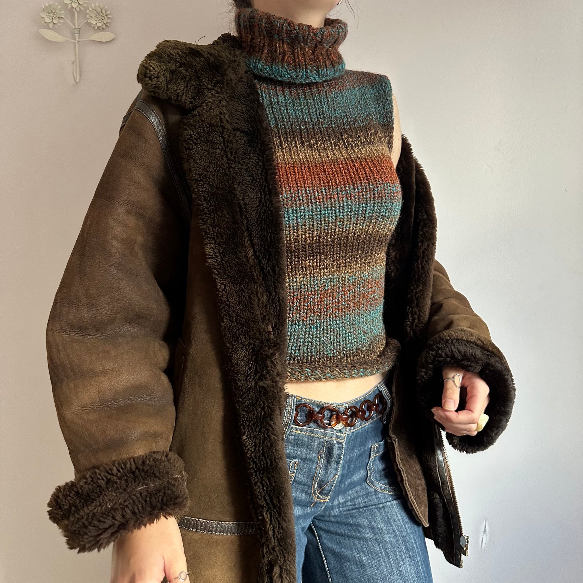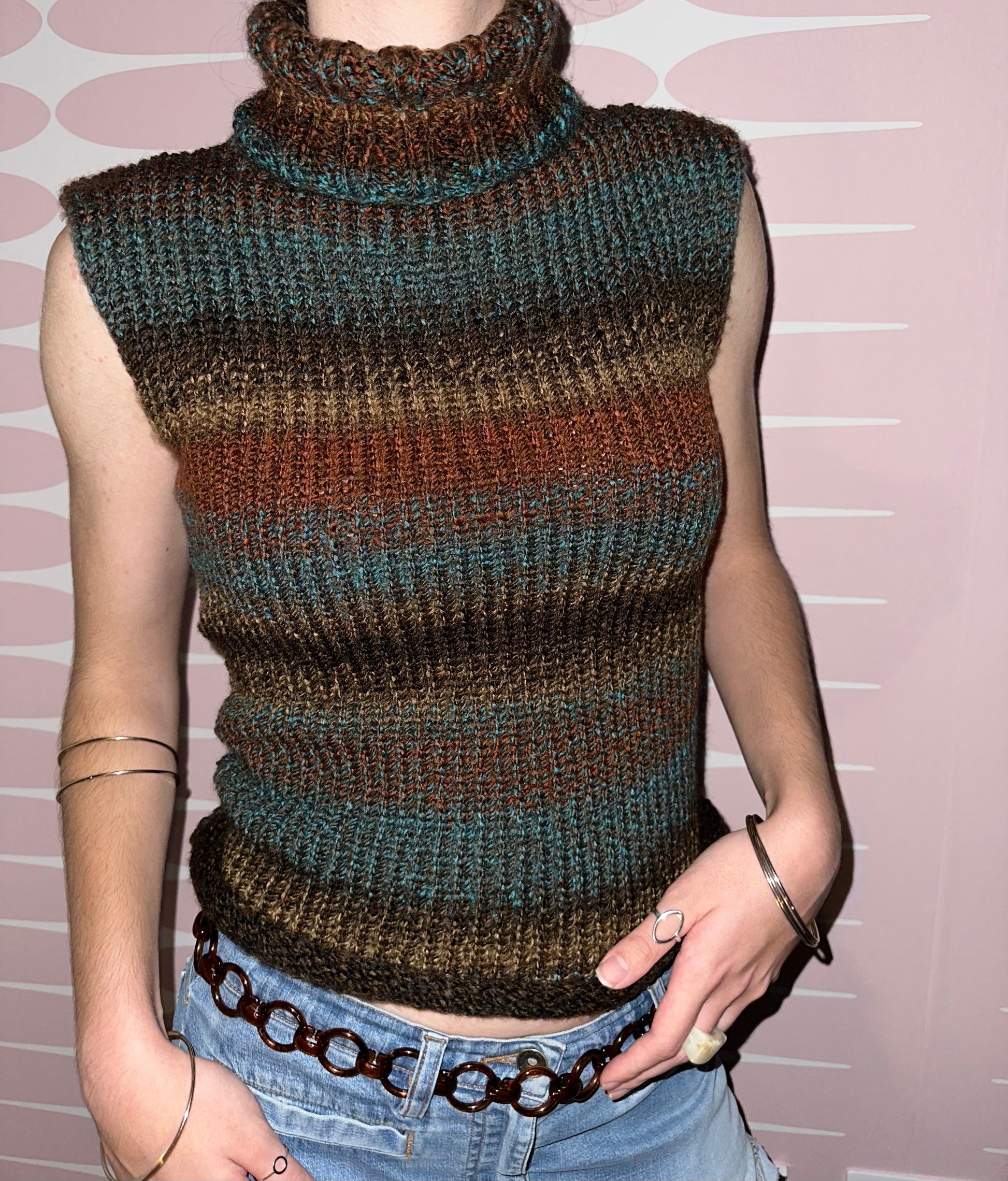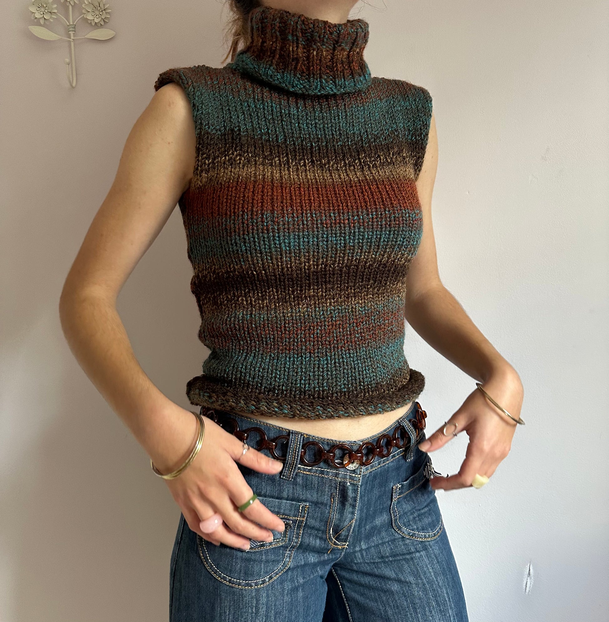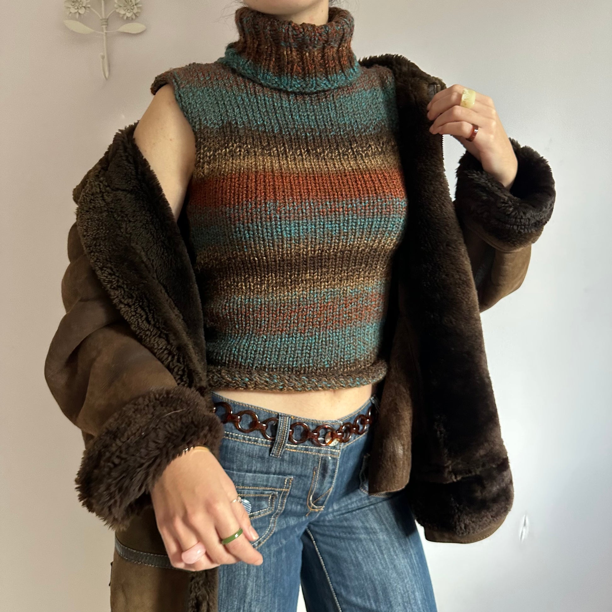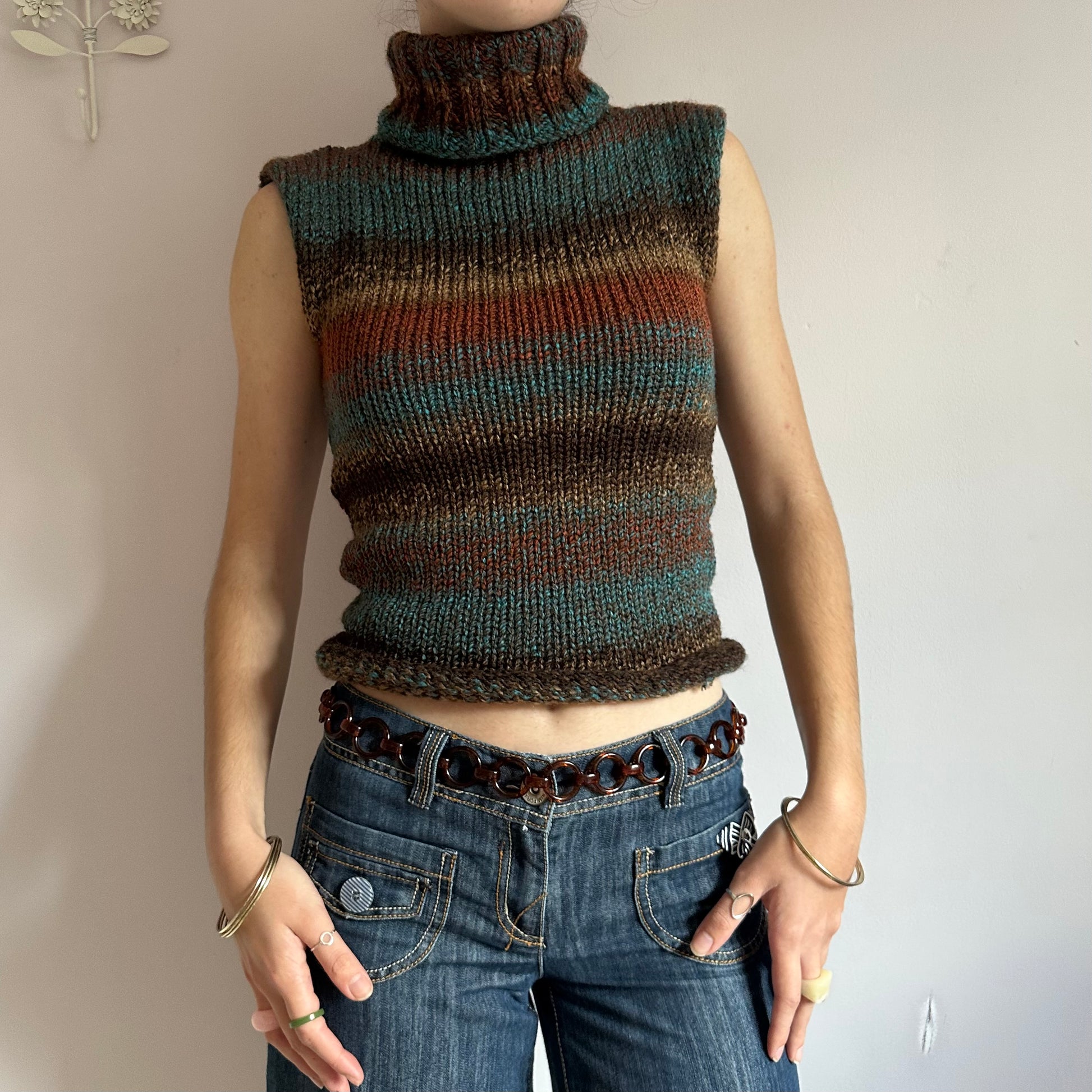 Chunky knitted roll neck sweater vest in the most gorgeous brown and blue colours 🦋 great for layering or on its own!