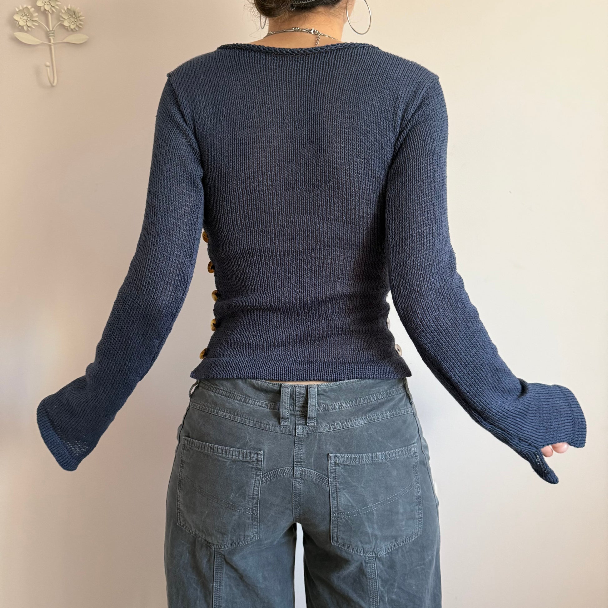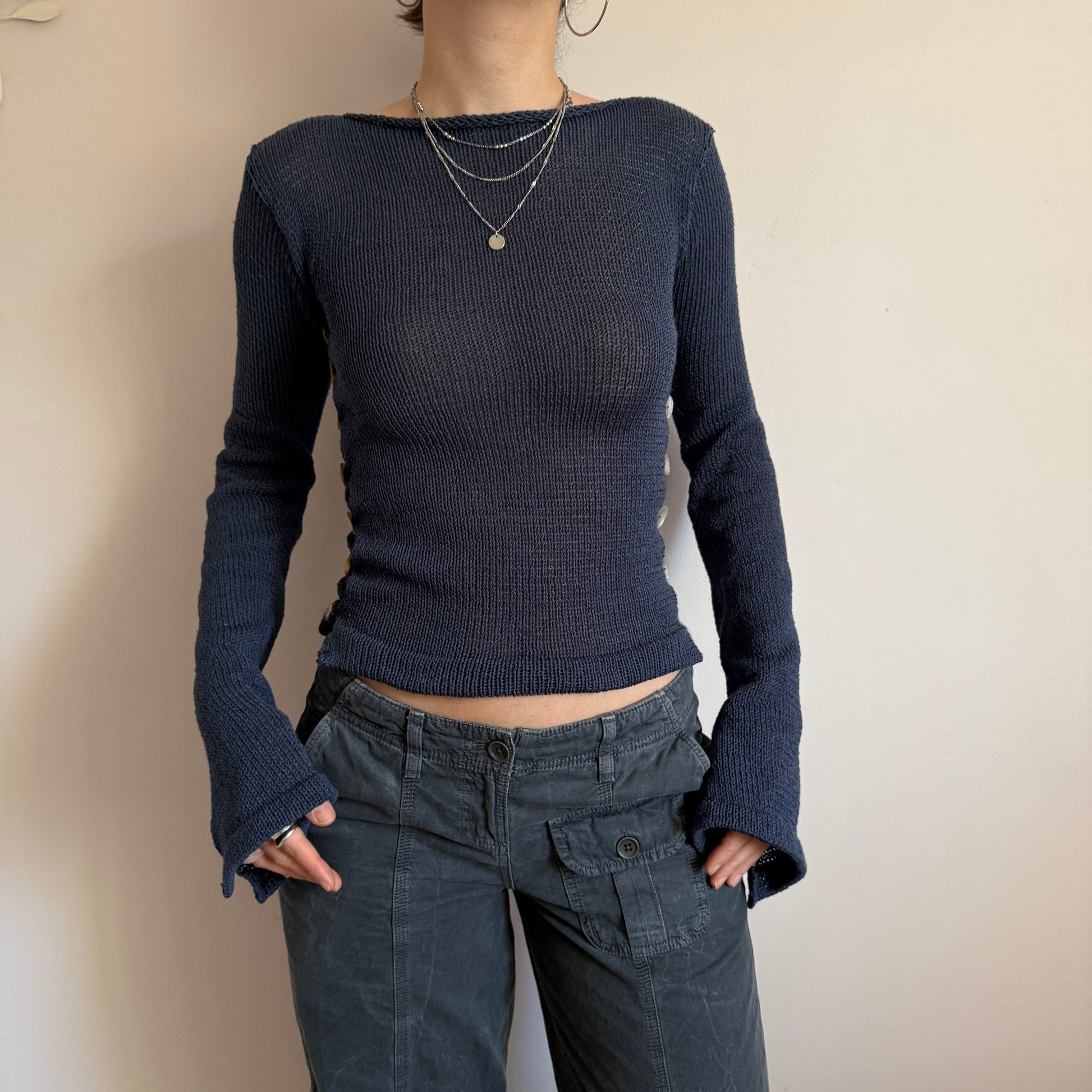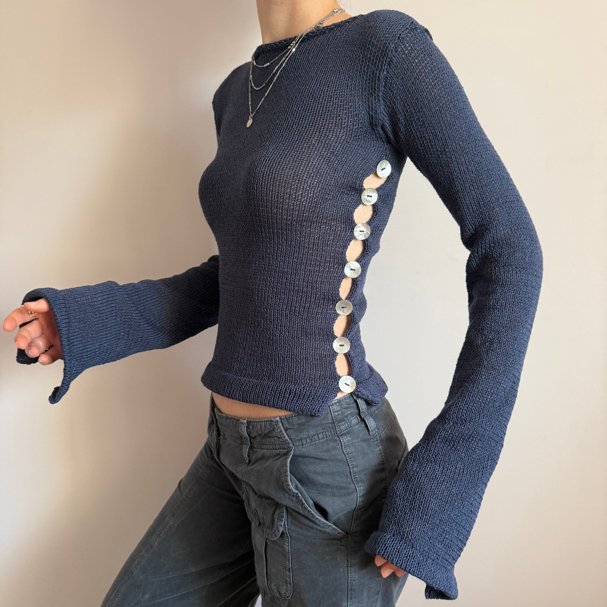 New in ⭑ Handmade cotton knitted boat neck jumper in a gorgeous navy blue colour. Features two open sides with mother of pearl buttons and subtly flared sleeves. Such a special piece ✨