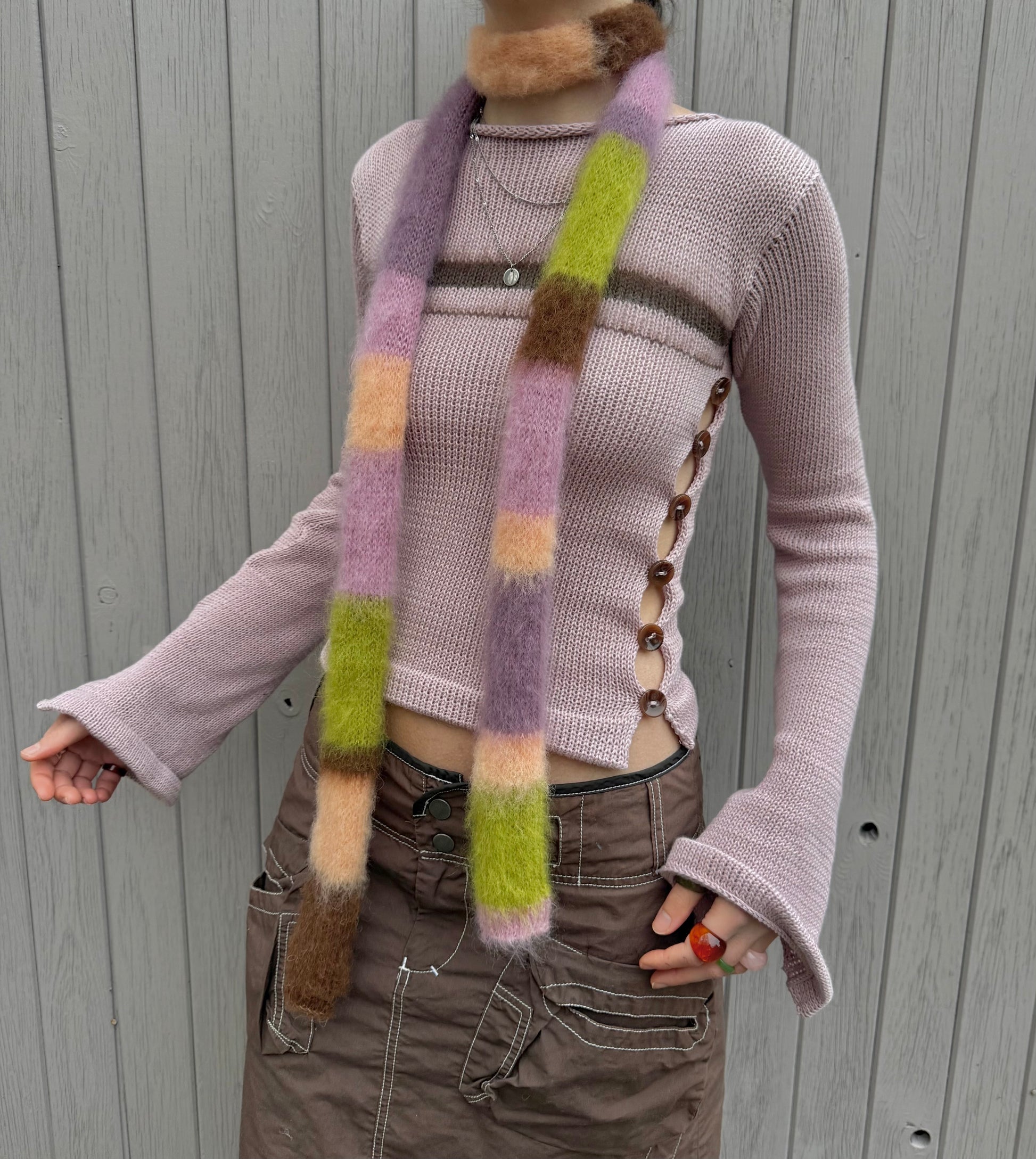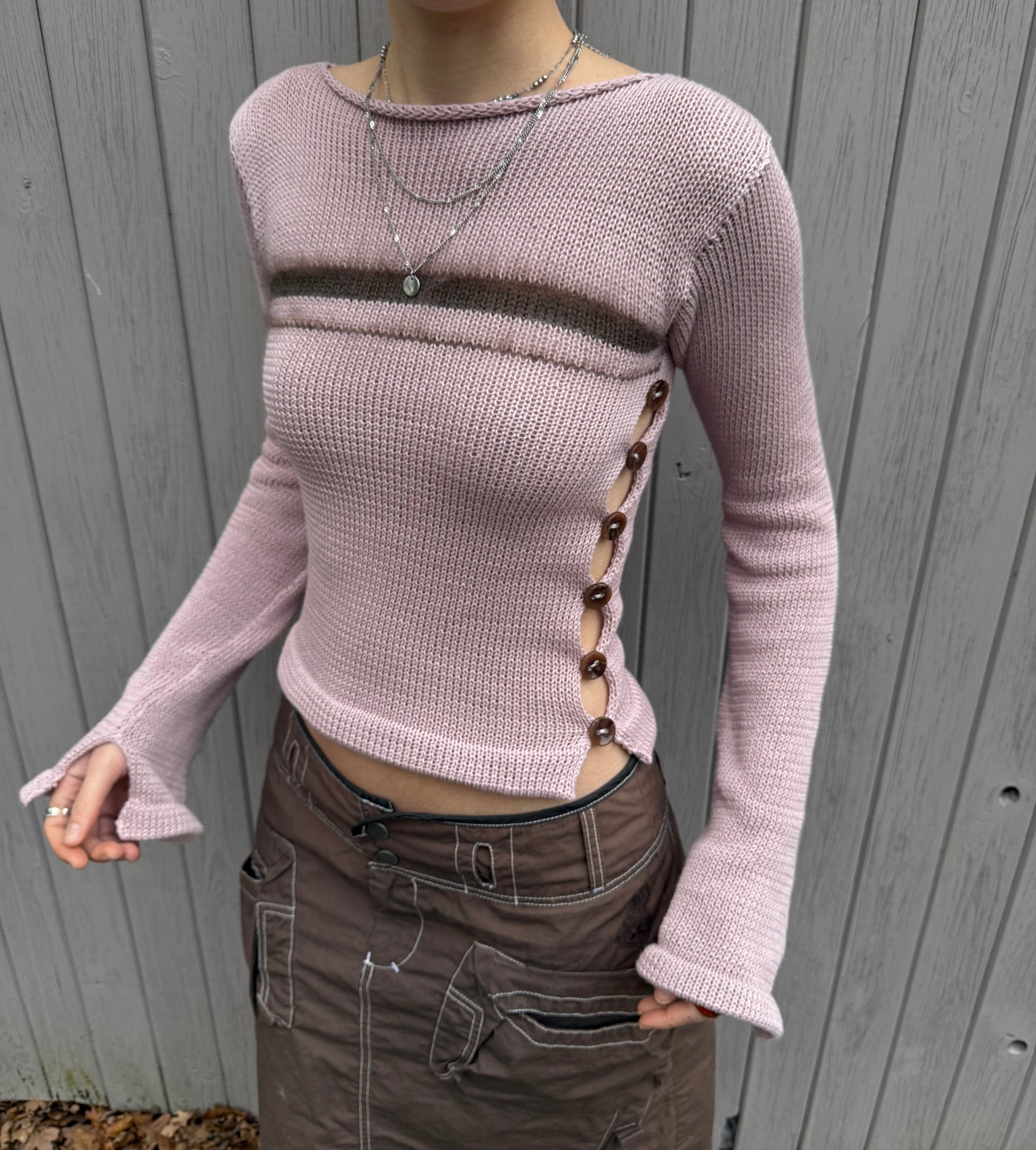 New in ⭑ Handmade knitted boat neck jumper in a gorgeous dusky pink colour. Features two open sides with glossy brown marble buttons, subtly flared sleeves and fluffy mohair stripes. Such a special piece ✨