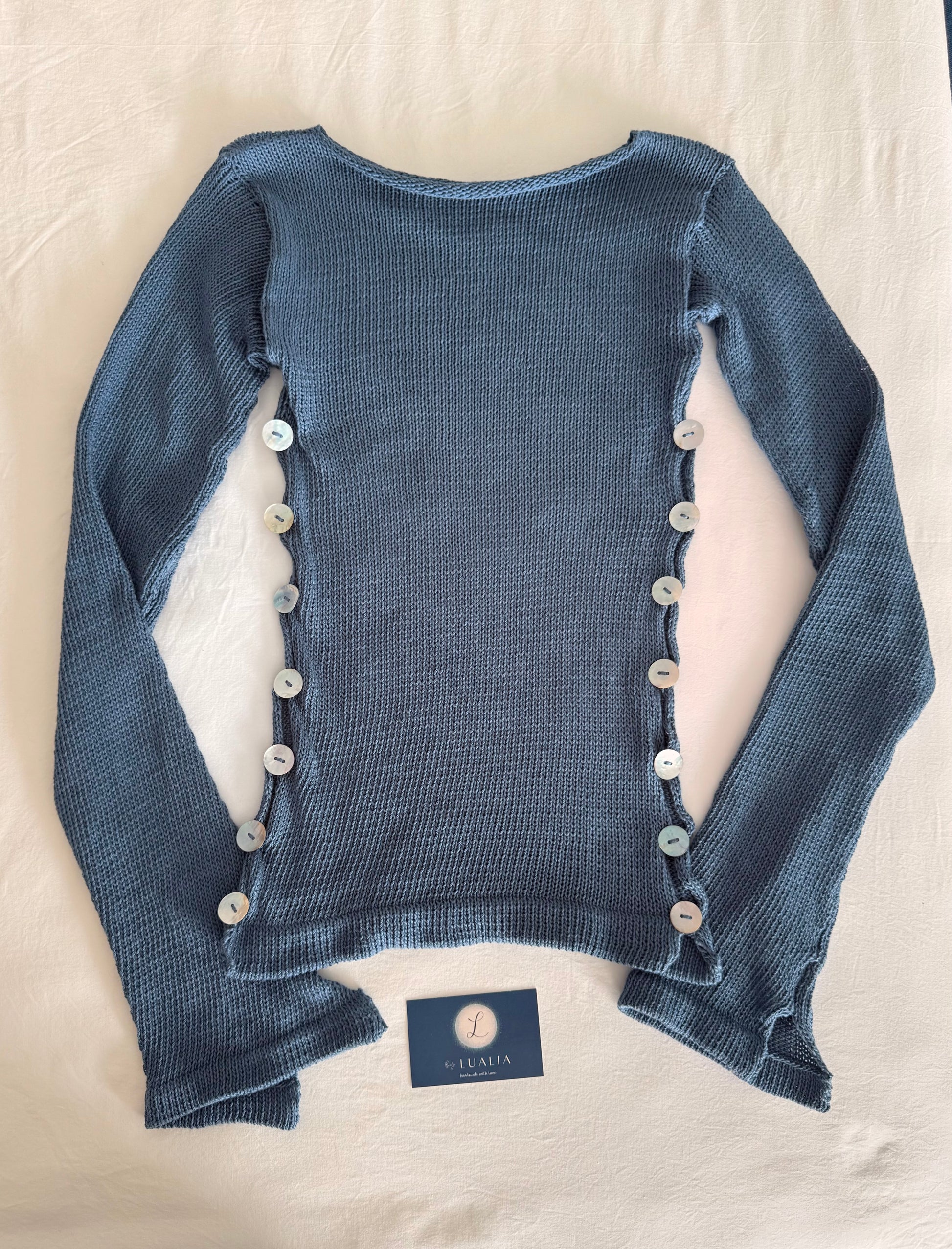 Pearl Long Sleeve in denim blue - handmade knit jumper with mother of pearl buttons