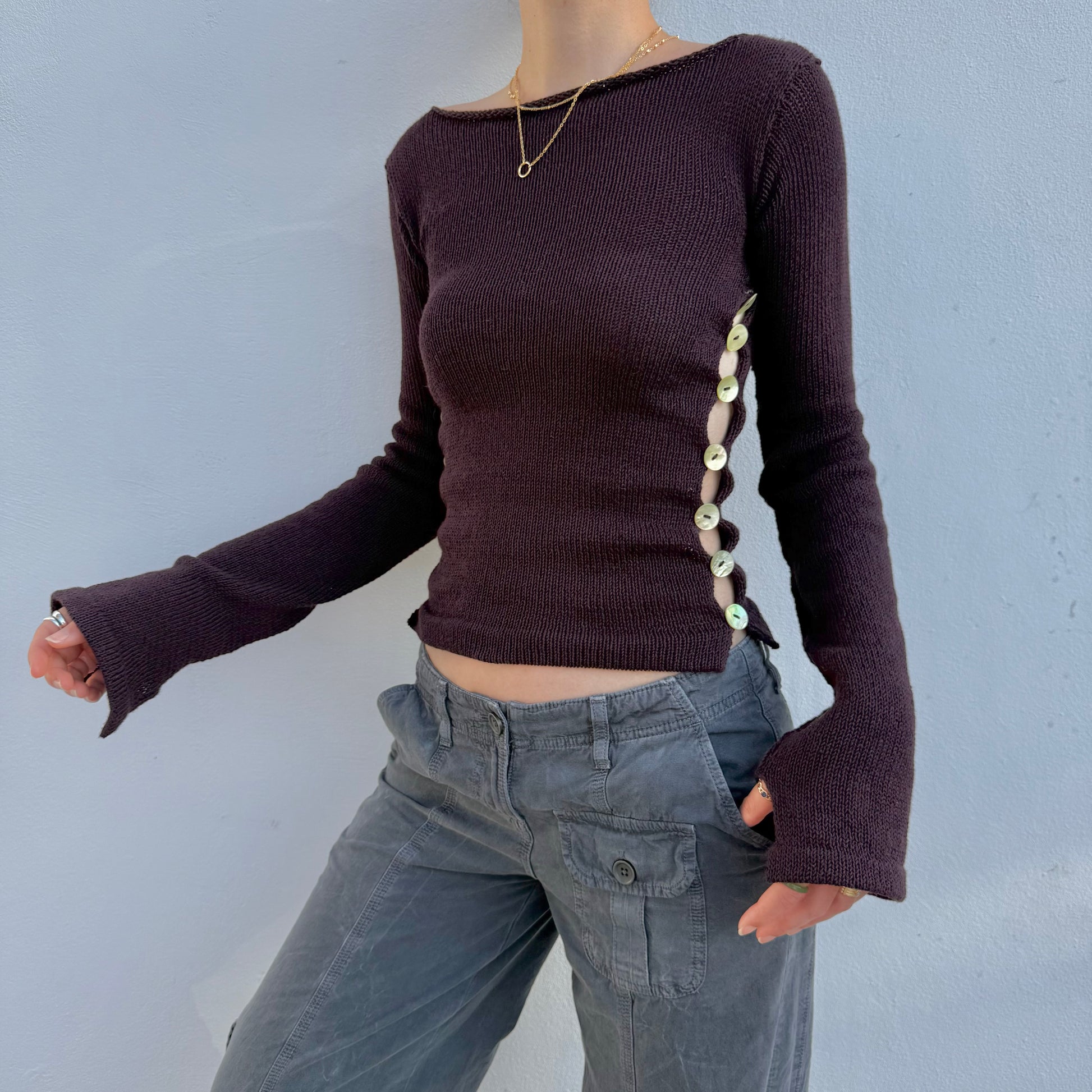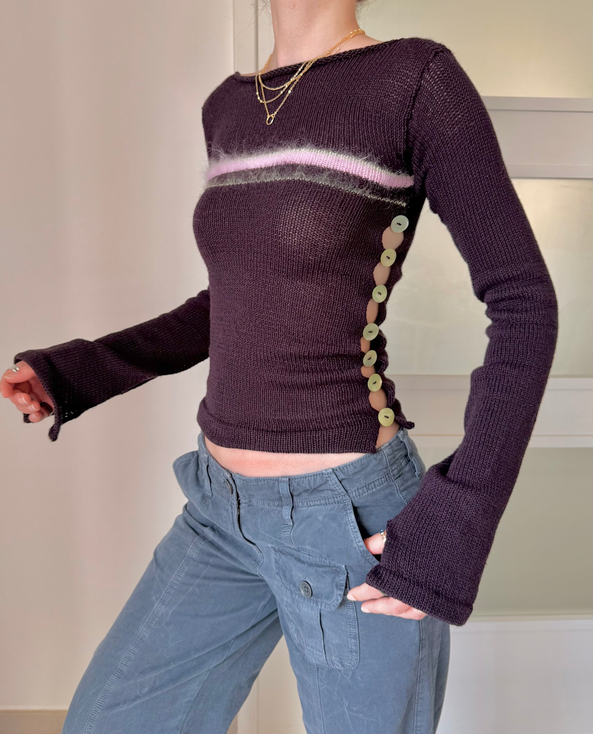 New in for AW25 โญ Handmade knitted boat neck jumper in a gorgeous deep purple colour. ๐ฎ Features two open sides with light green mother of pearl buttons, subtly flared sleeves and fluffy pink & green mohair stripes. Such a special piece โจย