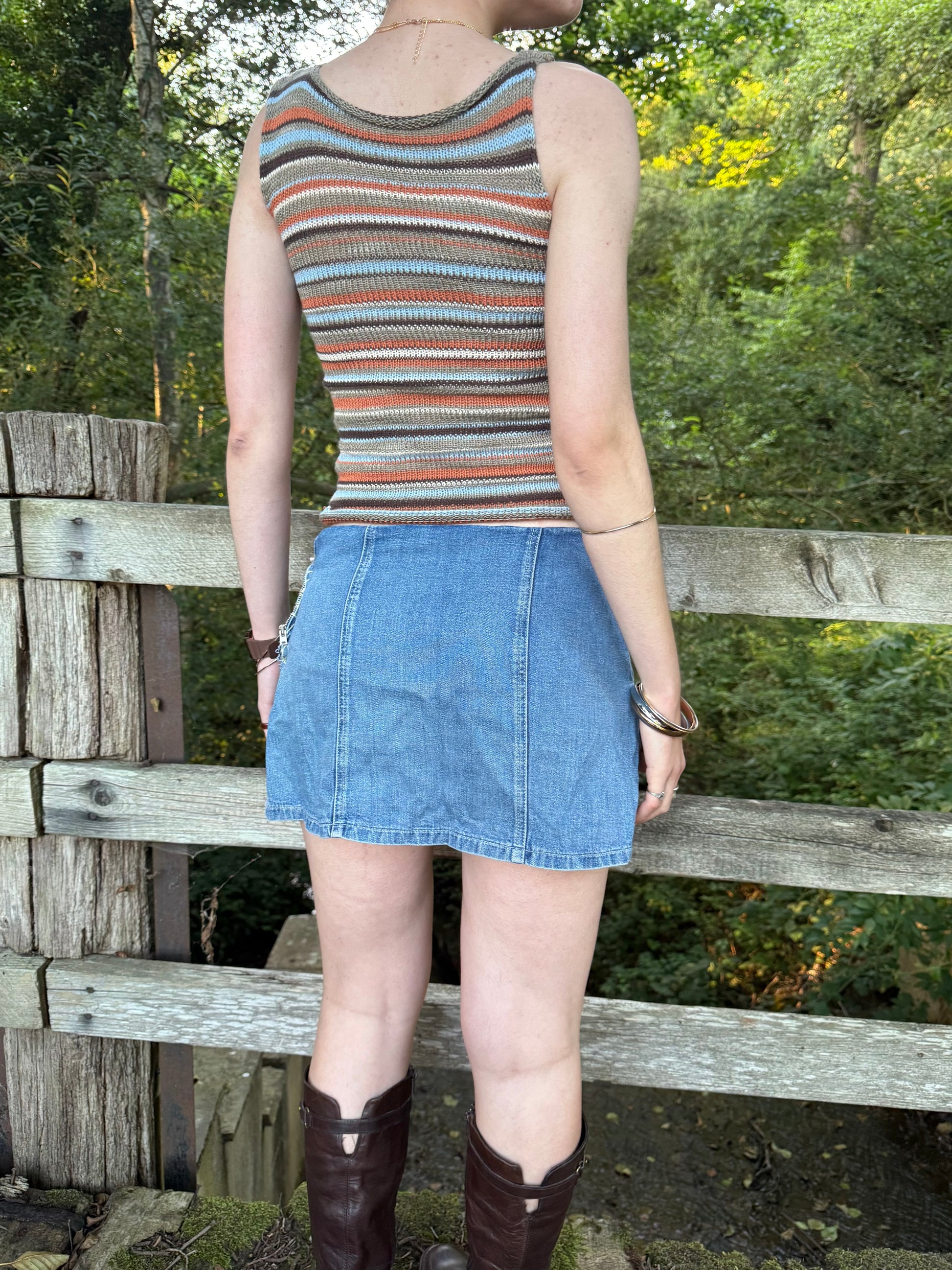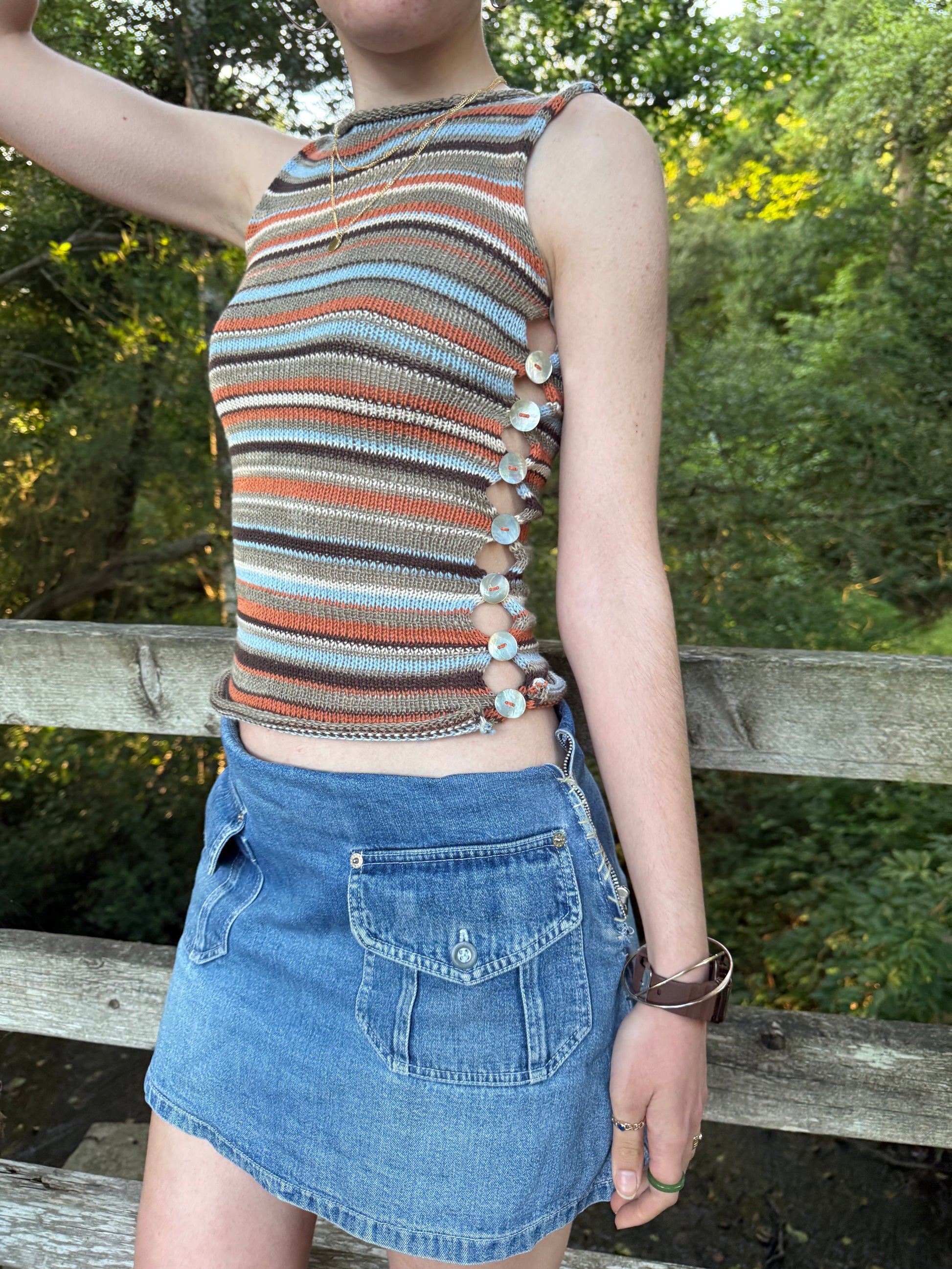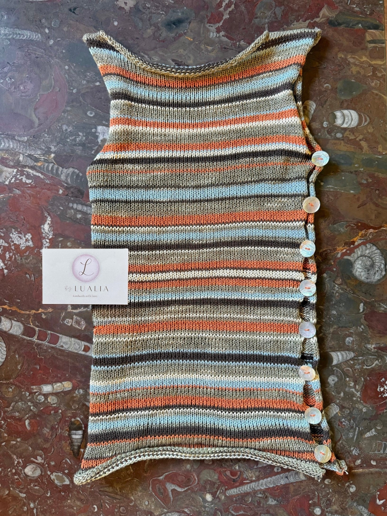 Handmade 70s inspired knitted cotton tank / vest in a gorgeous stripy pattern featuring an open side and mother of pearl buttons 🧡 Such a 1 of a kind piece ✨