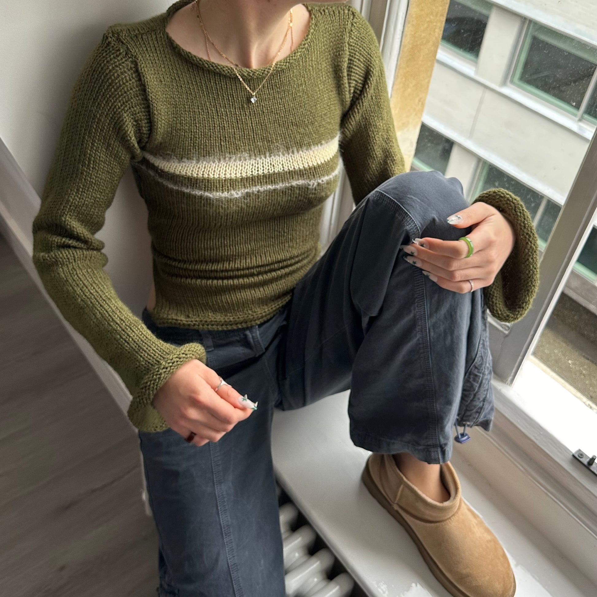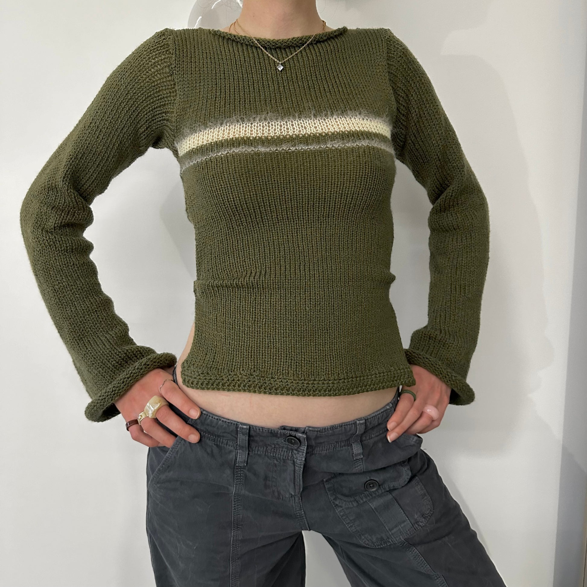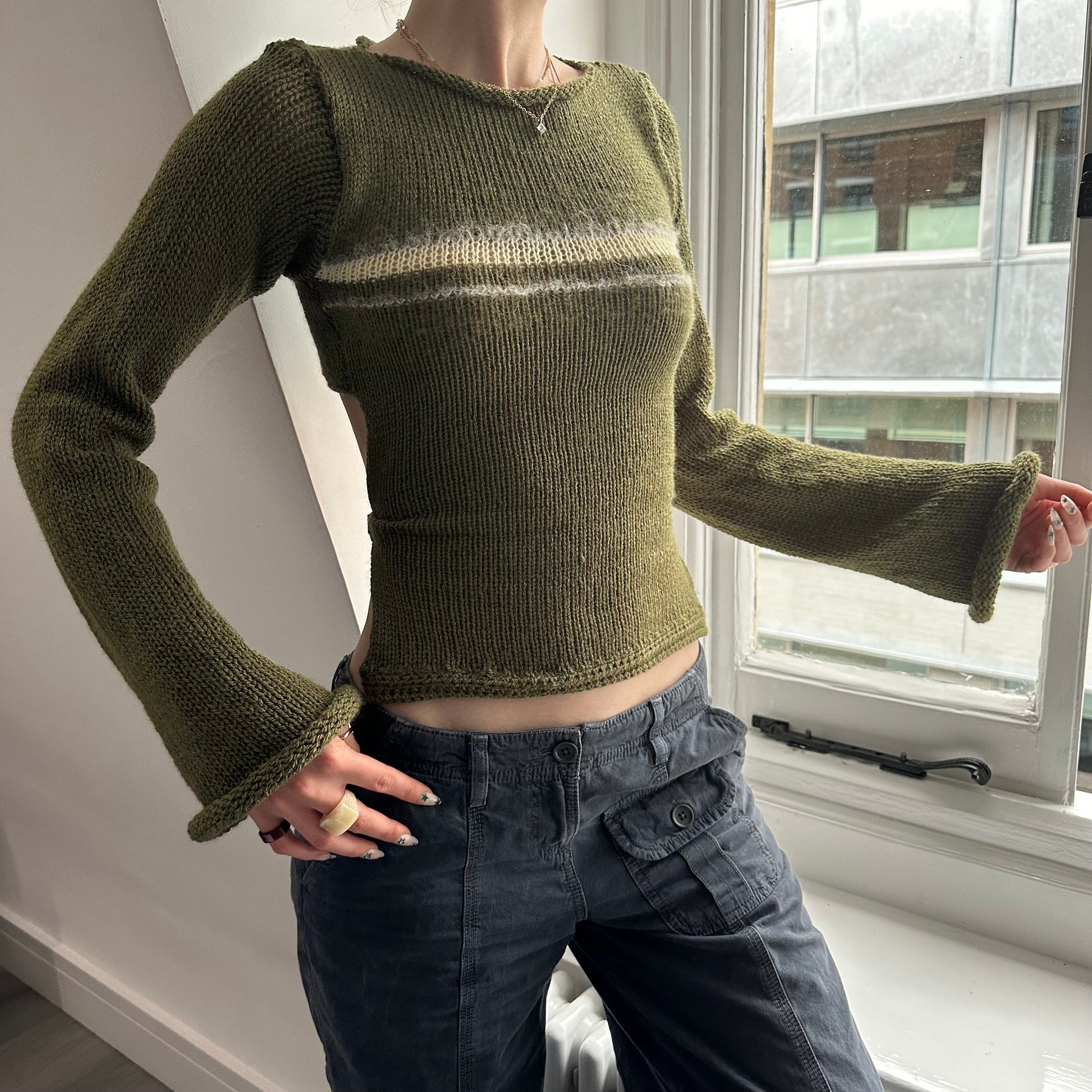 Handmade khaki and cream striped knitted jumper - choose with or without open tie up bow back (without the bow it will be plain full length khaki green at the back!) ✨