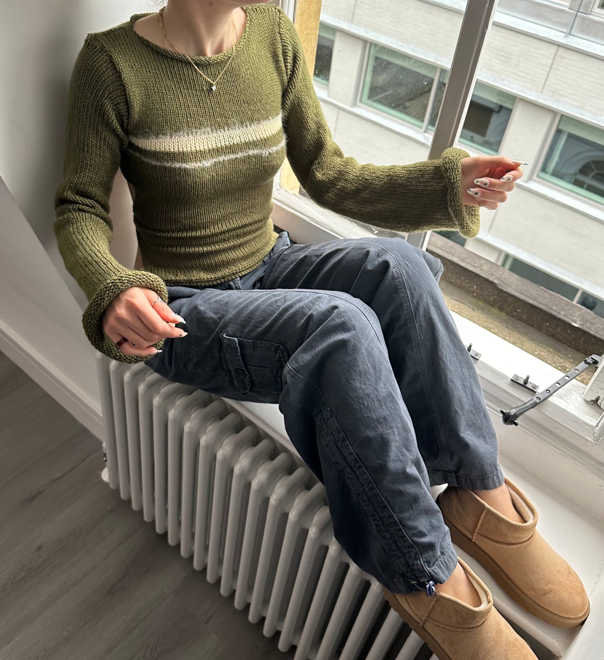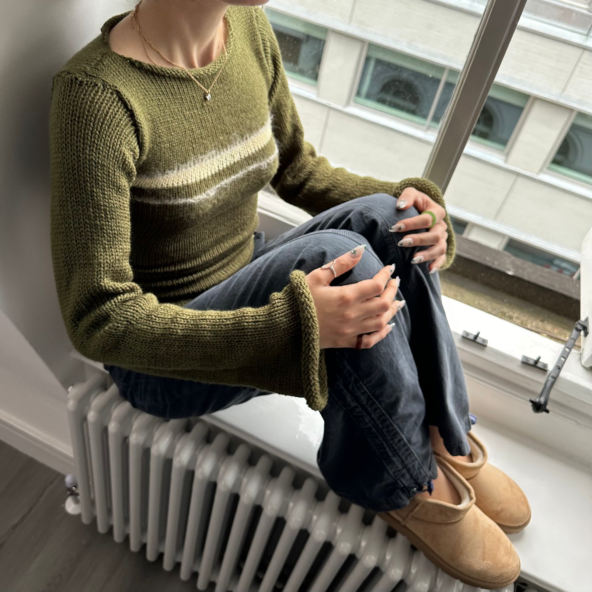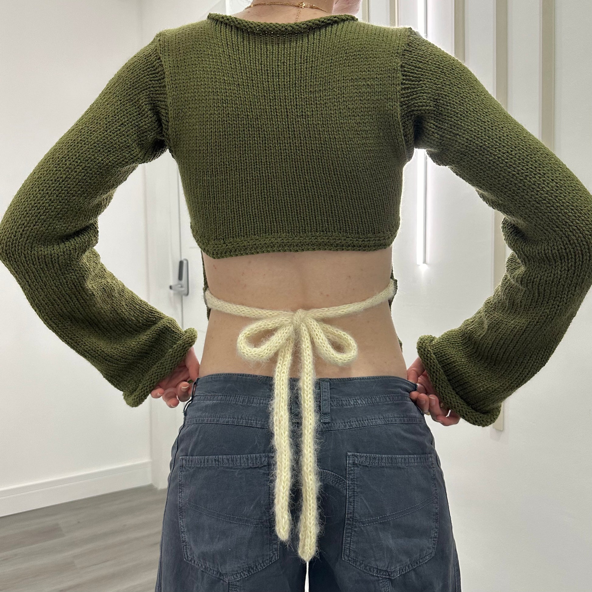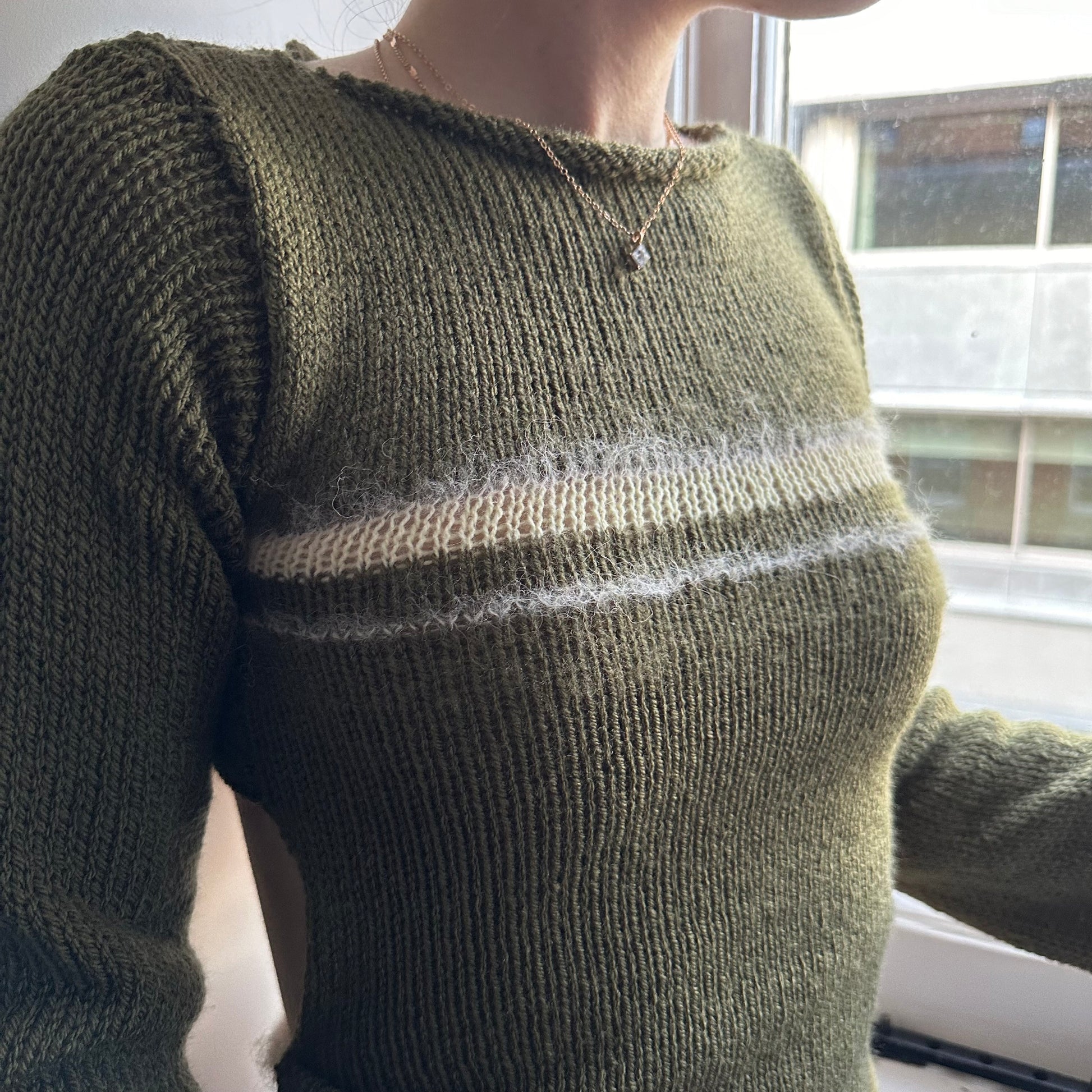 Handmade khaki and cream striped knitted jumper - choose with or without open tie up bow back (without the bow it will be plain full length khaki green at the back!) ✨