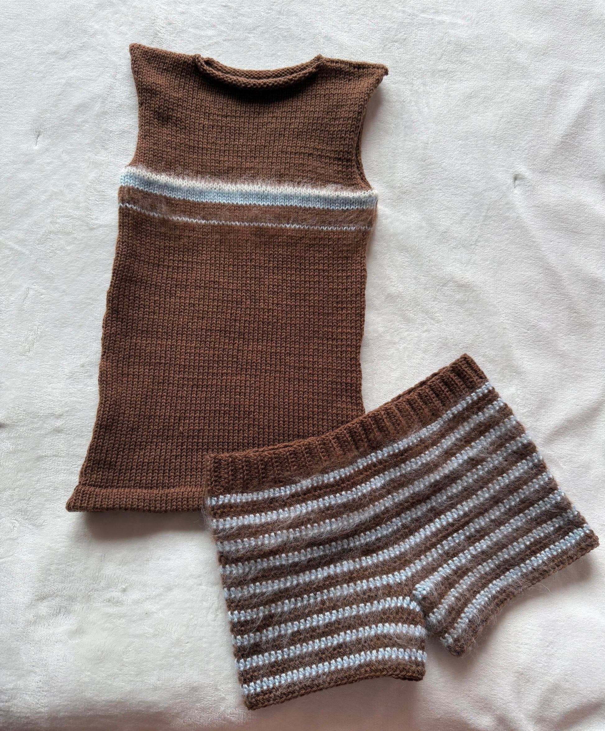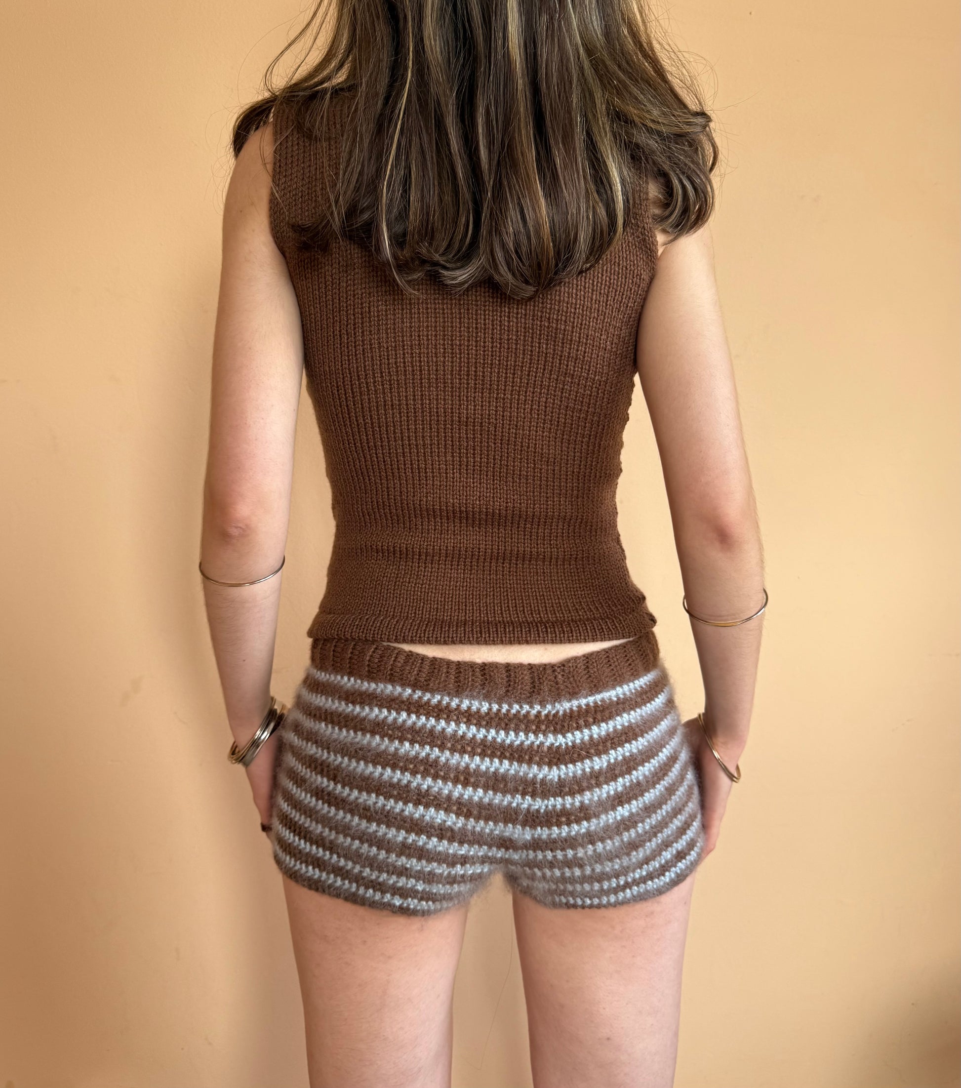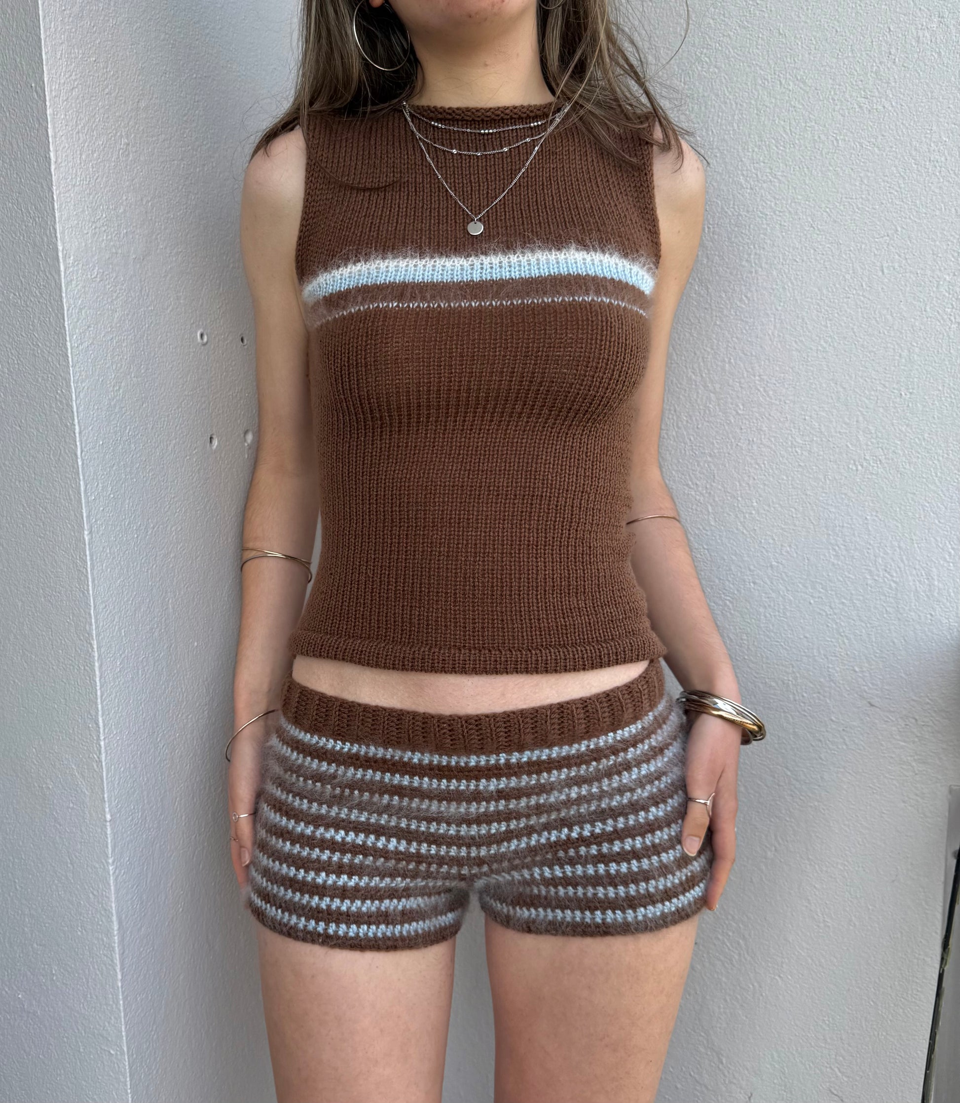 The Brown and Blue Set - matching mohair striped crochet shorts and knit vest top