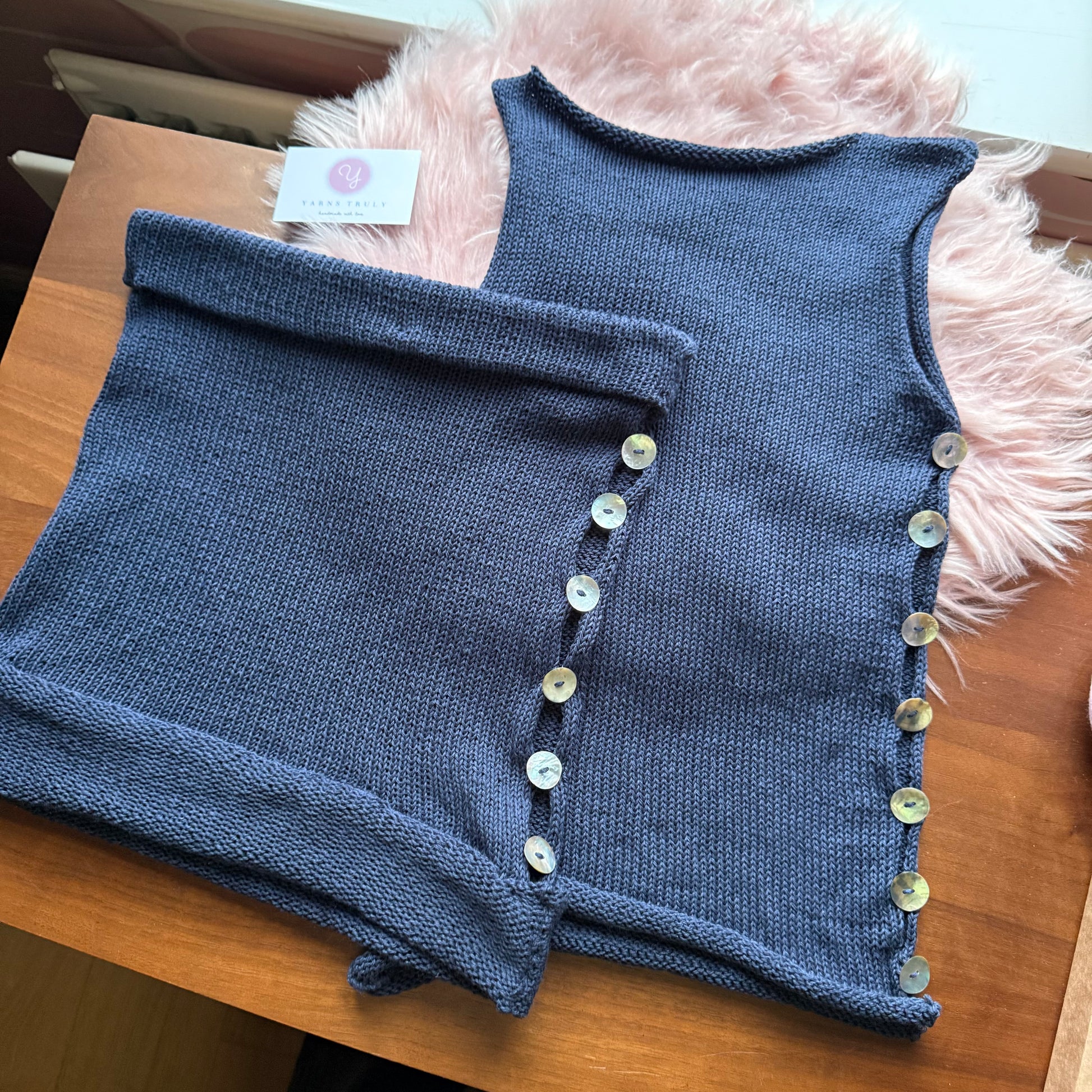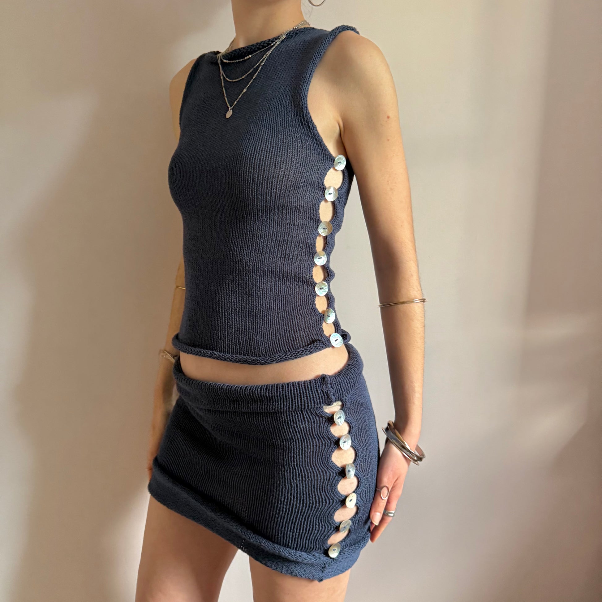 The Pearl Skirt in navy blue - handmade knitted mini skirt with mother of pearl buttons