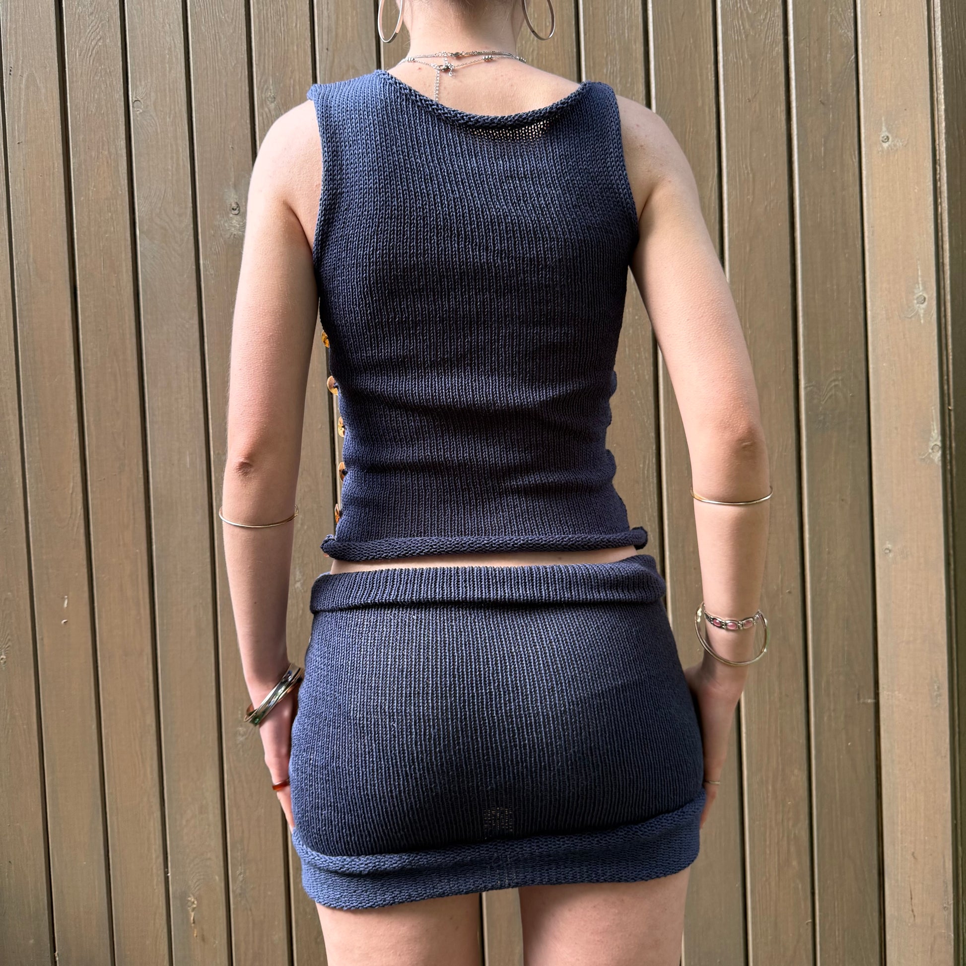 New in! ๐ฆ Navy blue knitted mini skirt with open side featuring mother of pearl buttonsย