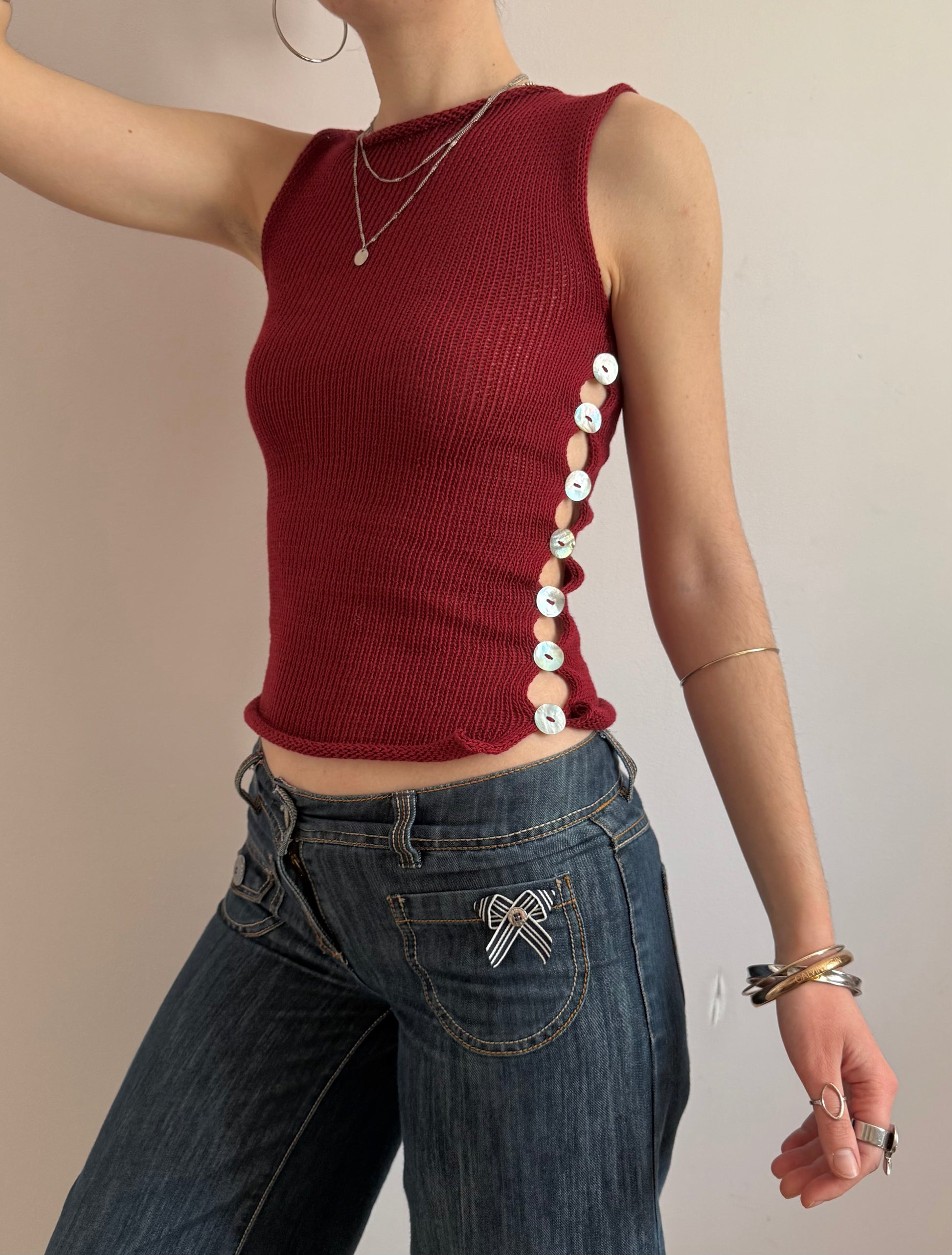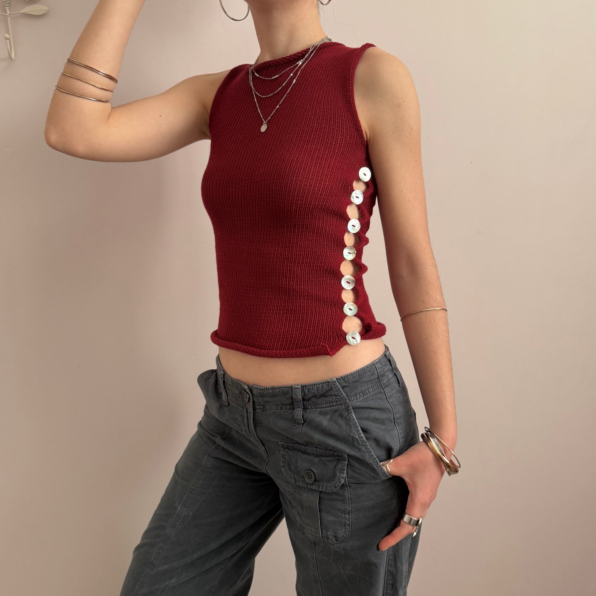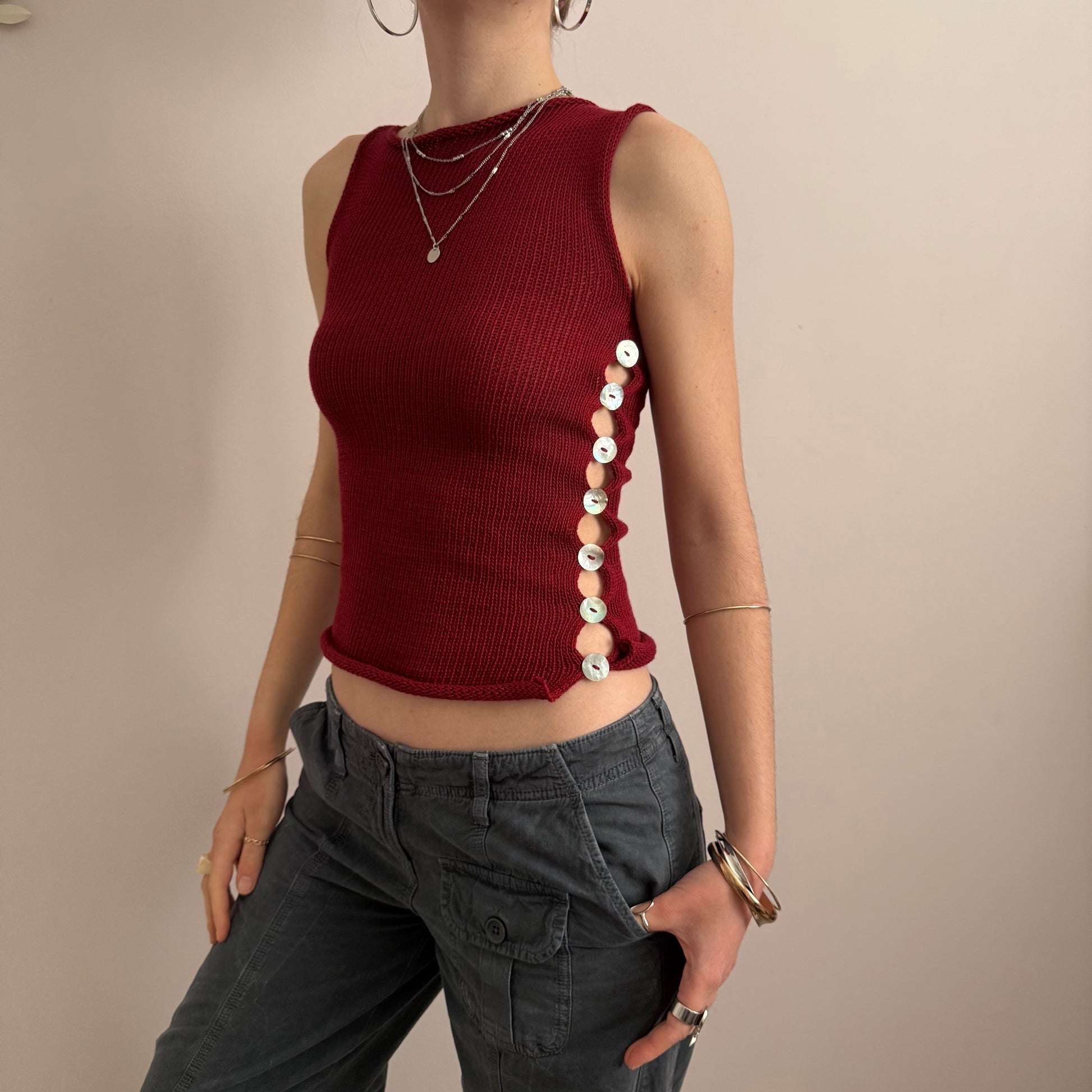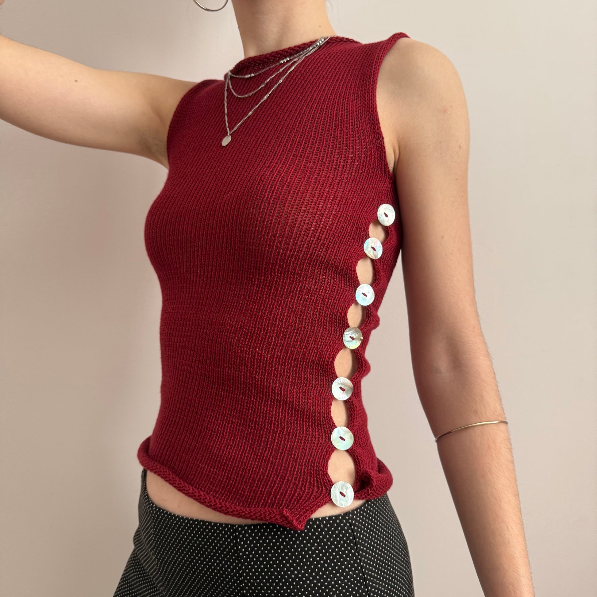 PEARL VEST DROP 2 ☆ Handmade knitted cotton tank / vest in a gorgeous dark red featuring an open side with mother of pearl buttons. Such a special piece ✨🍒