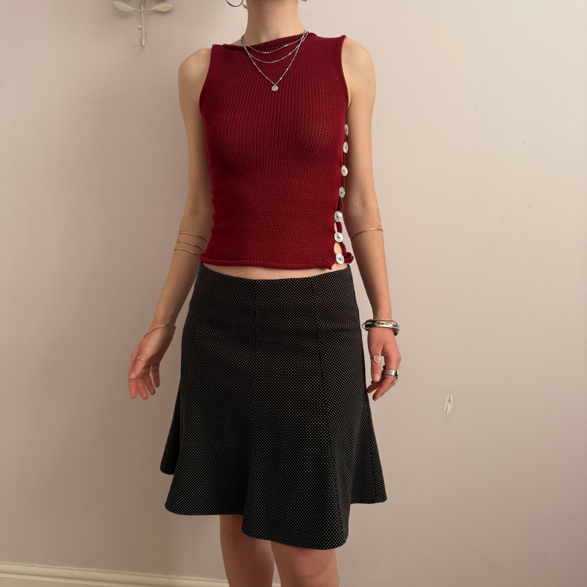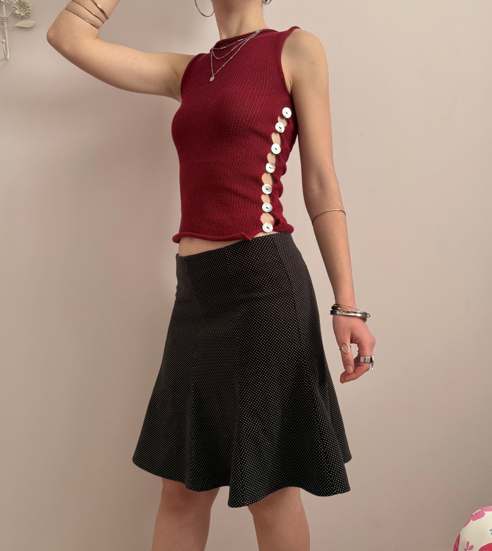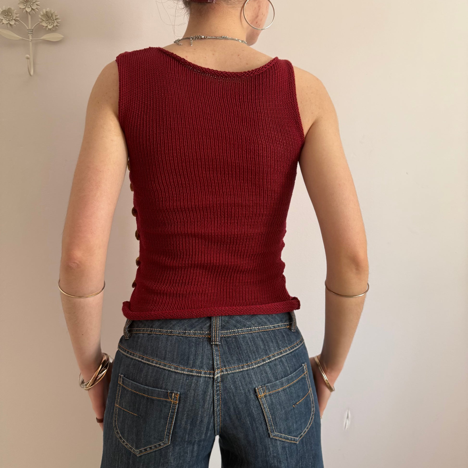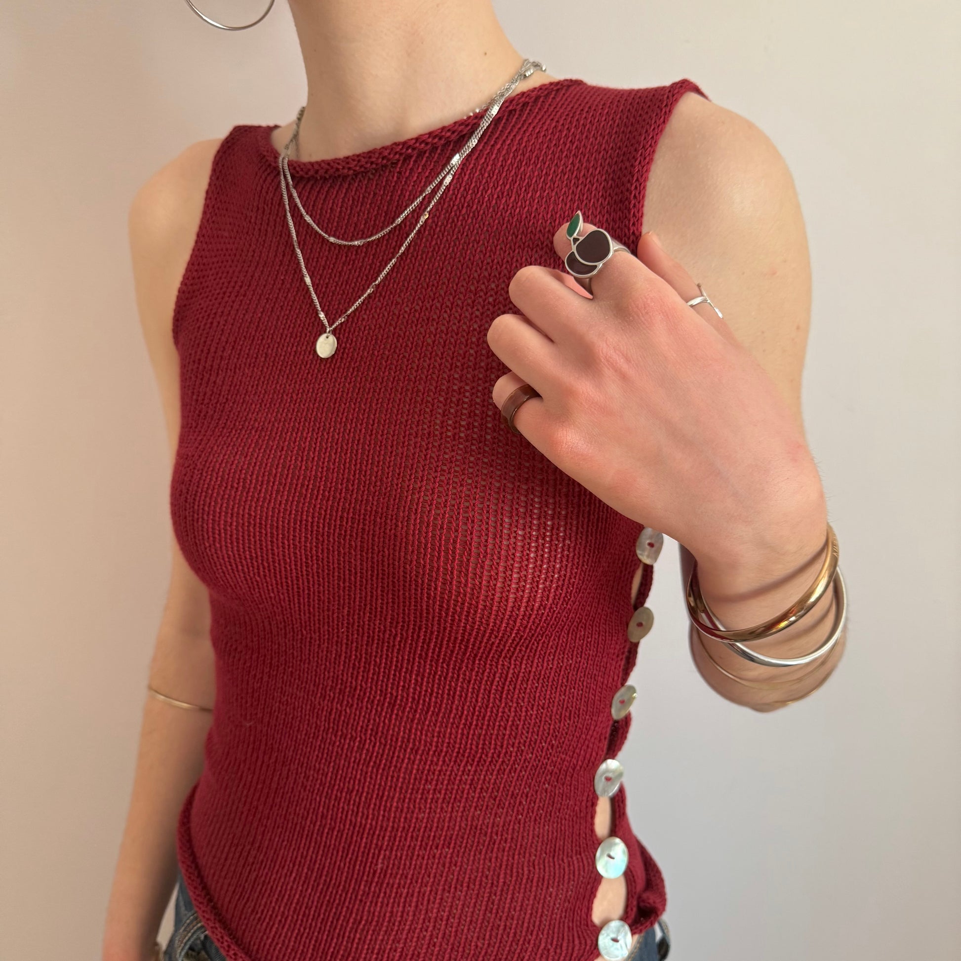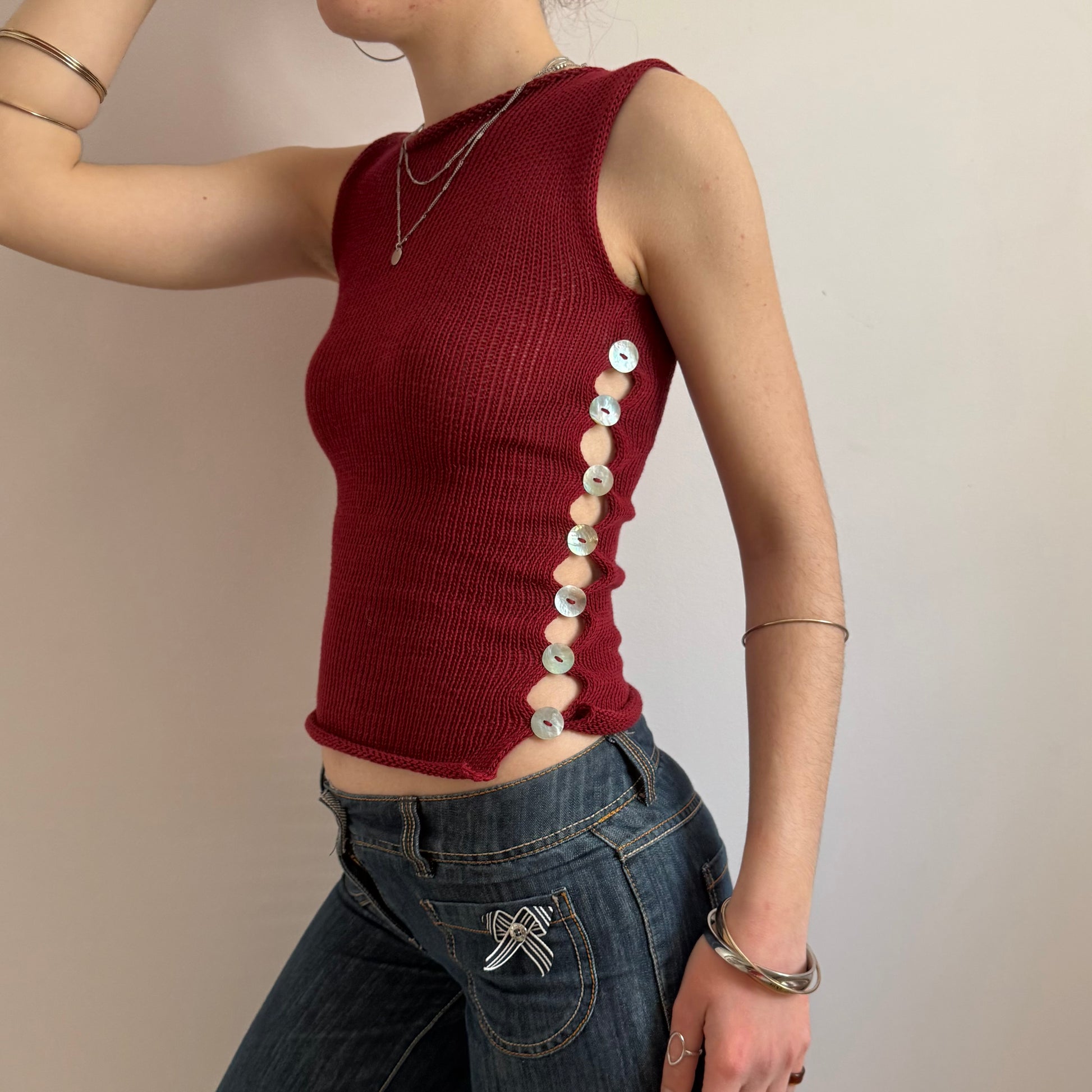 PEARL VEST DROP 2 ☆ Handmade knitted cotton tank / vest in a gorgeous dark red featuring an open side with mother of pearl buttons. Such a special piece ✨🍒