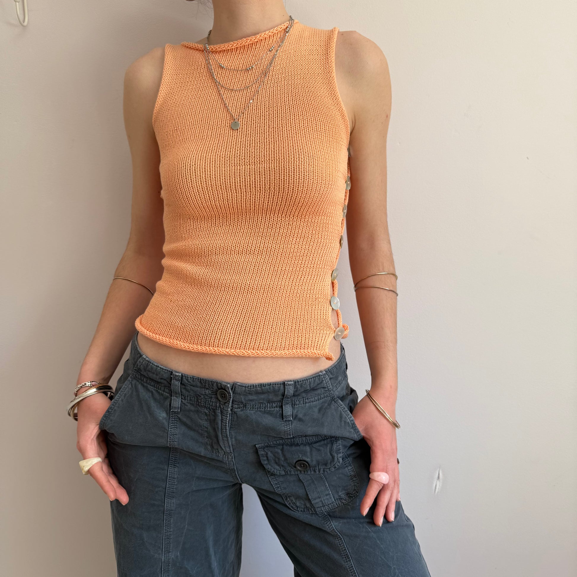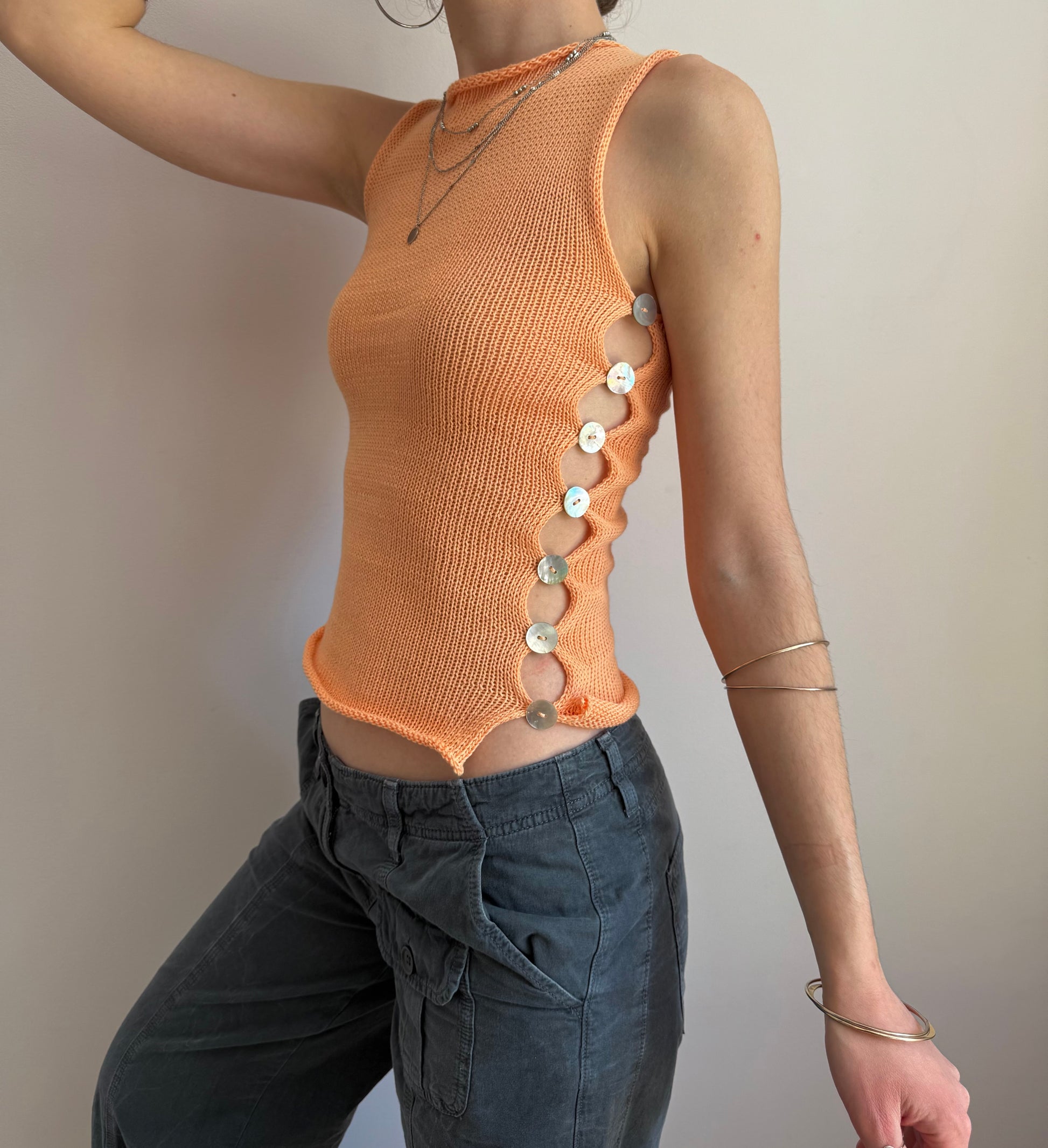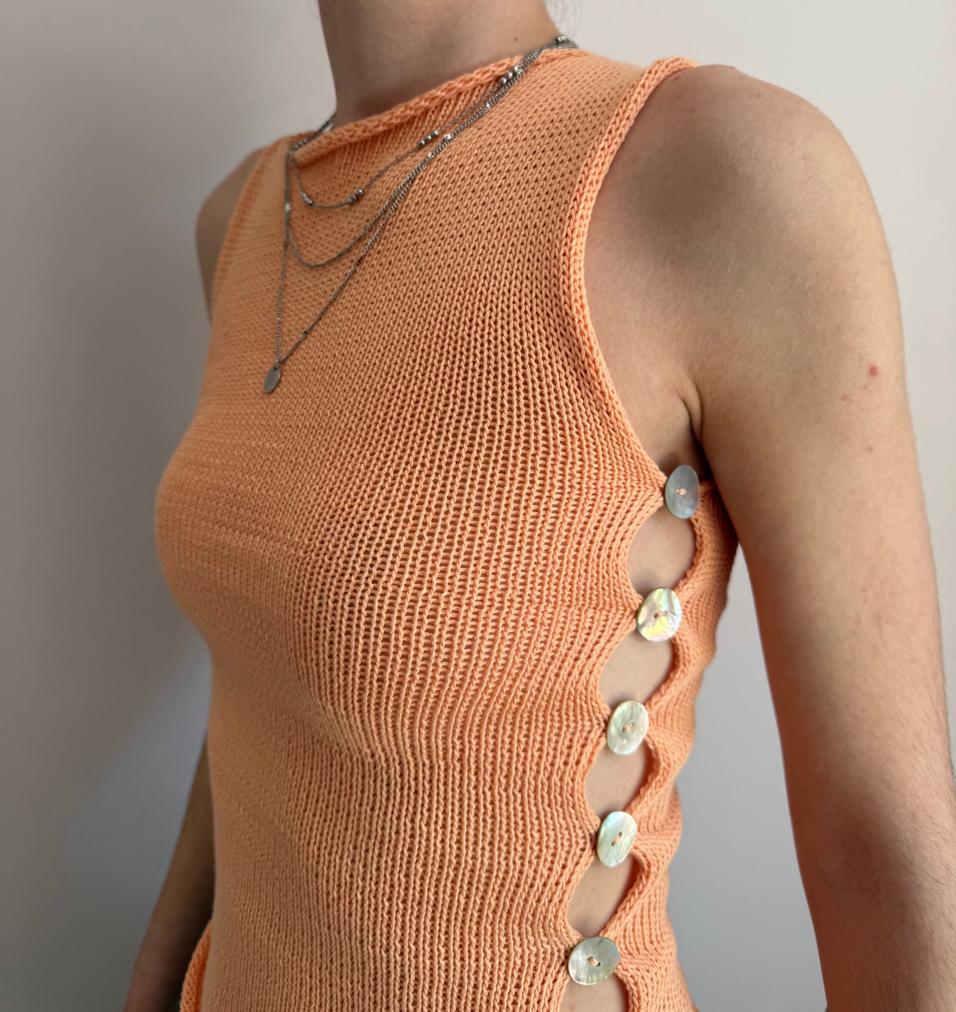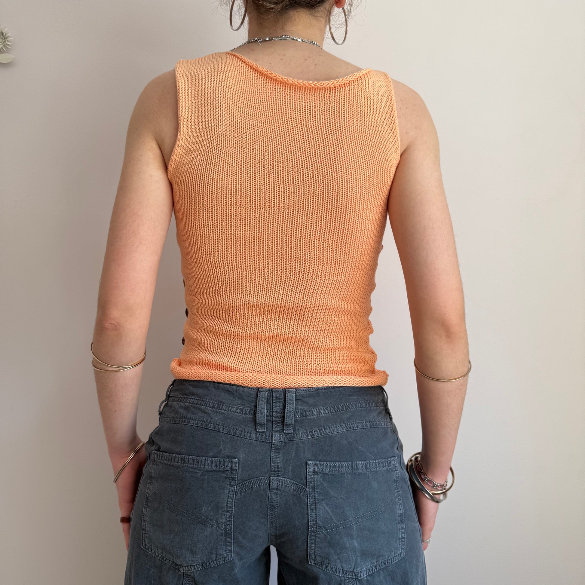 Handmade knitted cotton tank / vest in a gorgeous light orange featuring an open side with mother of pearl buttons. Such a special piece ✨🍑