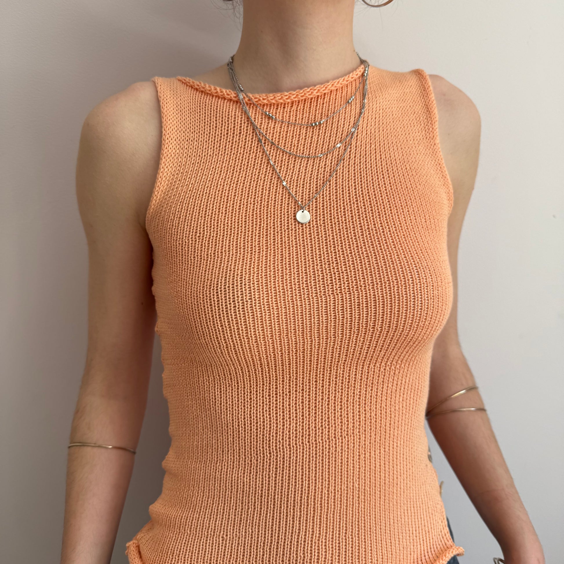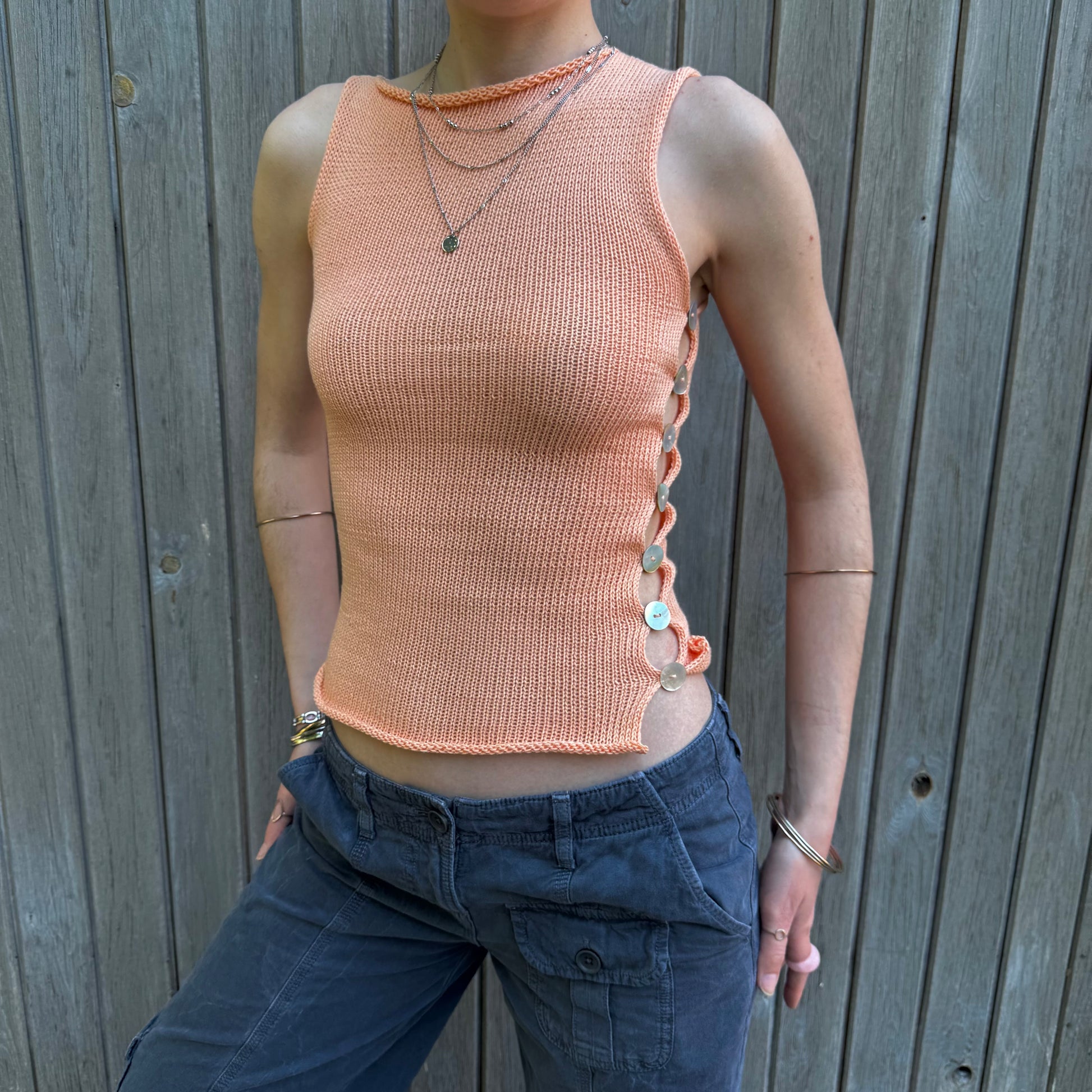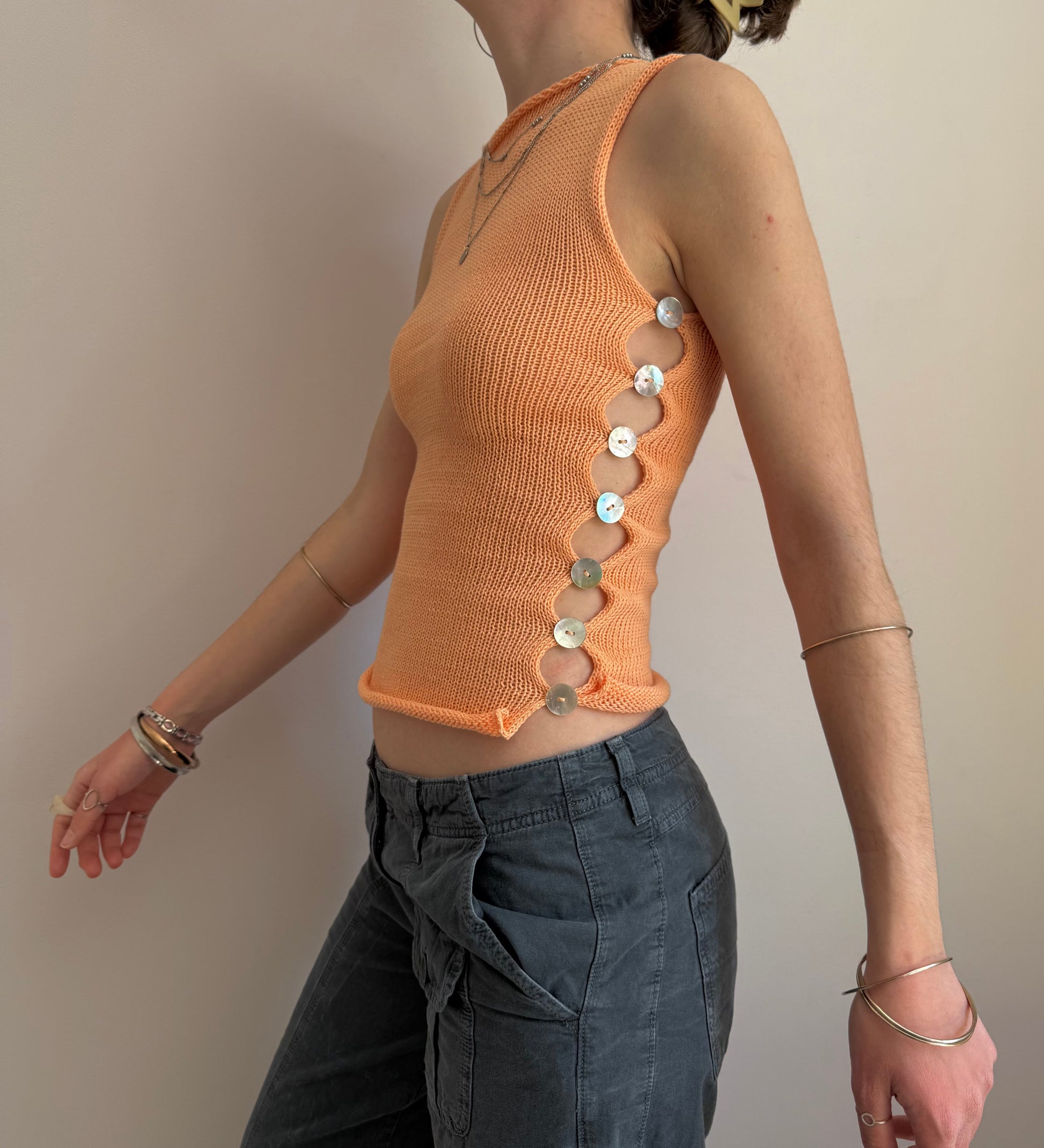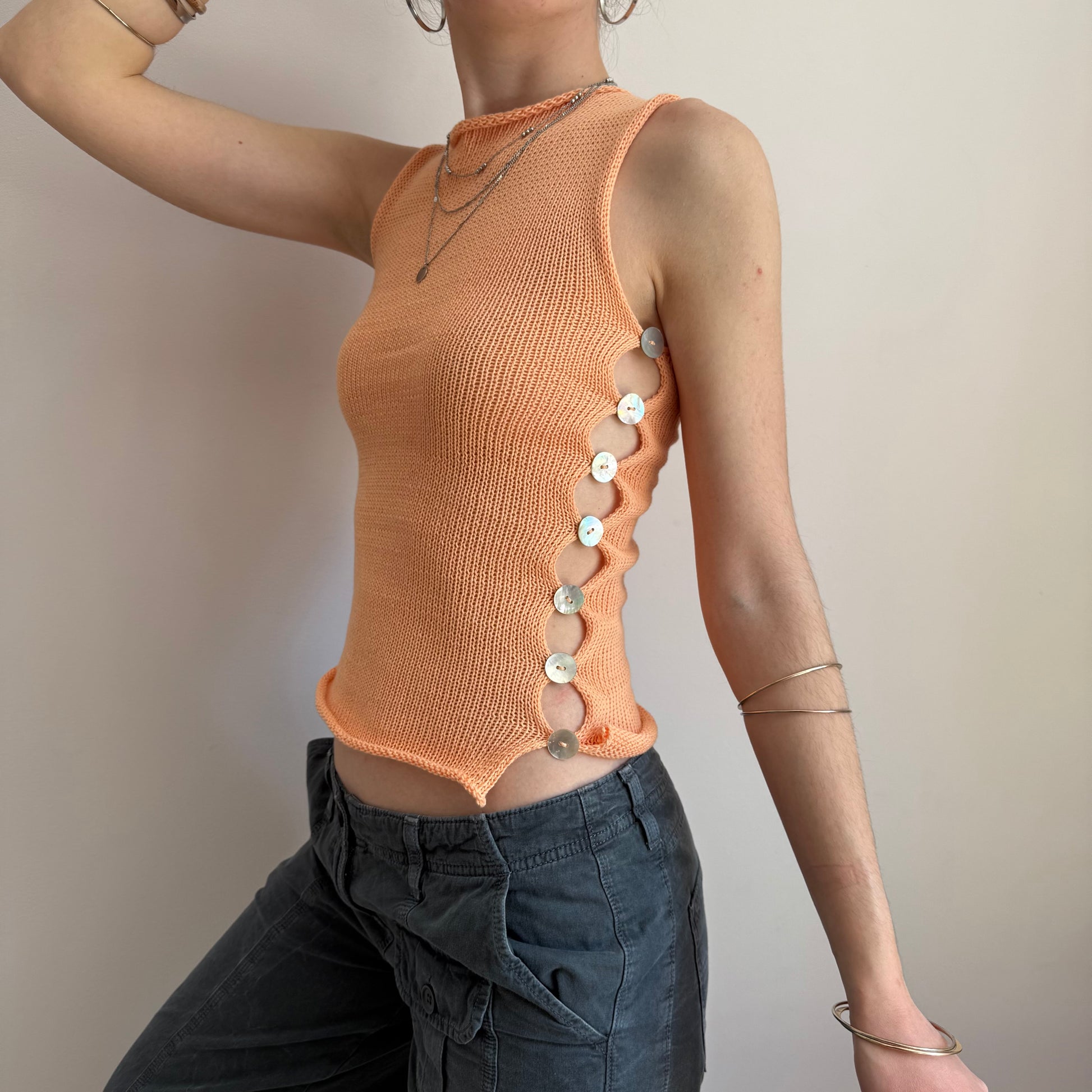 Handmade knitted cotton tank / vest in a gorgeous light orange featuring an open side with mother of pearl buttons. Such a special piece ✨🍑