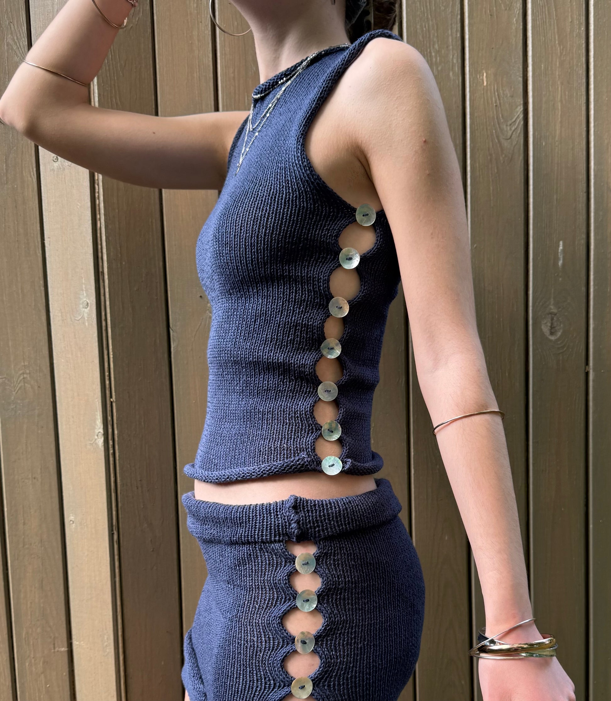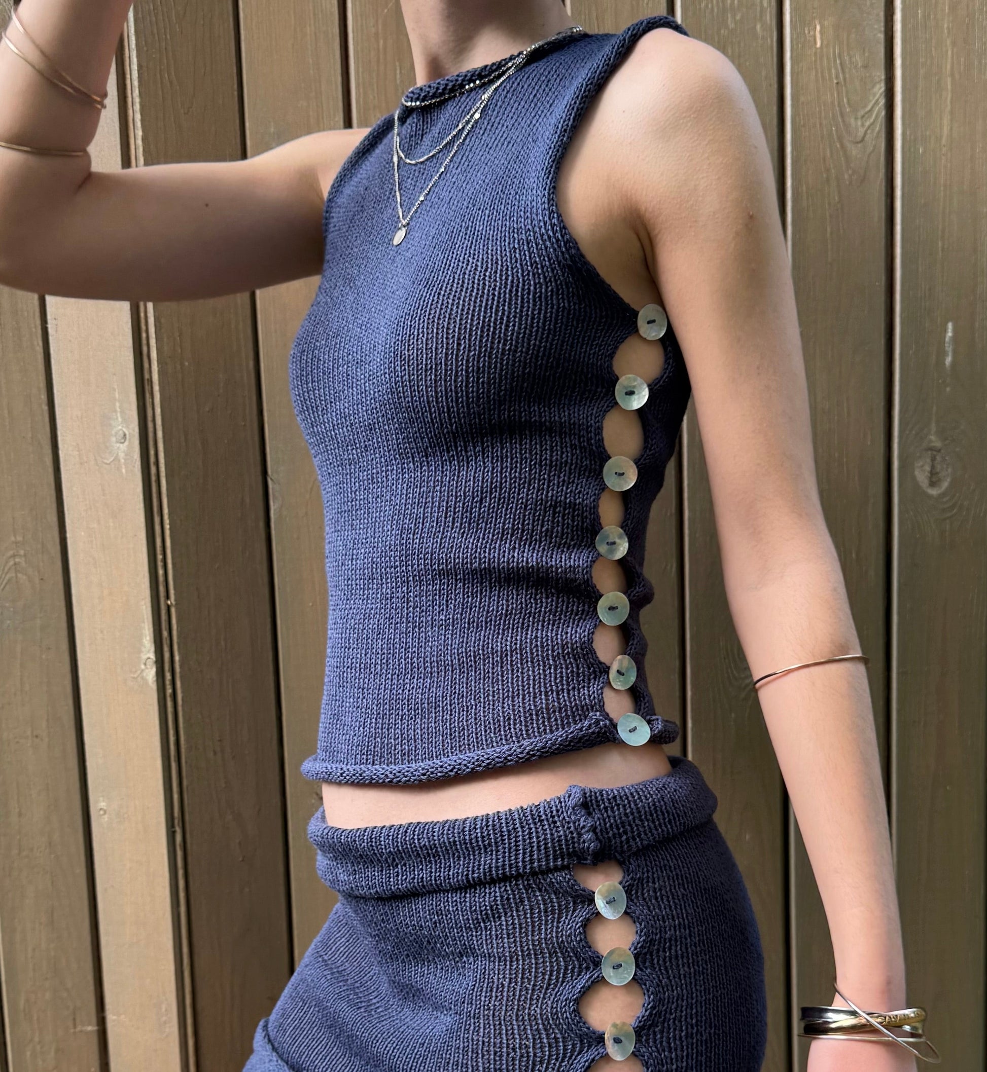 Introducing our newest range! ⭐️ Handmade knitted cotton tank / vest in navy blue featuring an open side with mother of pearl buttons. Such a special piece ✨