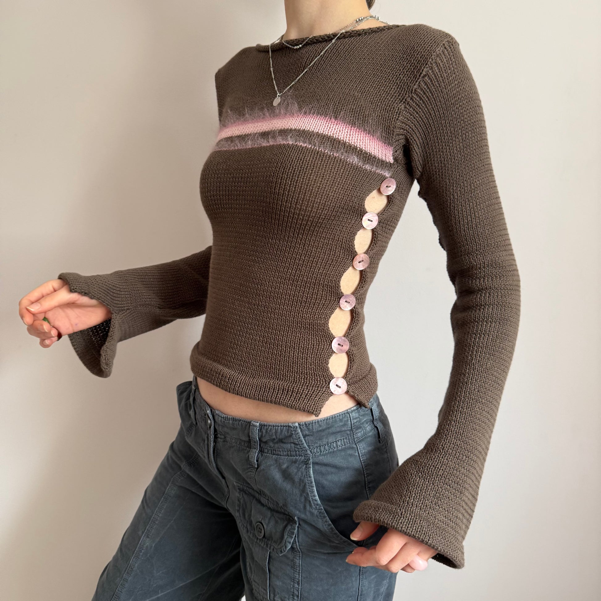 New in for AW25 ⭑ Handmade knitted flares sleeve jumper in a gorgeous mocha brown colour. Features two open sides with baby pink mother of pearl buttons and fluffy mohair stripes. Such a special piece ✨