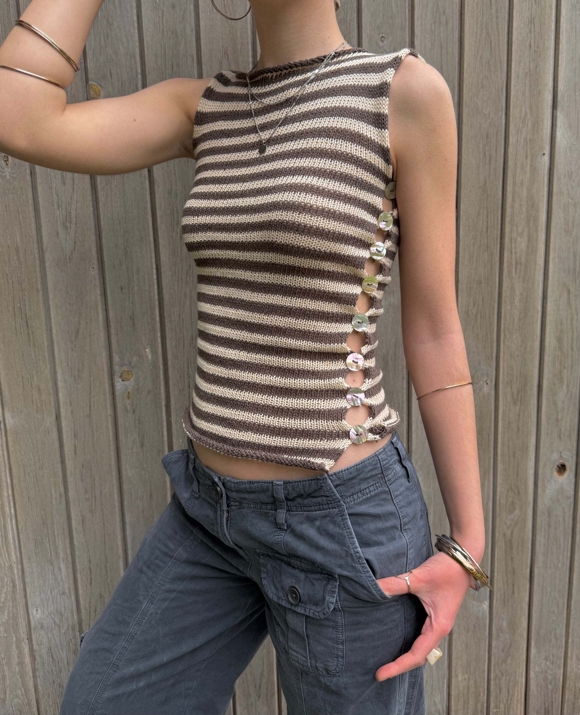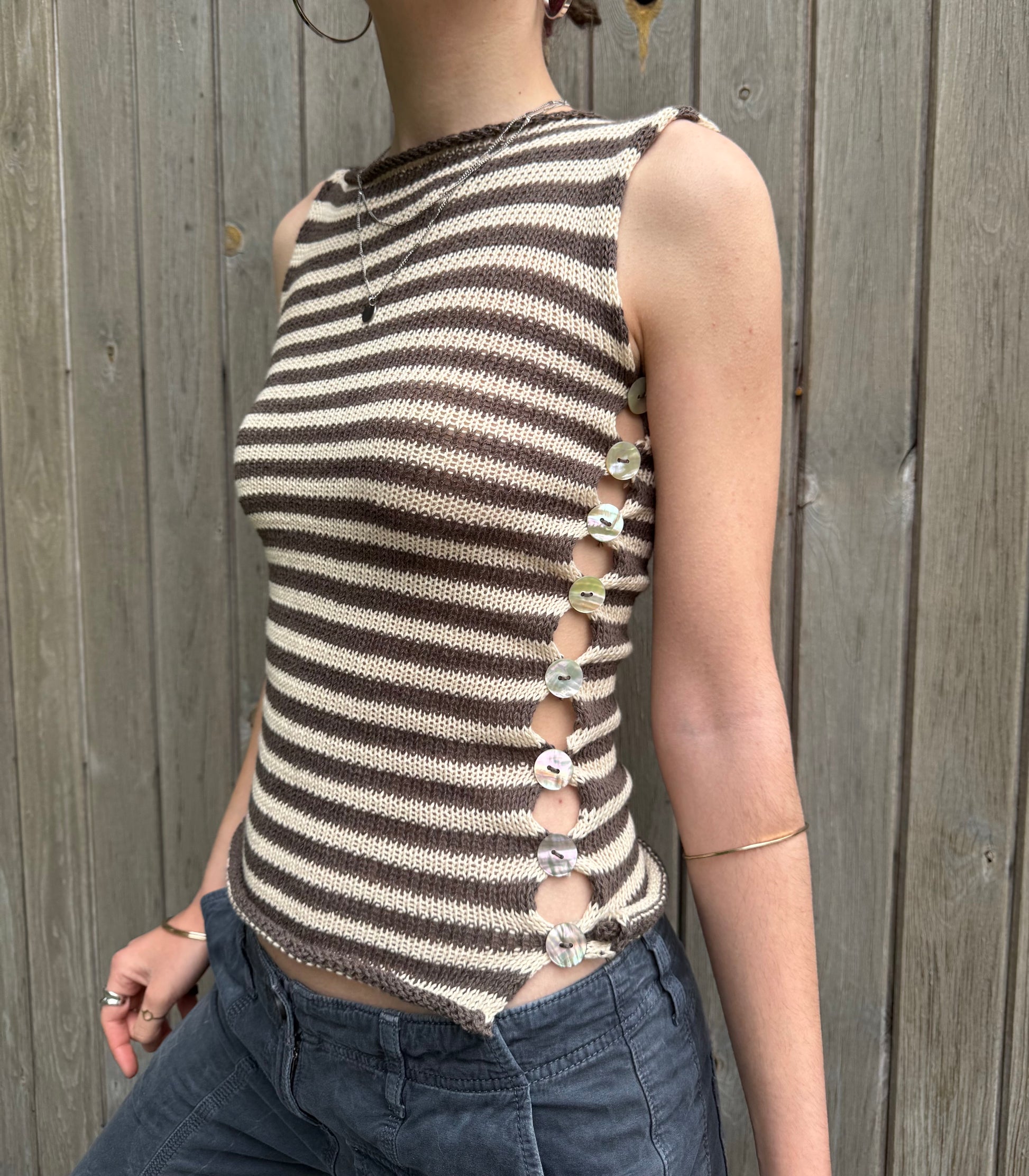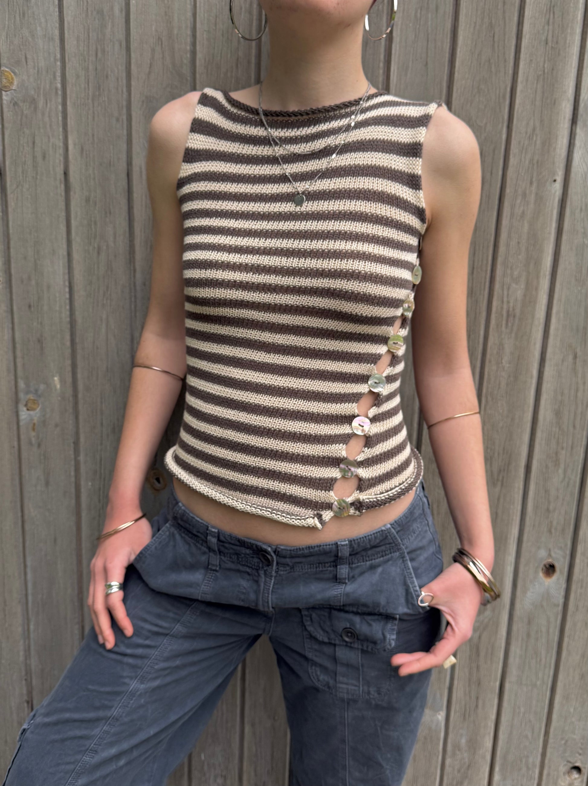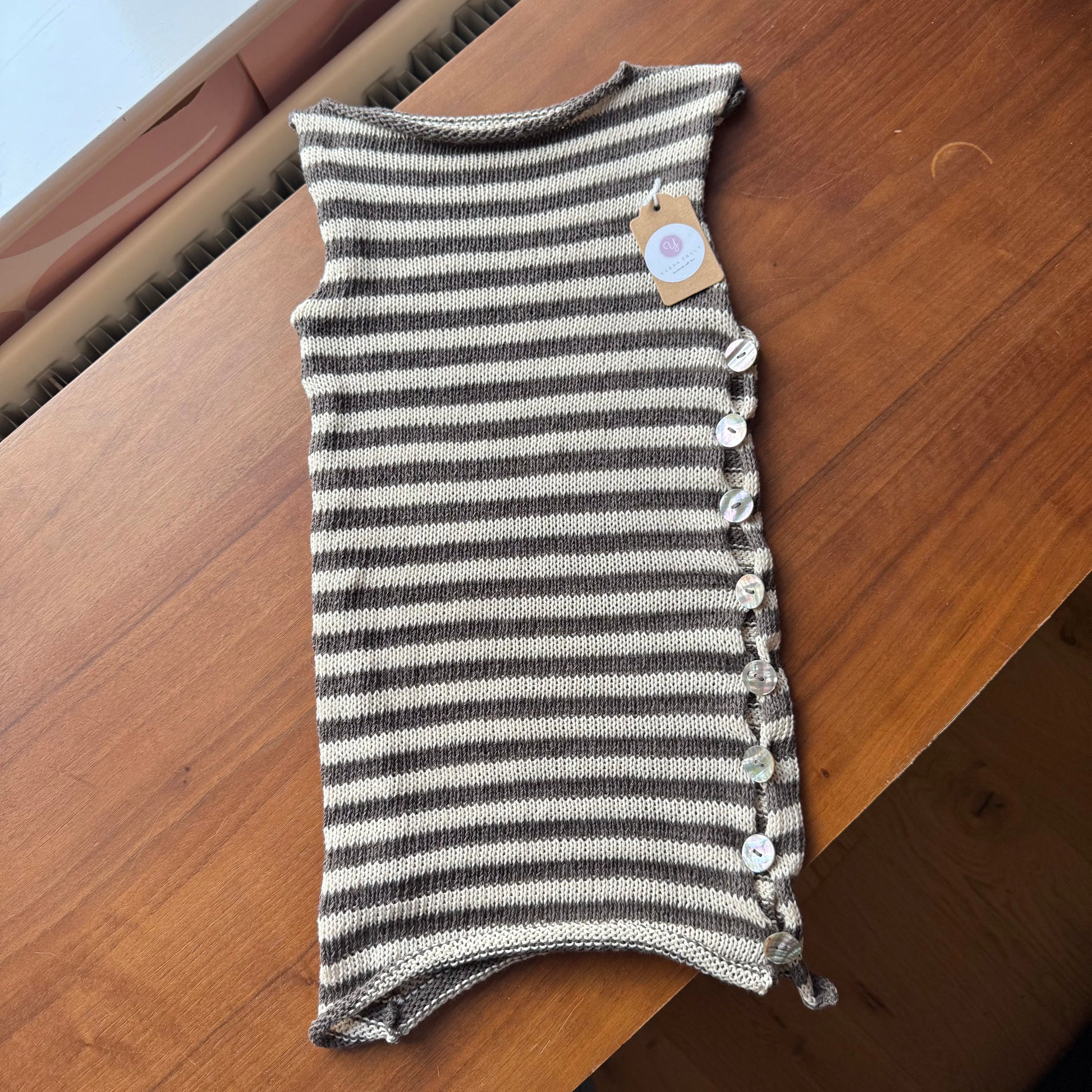 Handmade knitted cotton tank / vest in a gorgeous stripy pattern featuring an open side and the most special, irridescent abalone shell buttons. 🐚 Such a 1 of a kind piece ✨