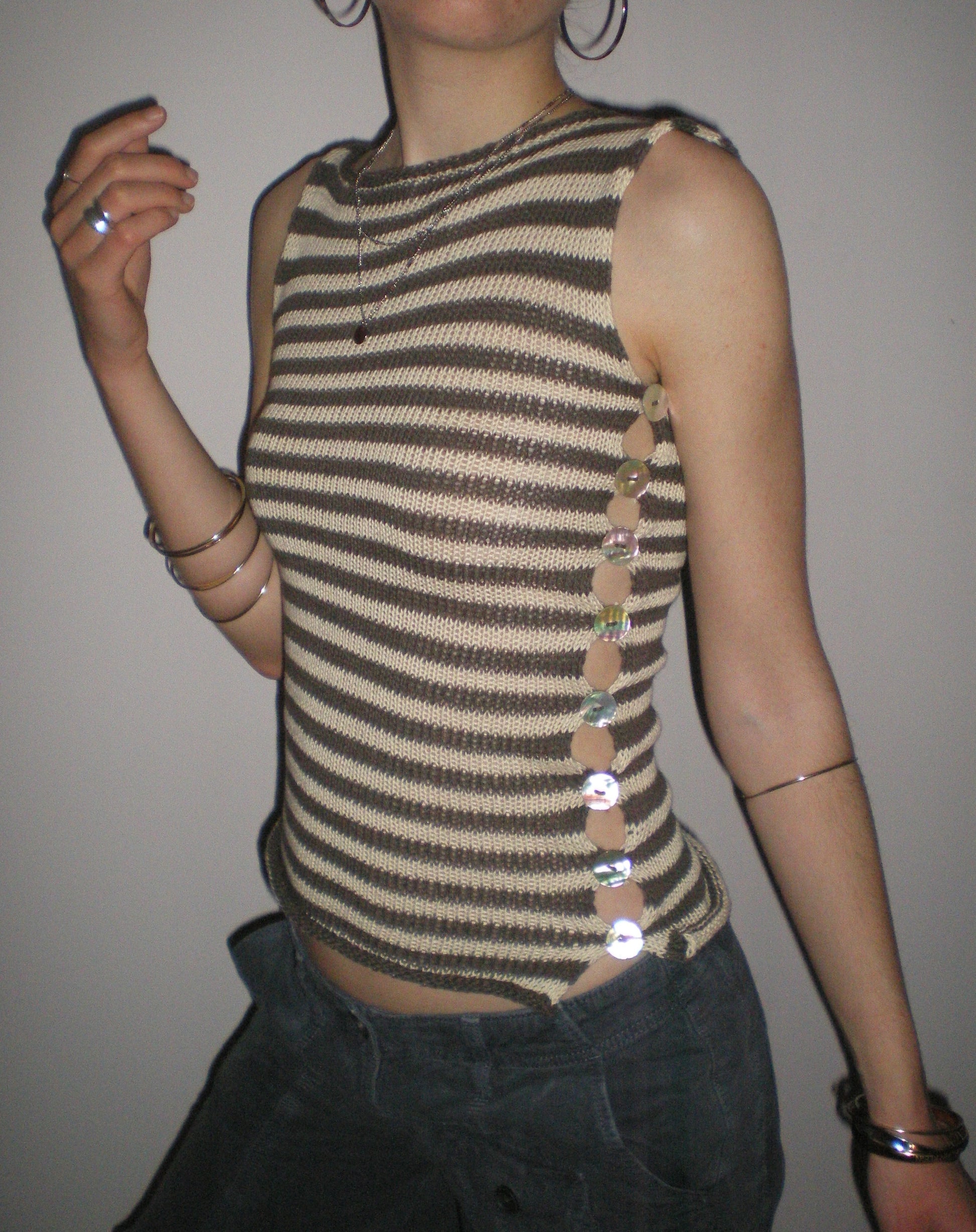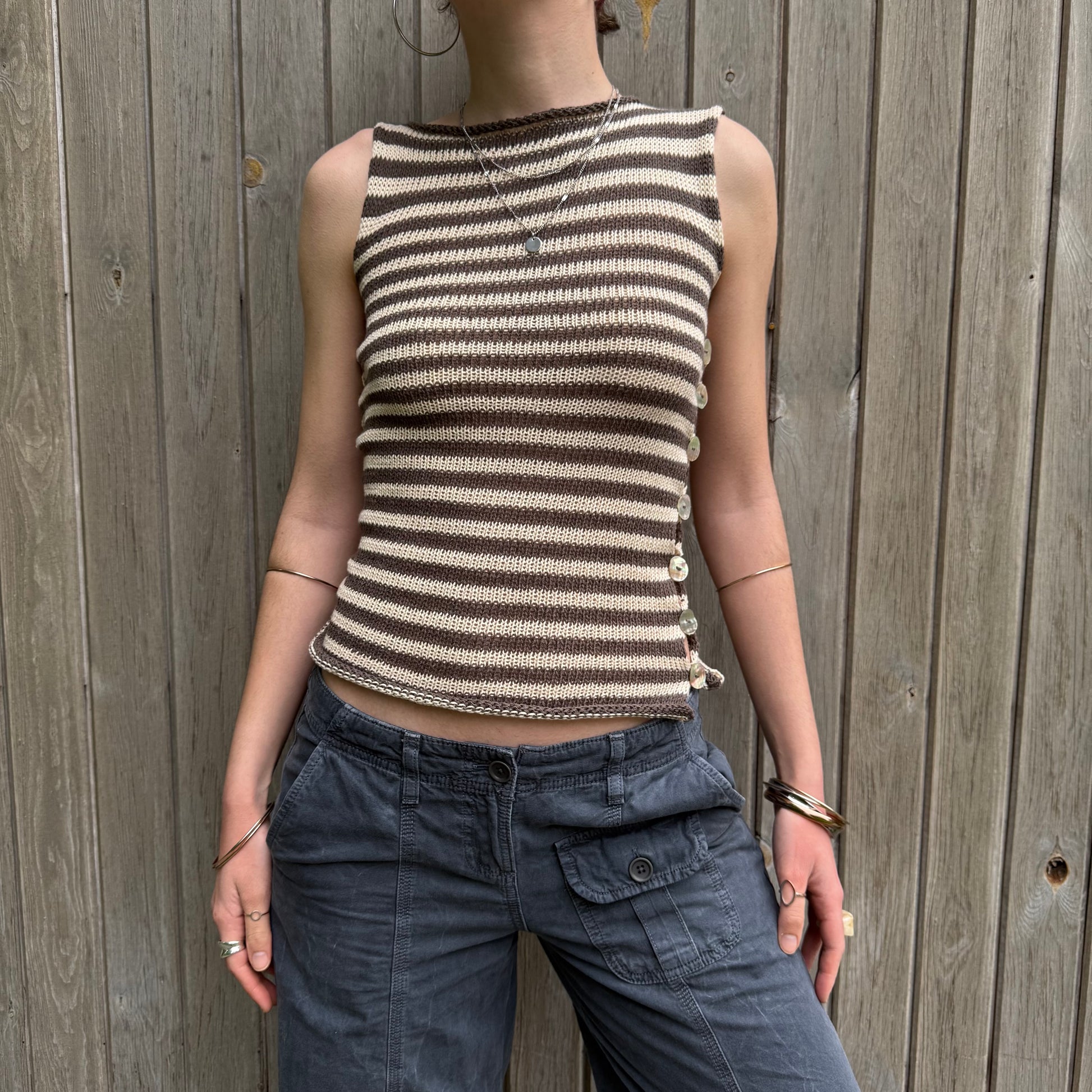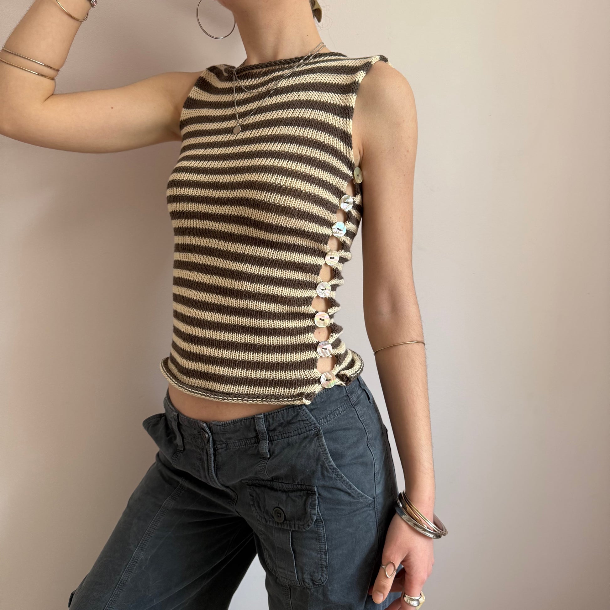 Handmade knitted cotton tank / vest in a gorgeous stripy pattern featuring an open side and the most special, irridescent abalone shell buttons. 🐚 Such a 1 of a kind piece ✨
