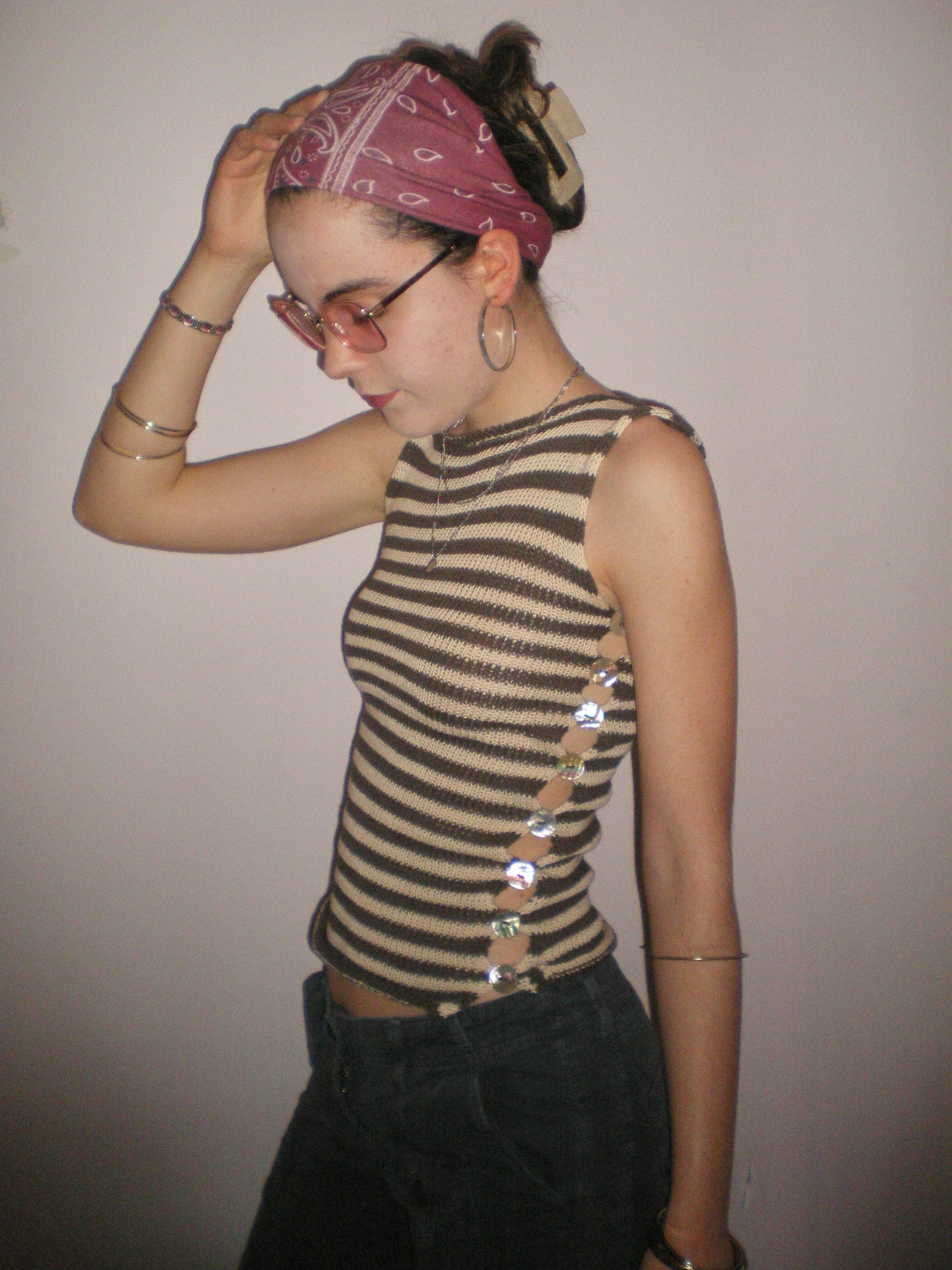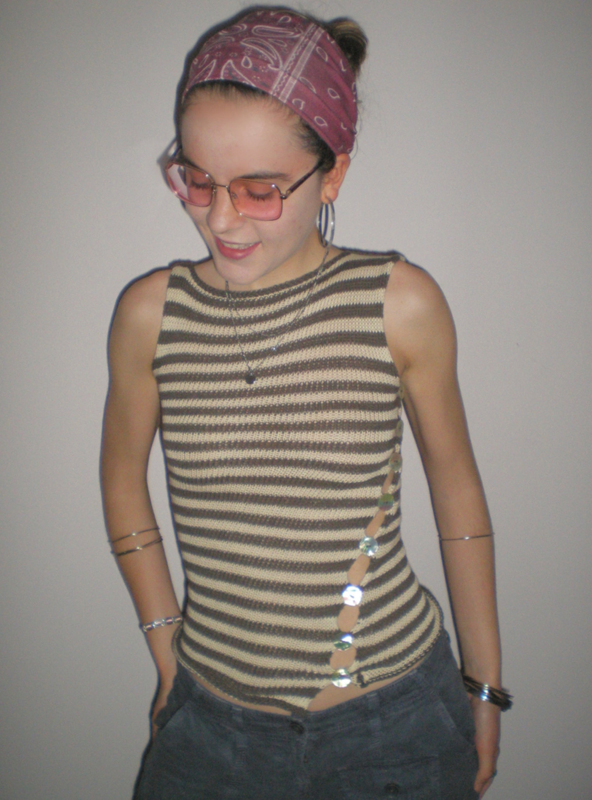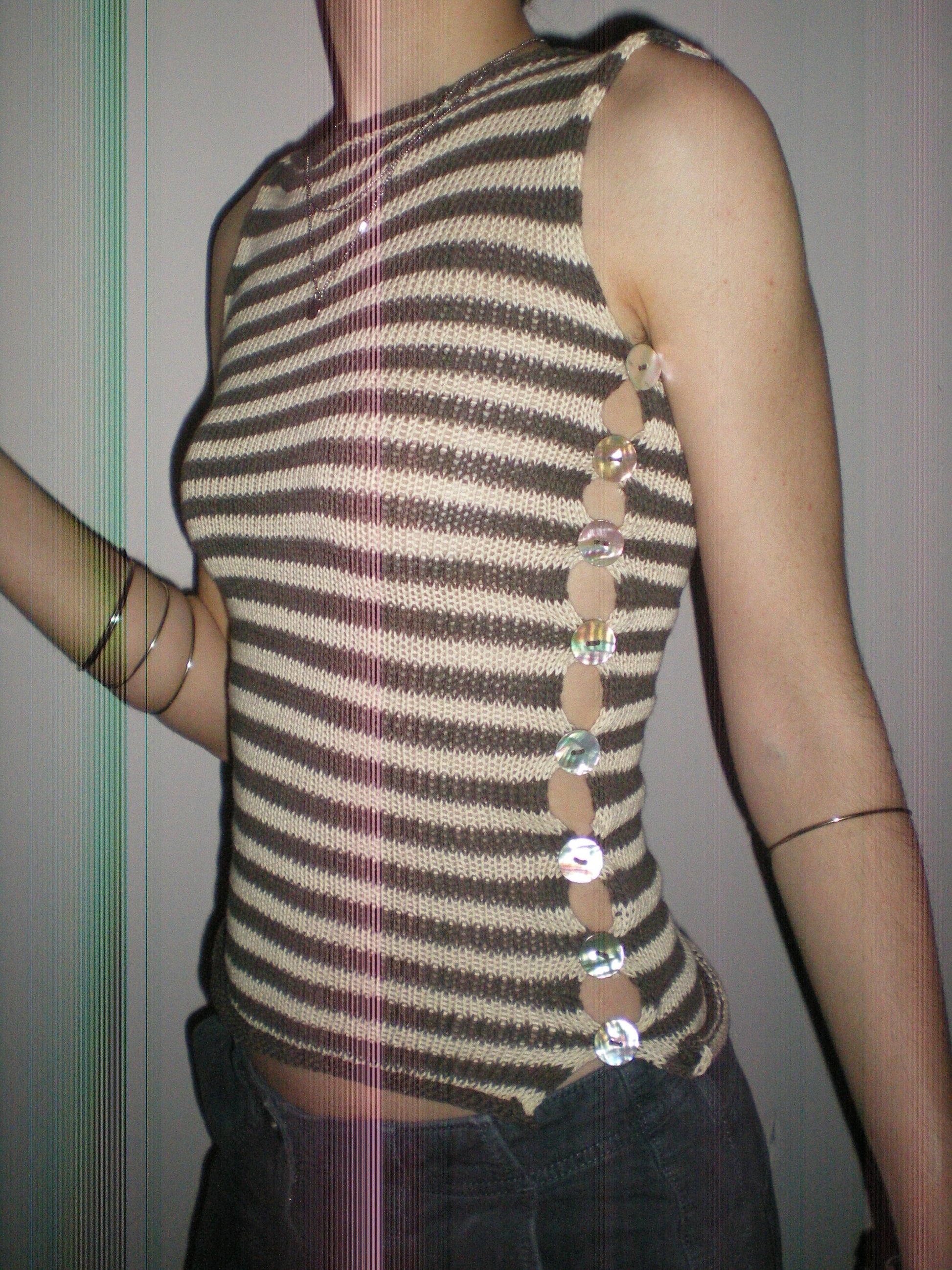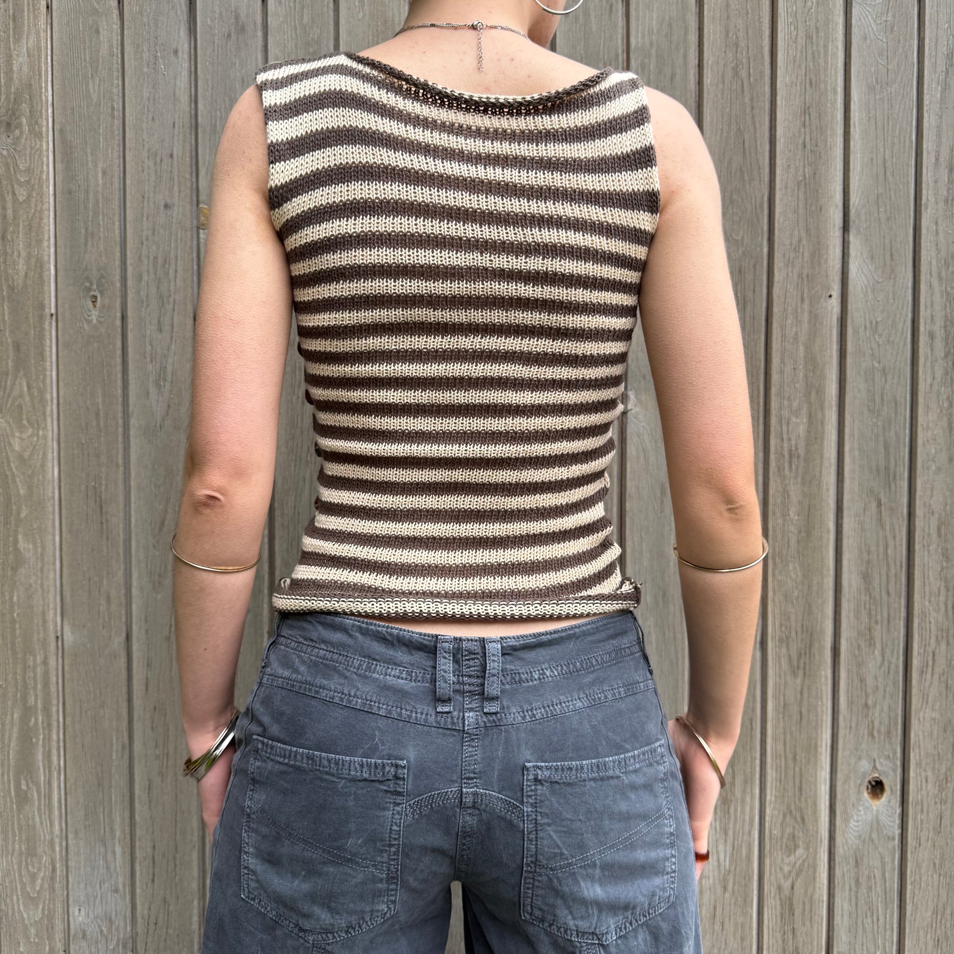 Handmade knitted cotton tank / vest in a gorgeous stripy pattern featuring an open side and the most special, irridescent abalone shell buttons. 🐚 Such a 1 of a kind piece ✨