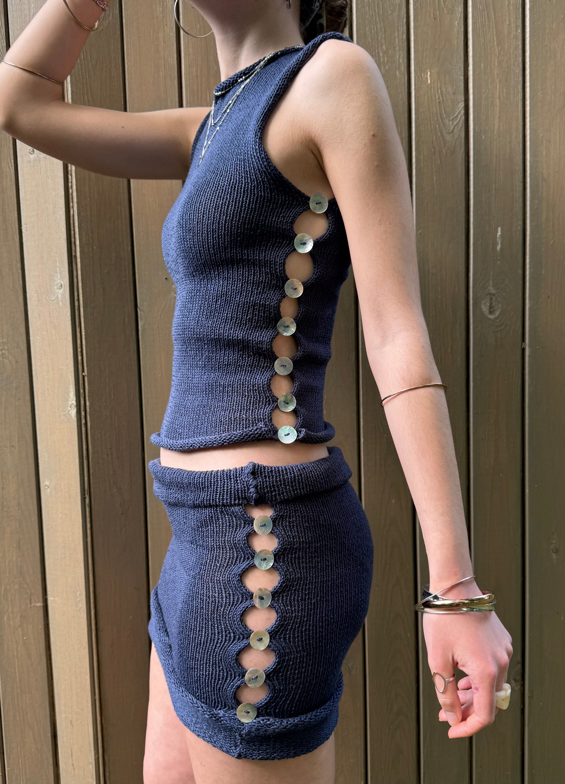The Pearl Set in navy - handmade knitted vest with mother of pearl buttons & matching mini skirt