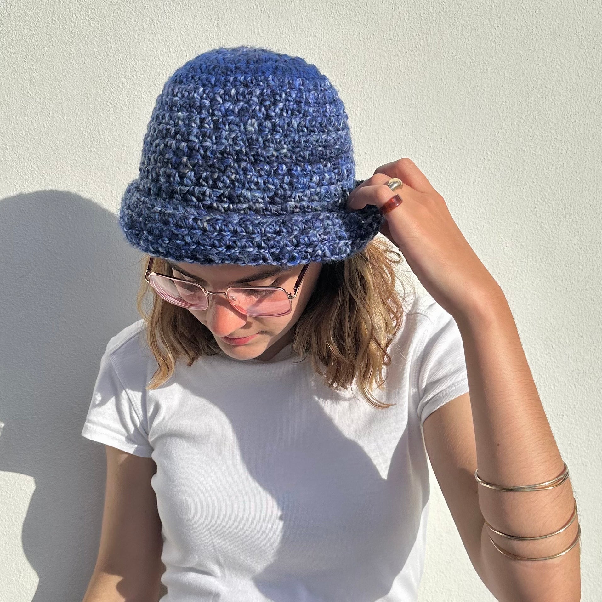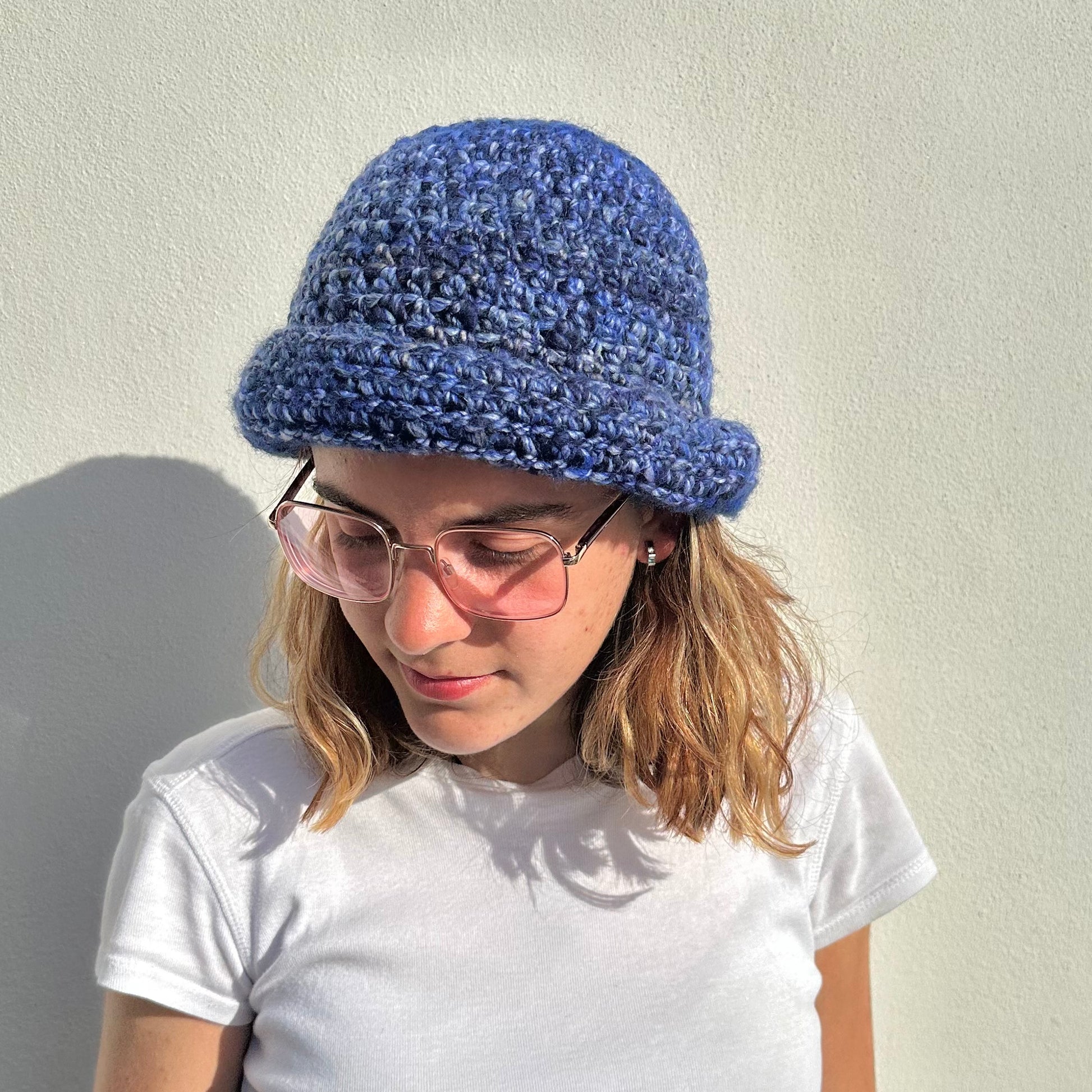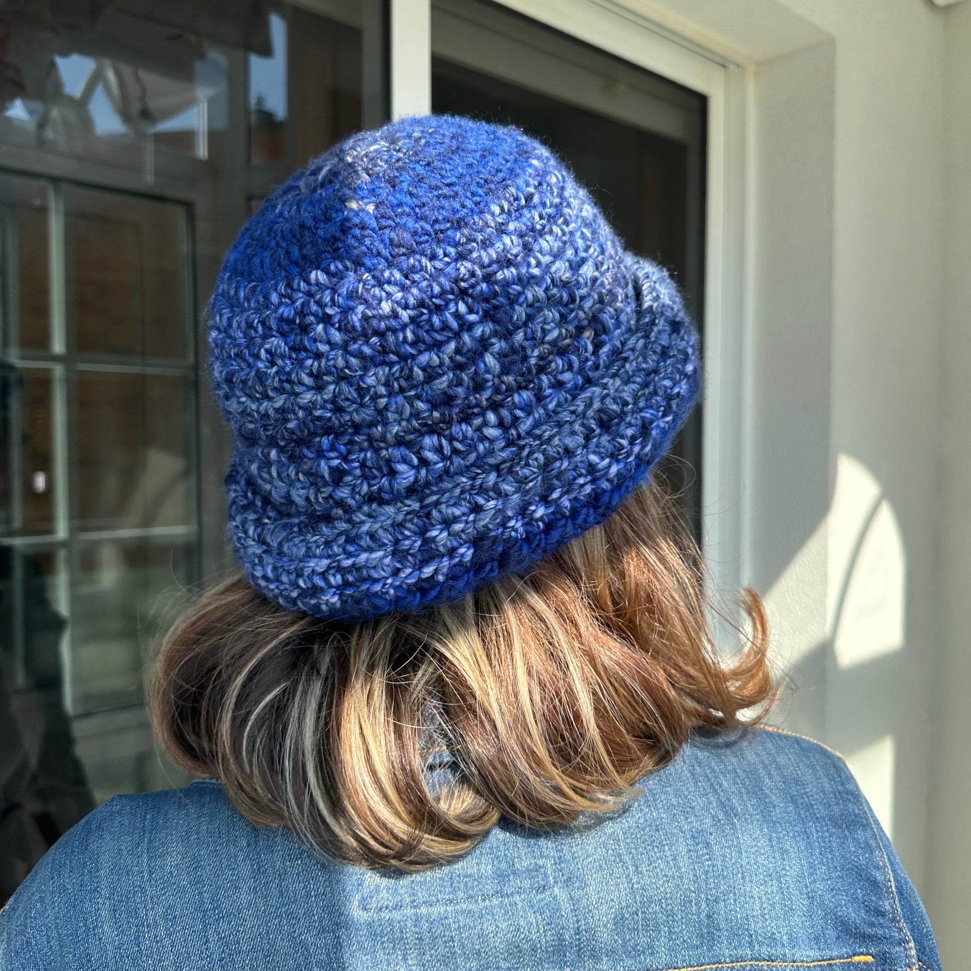 Handmade blue chunky crochet bowler hat