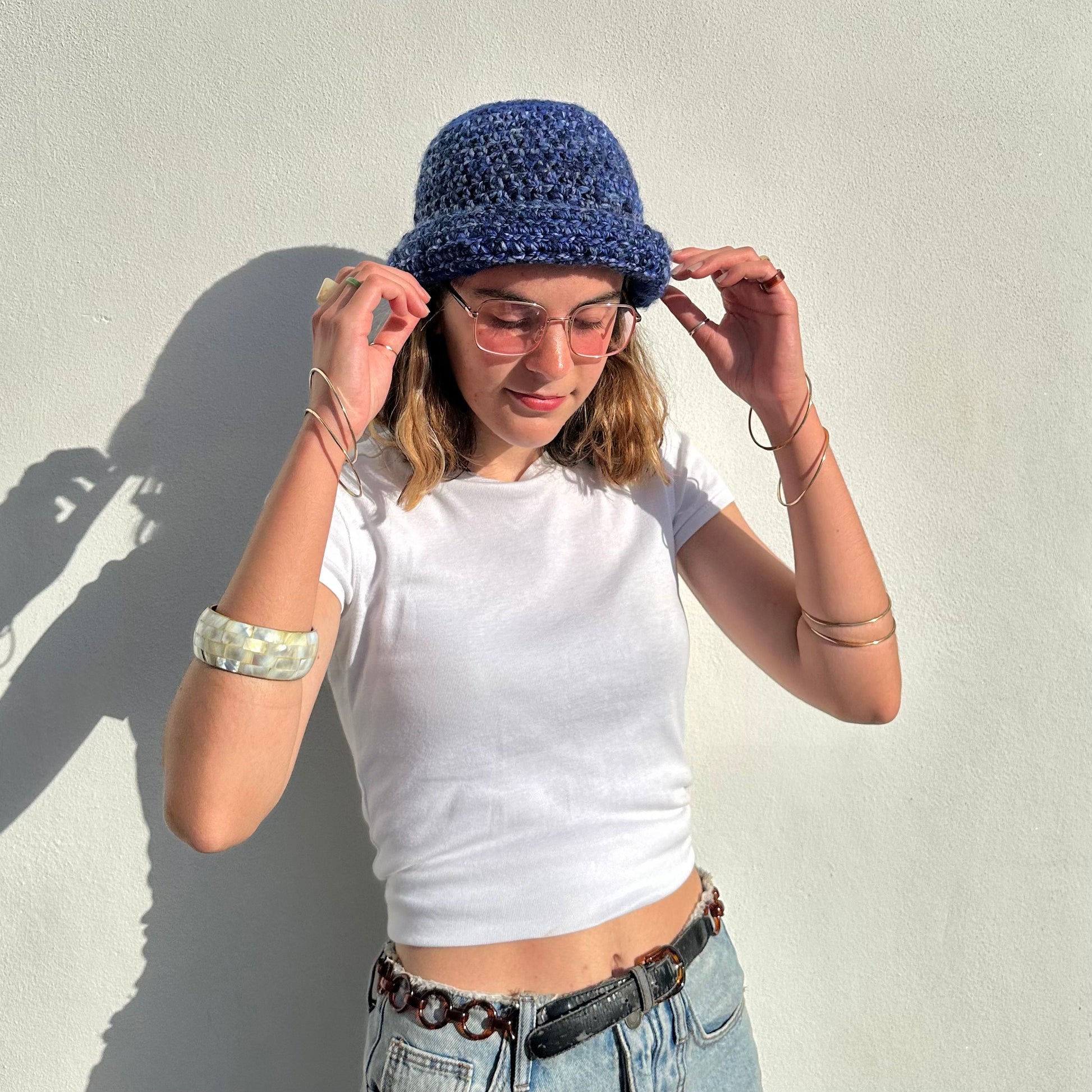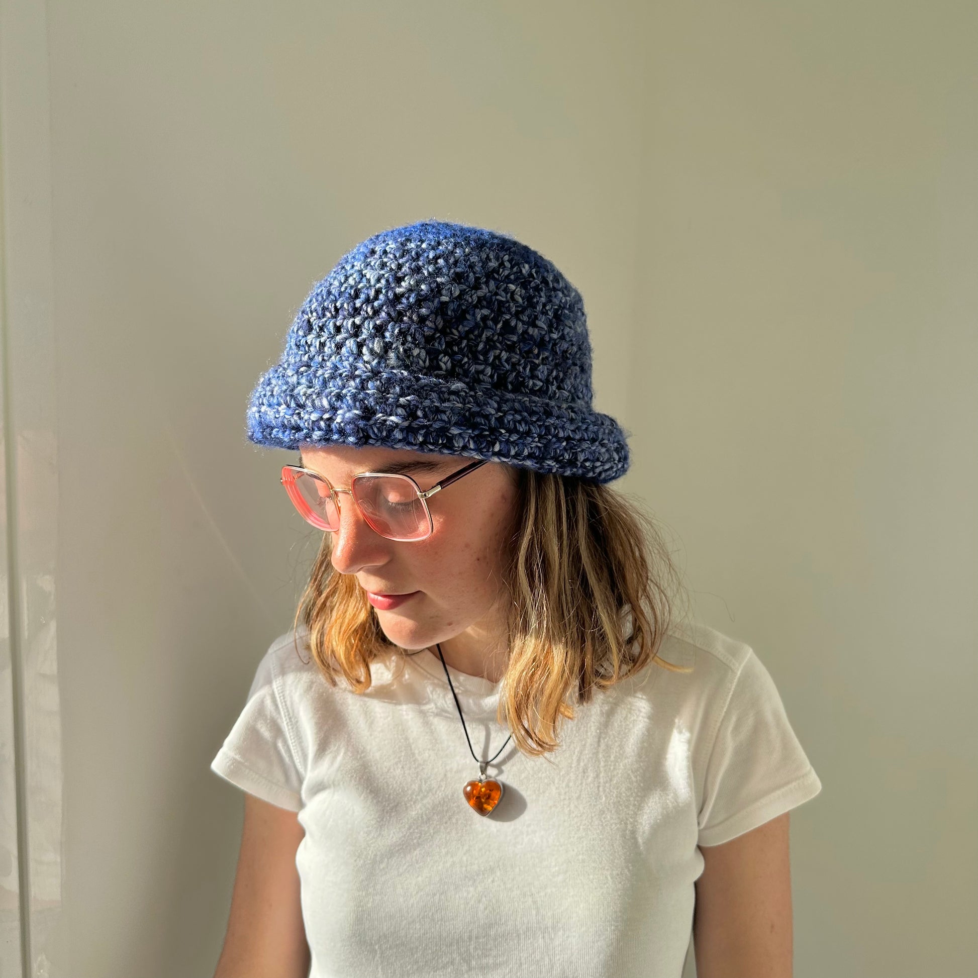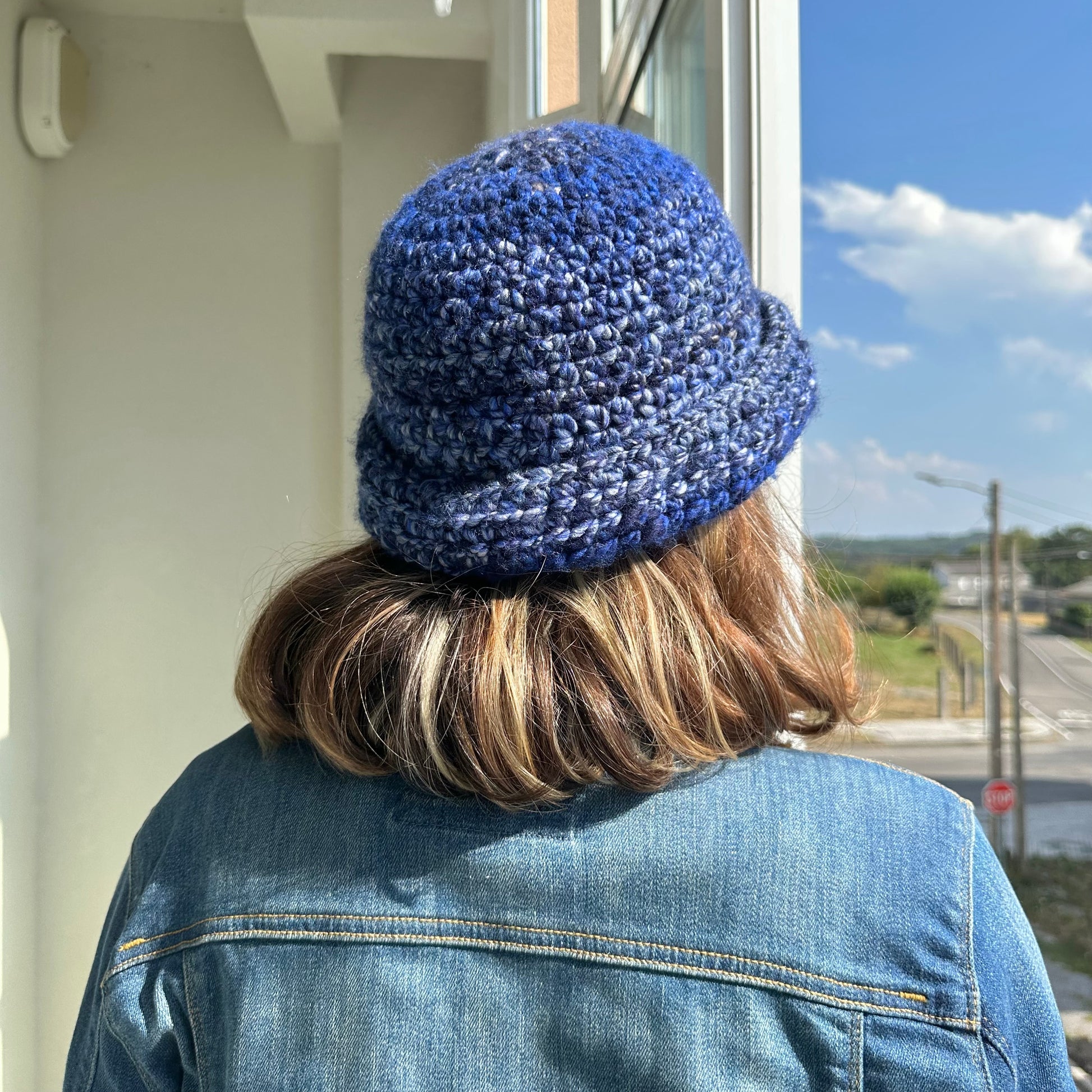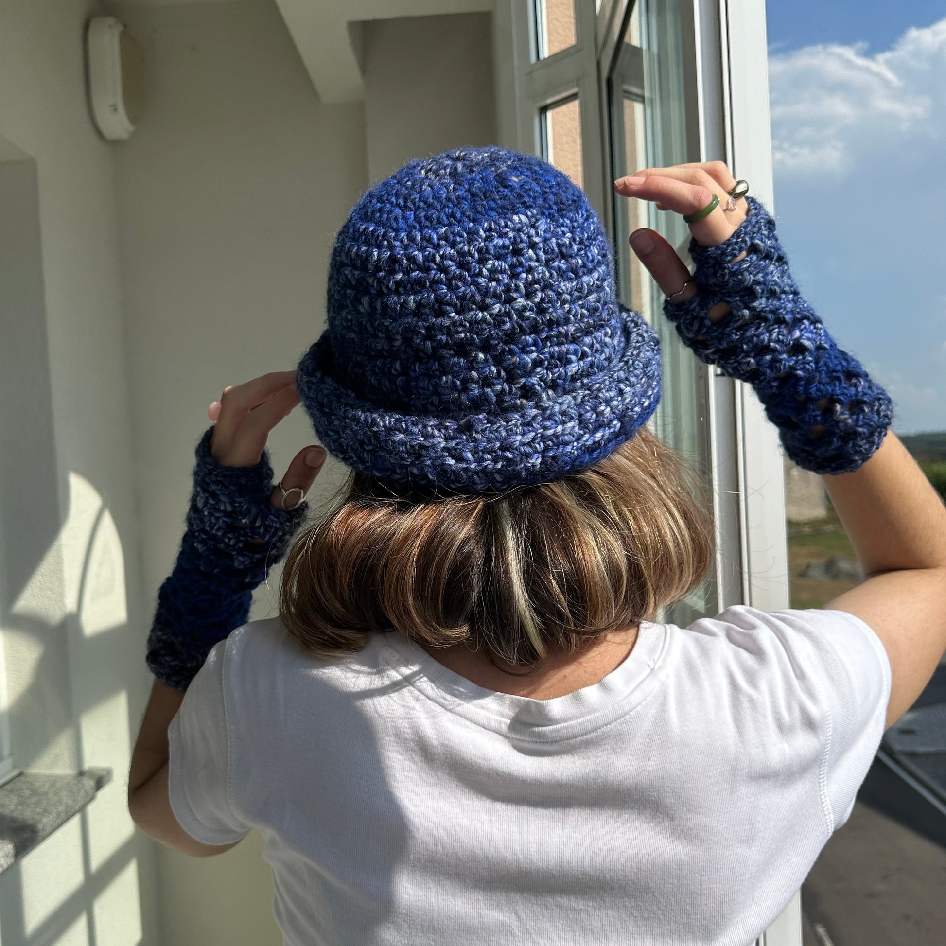 Handmade blue chunky crochet bowler hat