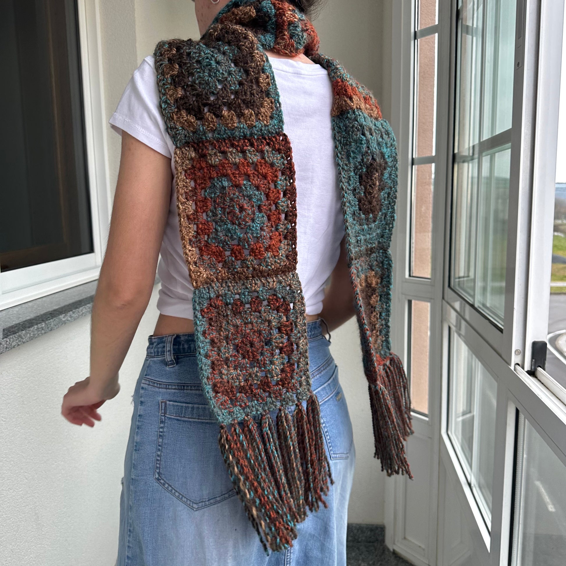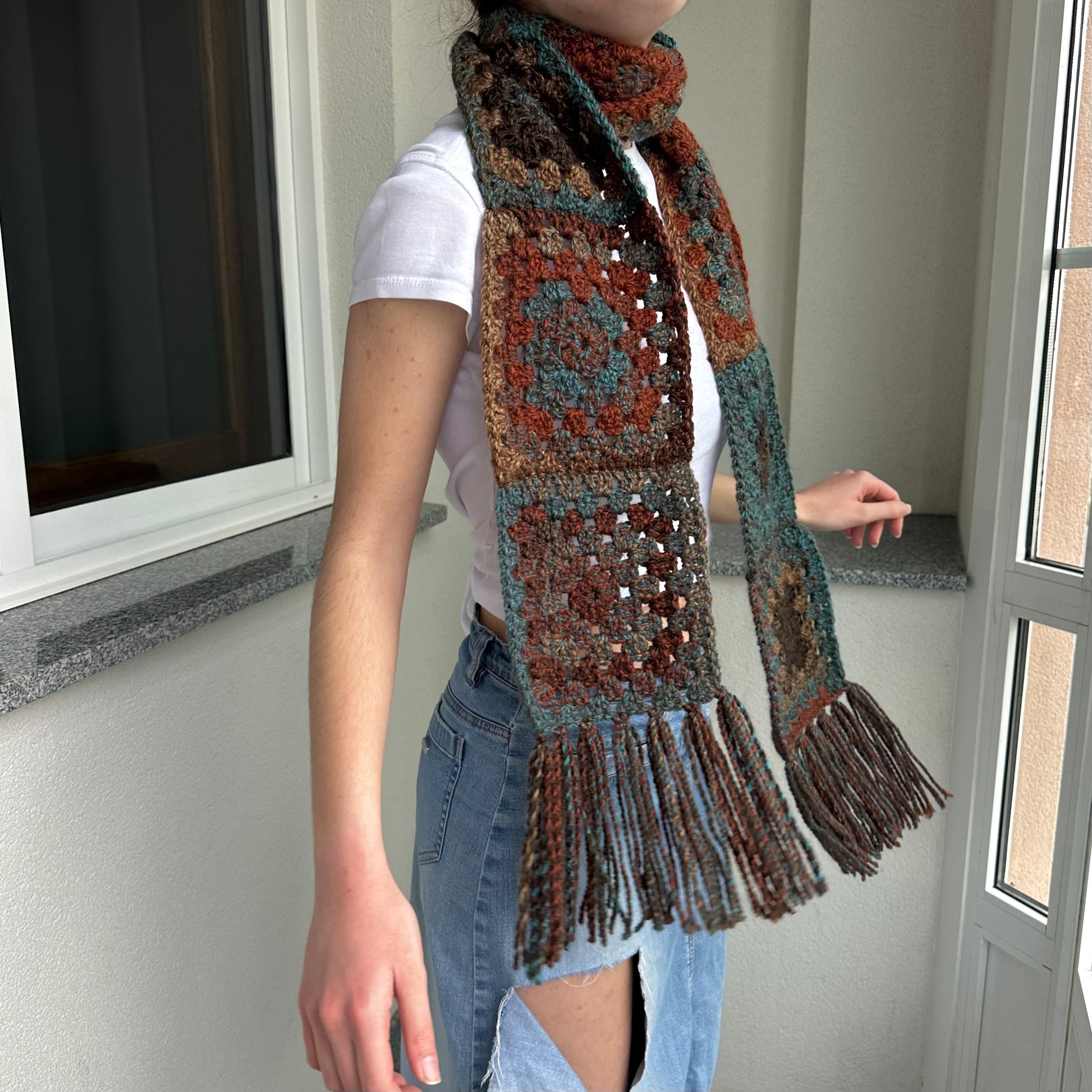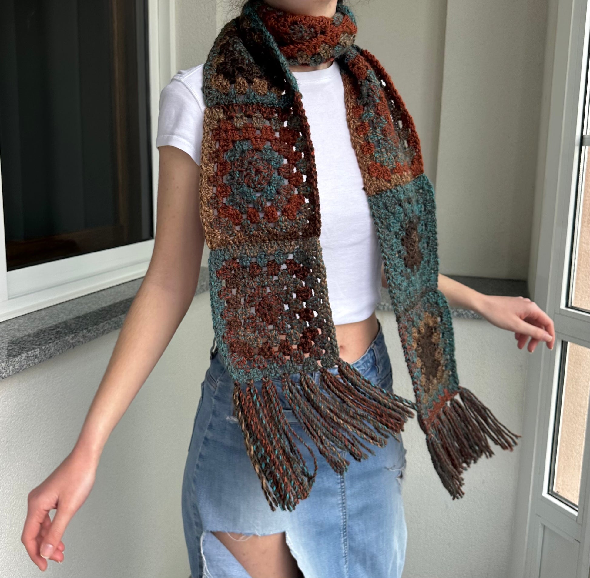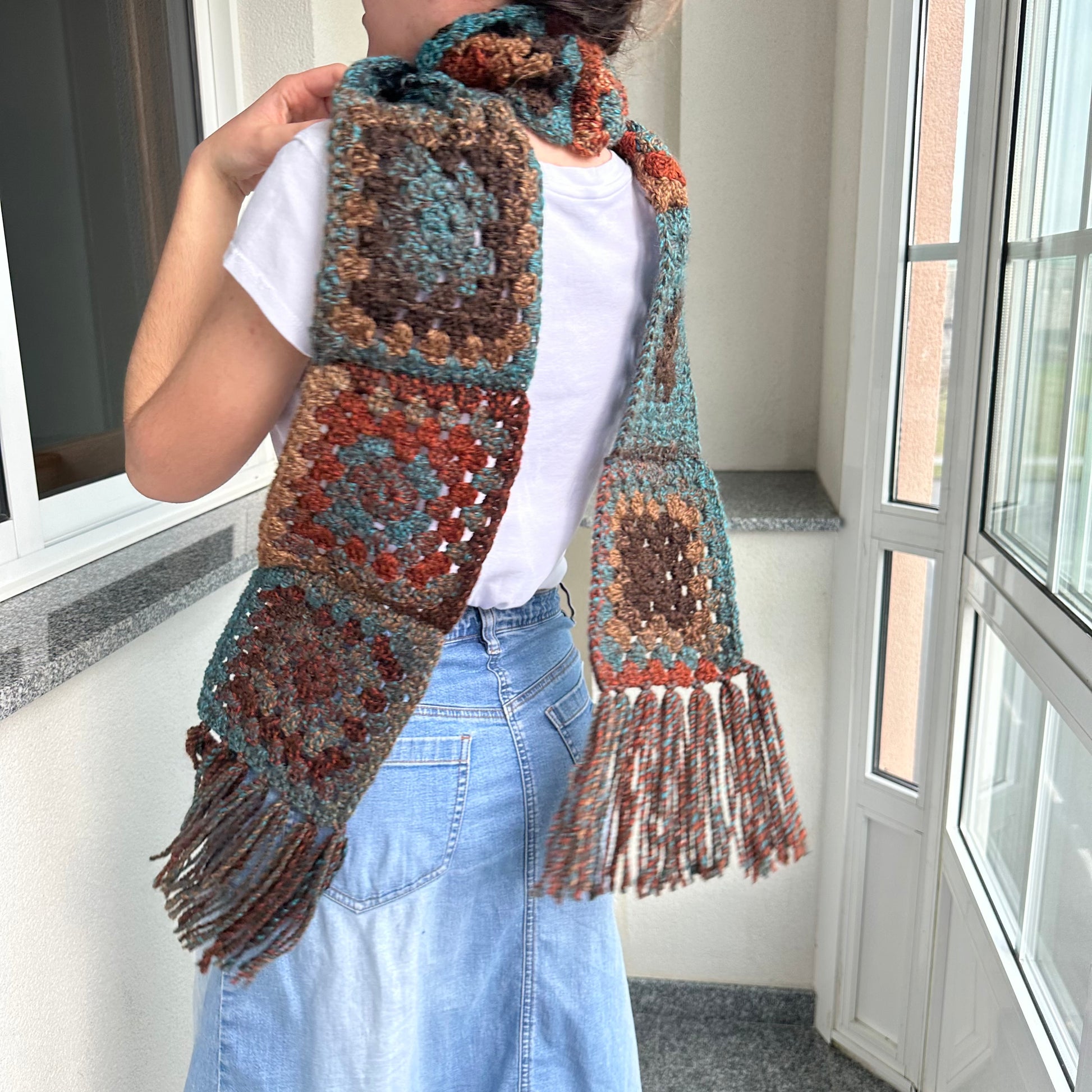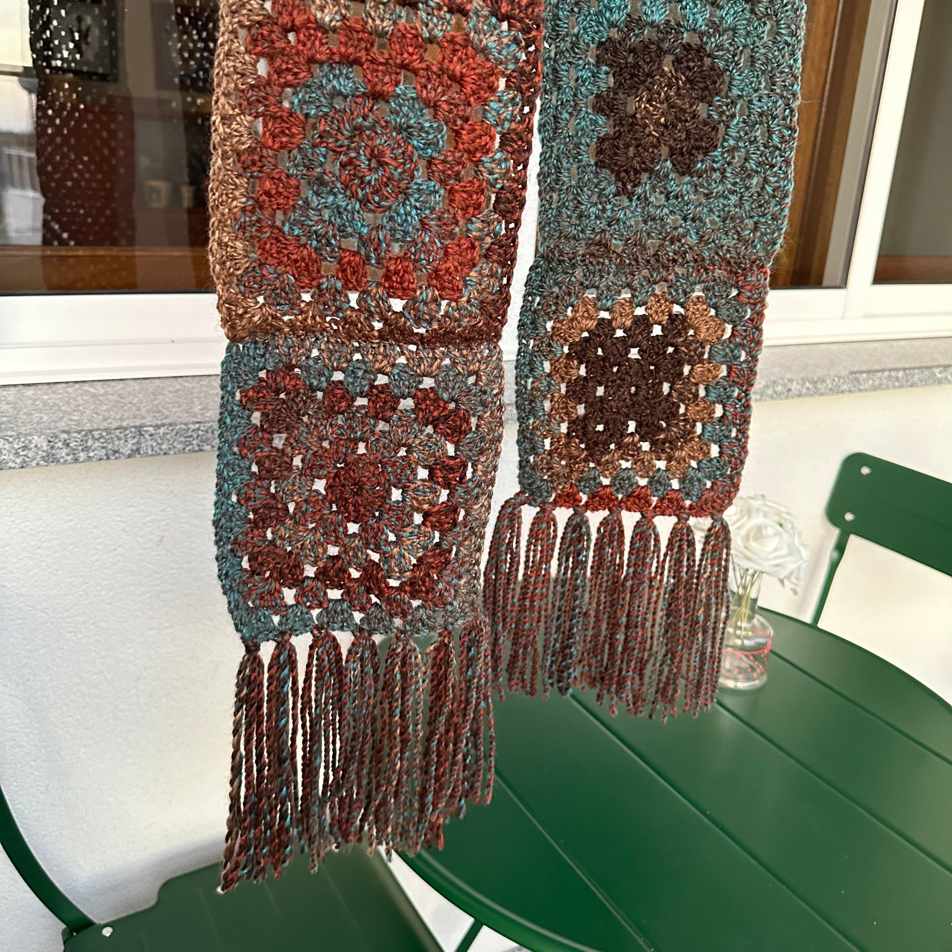 The cutest handmade patchwork crochet scarf in gorgeous brown and blue ombré colours 🦋🤎