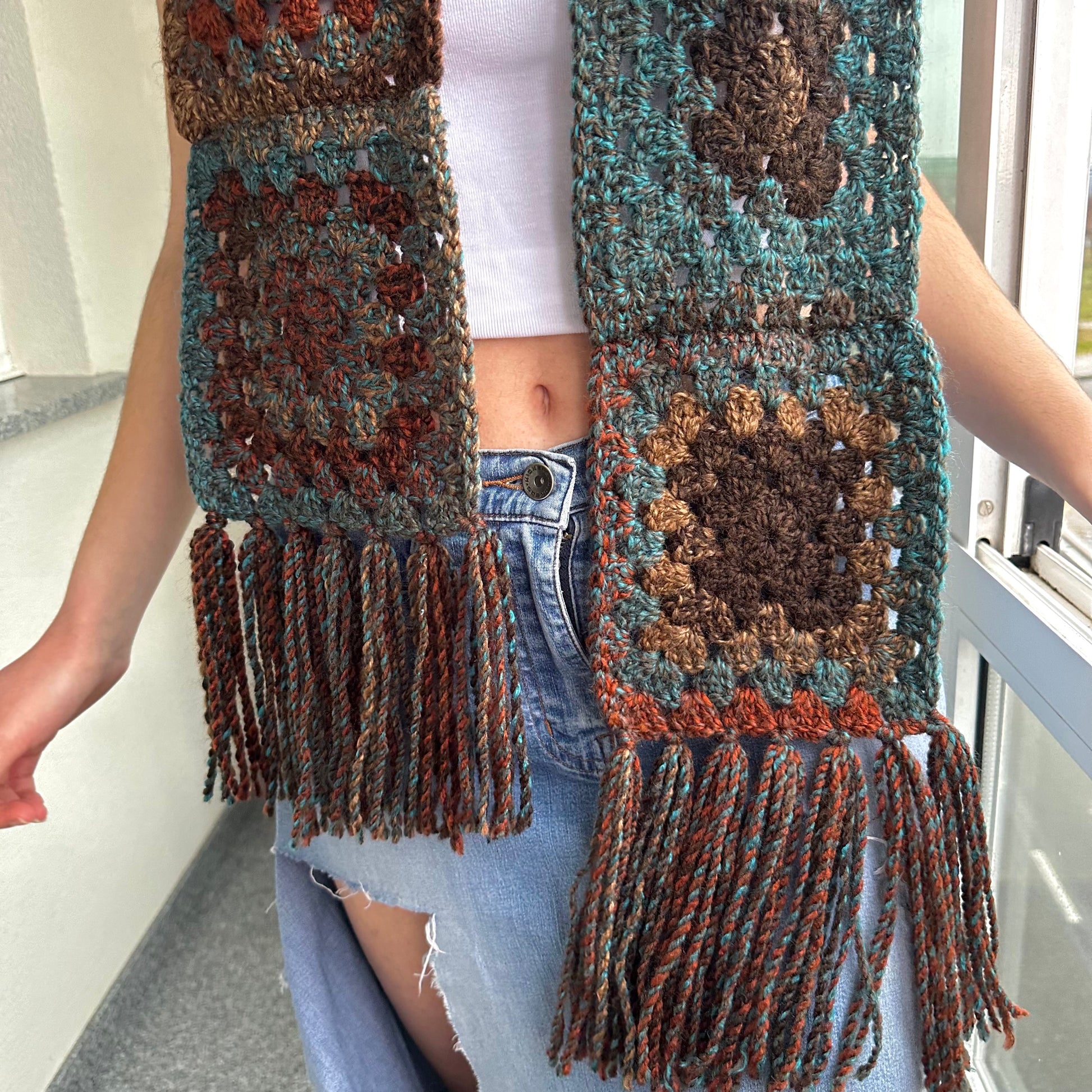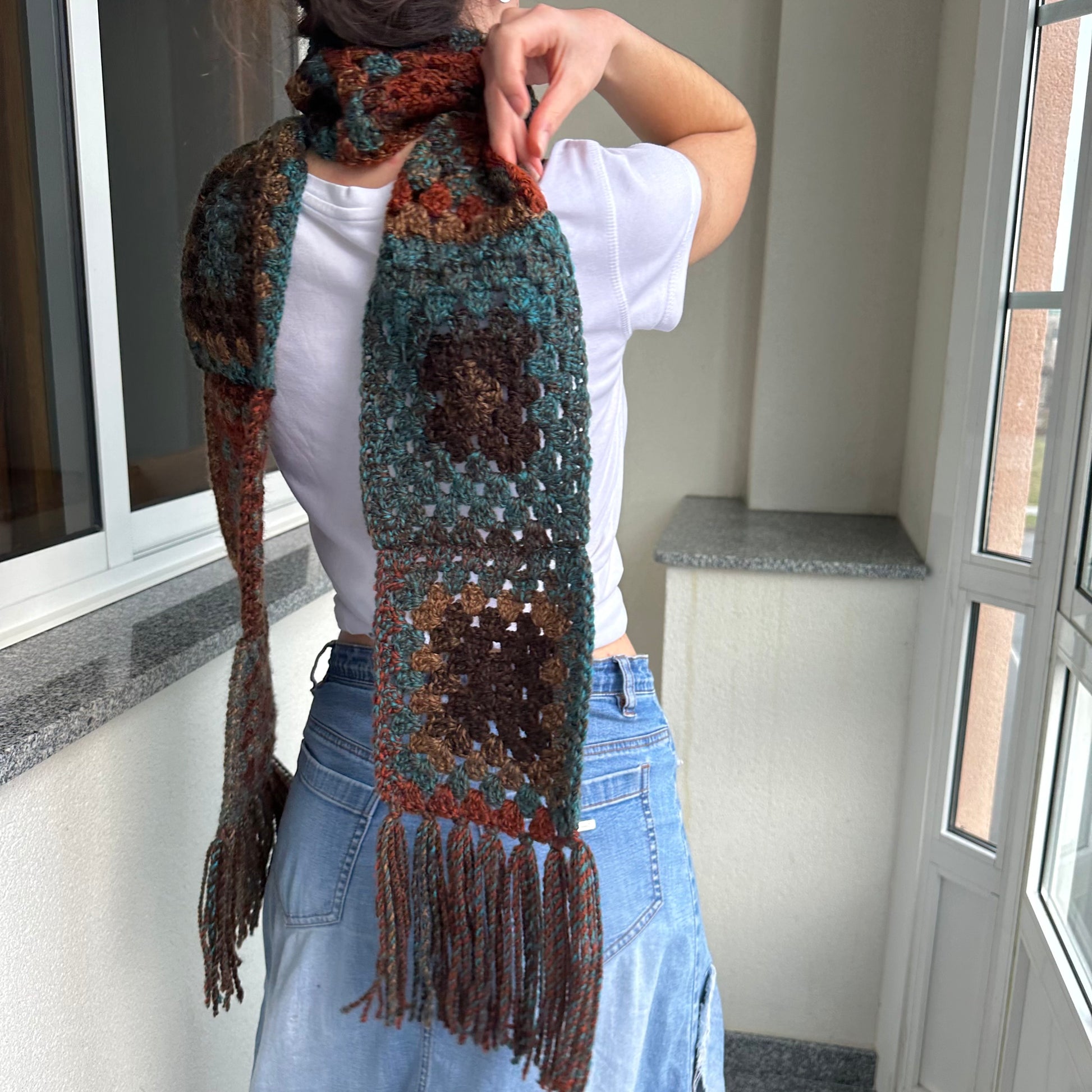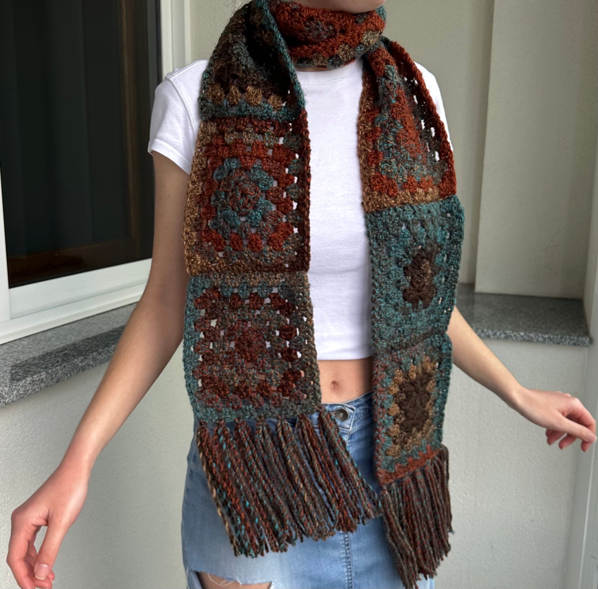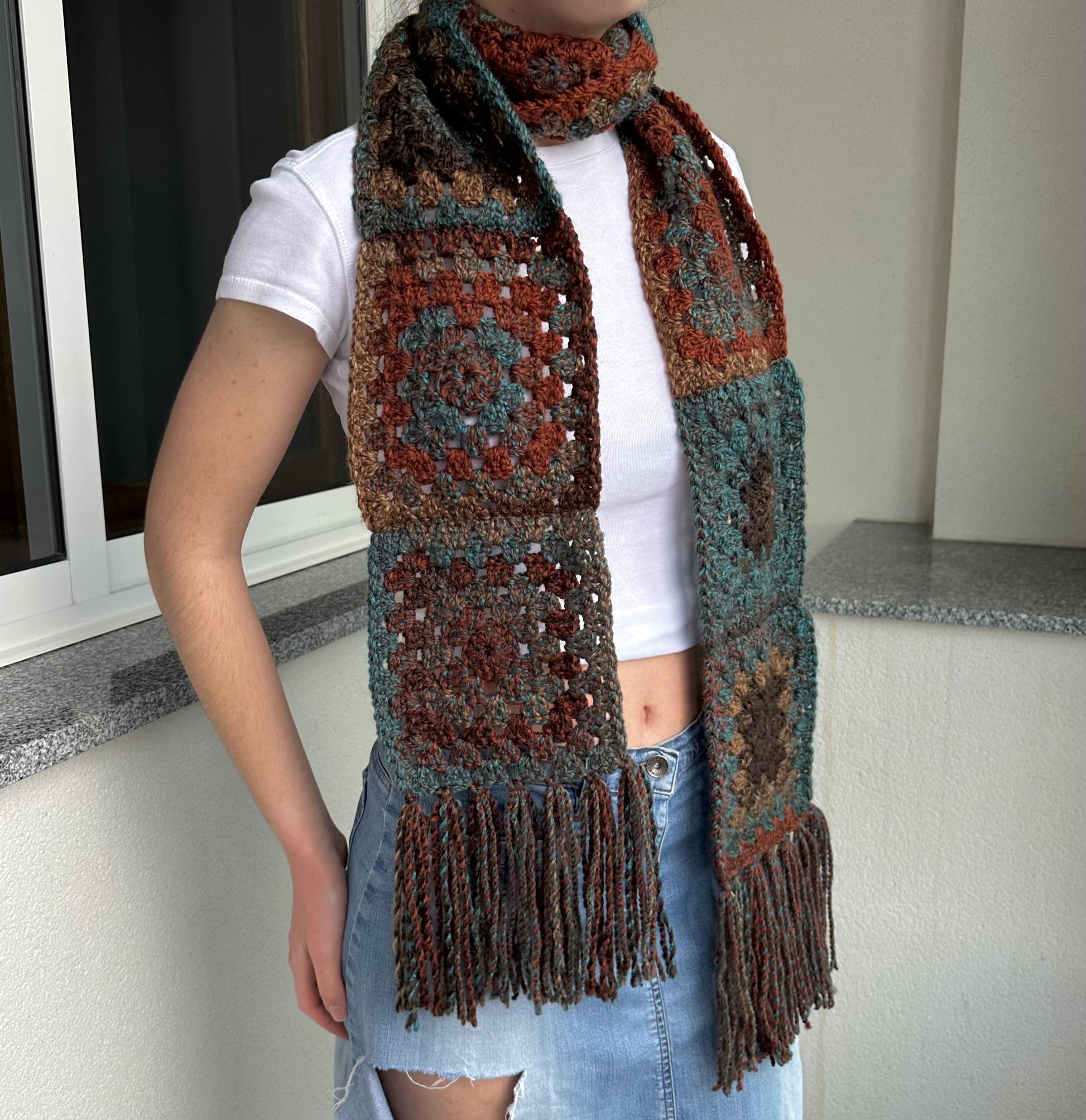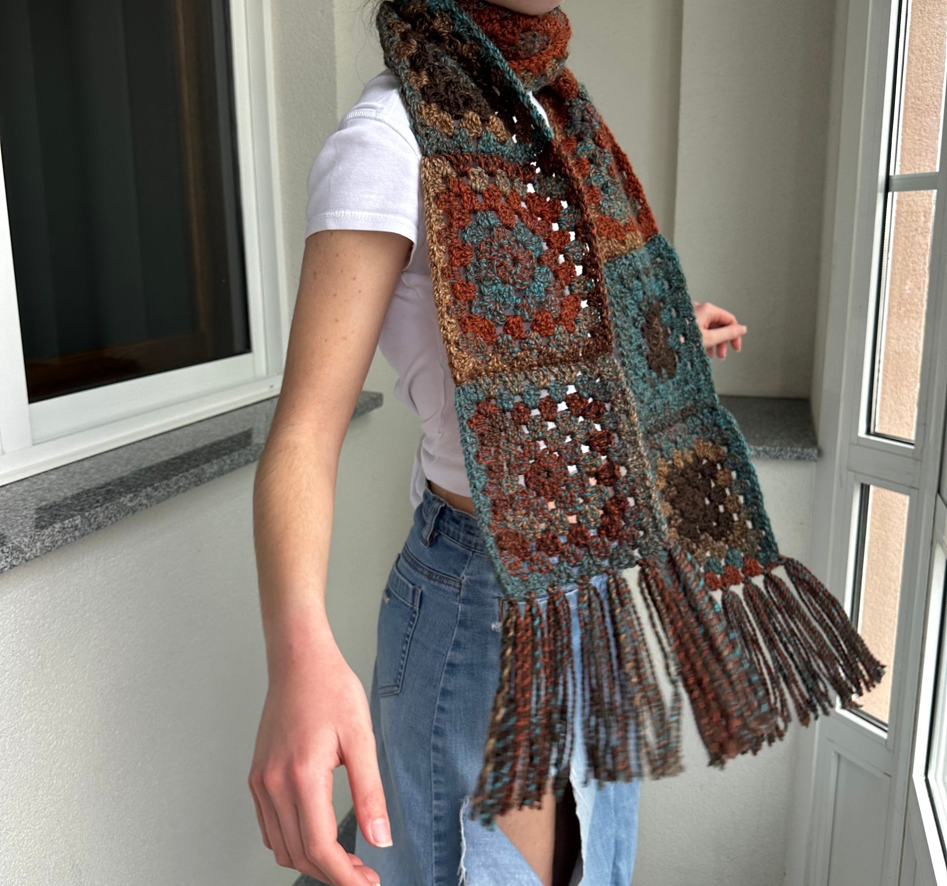 The cutest handmade patchwork crochet scarf in gorgeous brown and blue ombré colours 🦋🤎