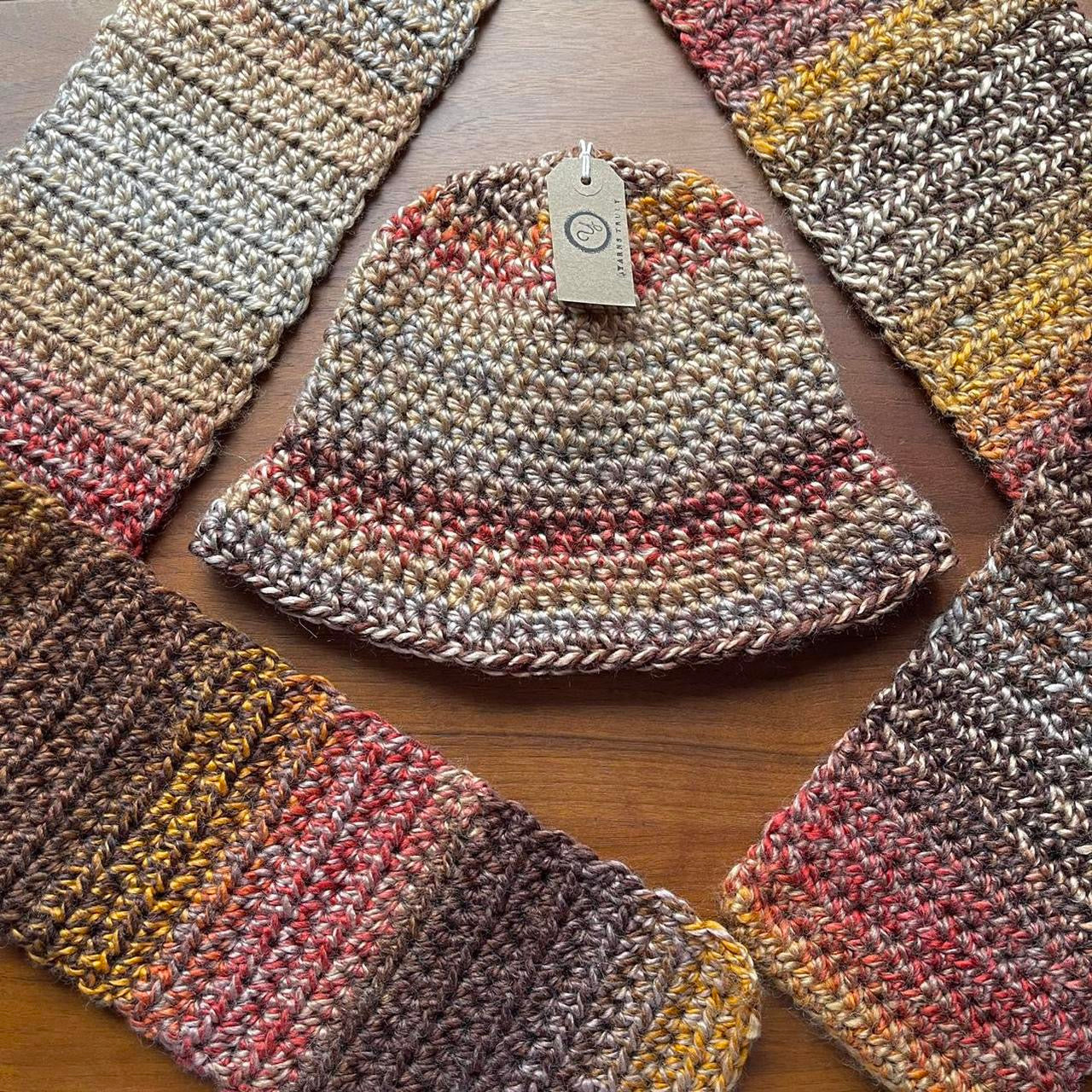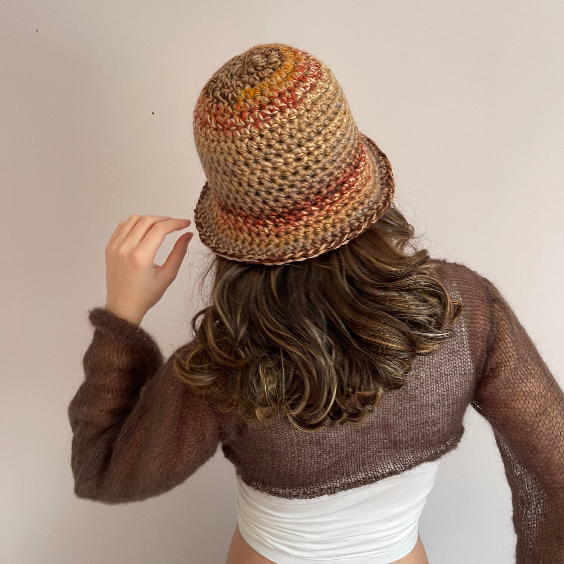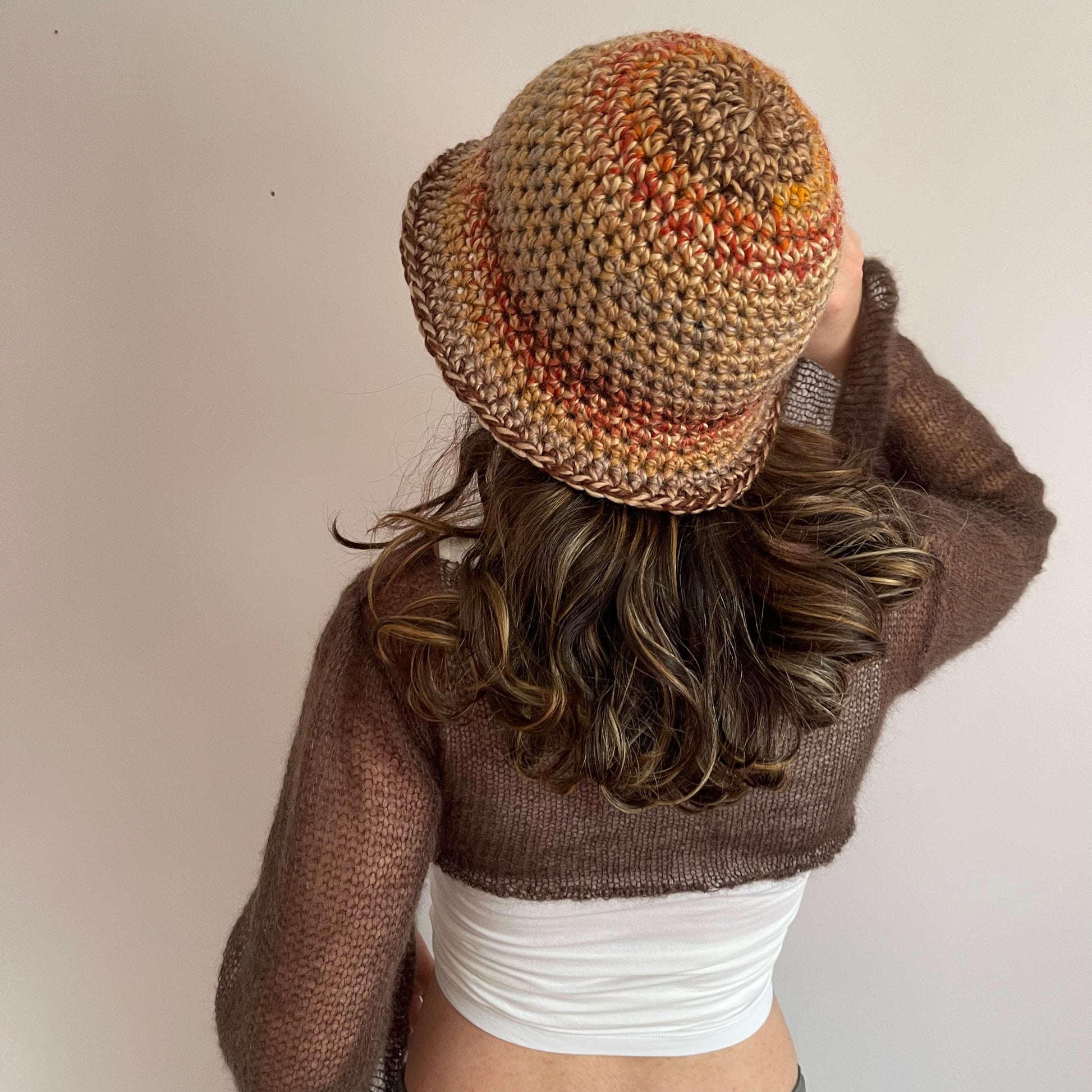 Handmade brown, burnt orange and mustard yellow chunky crochet bucket hat