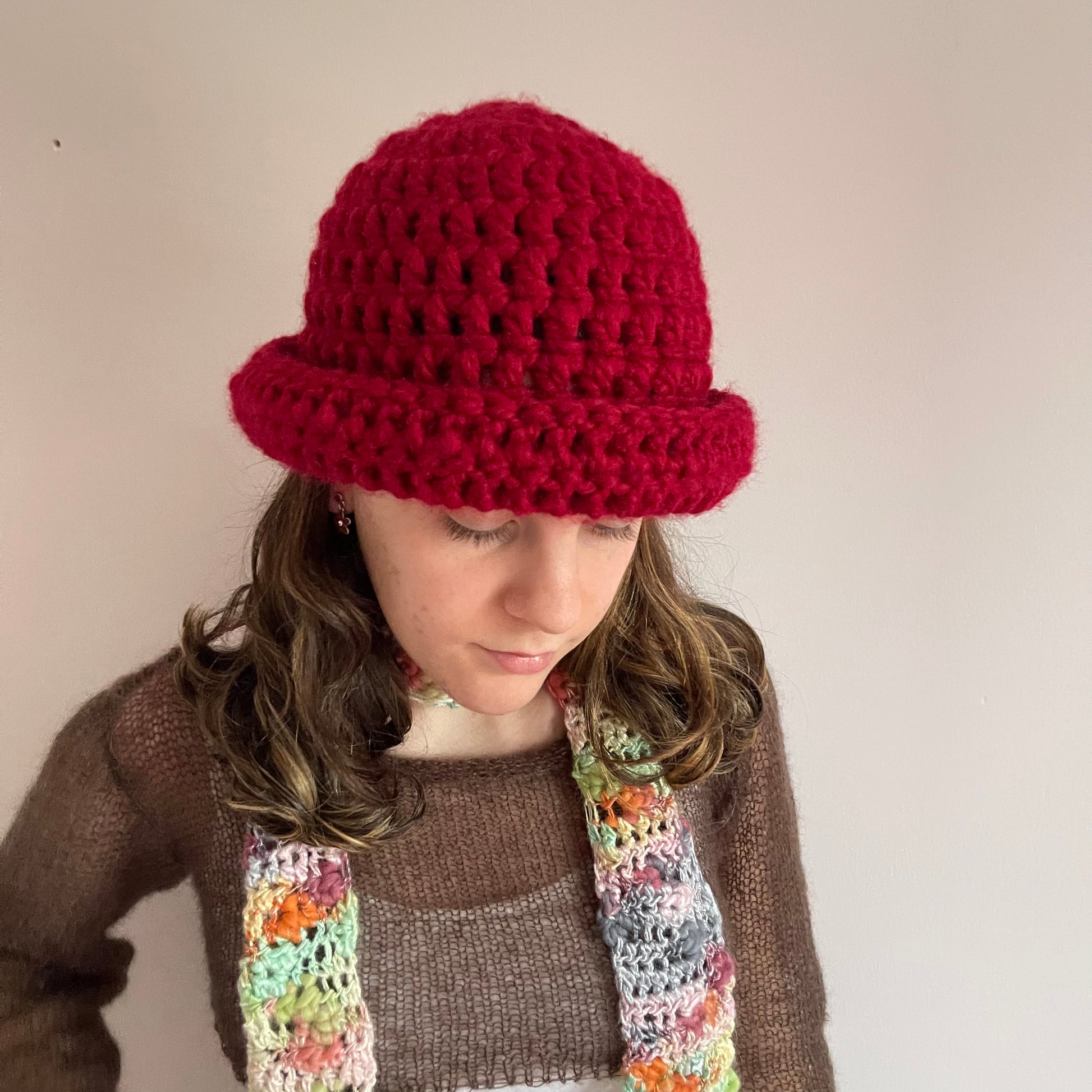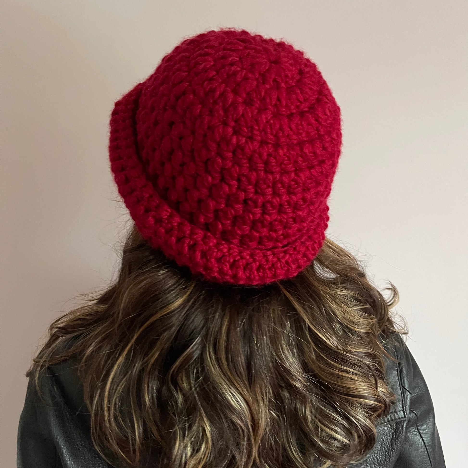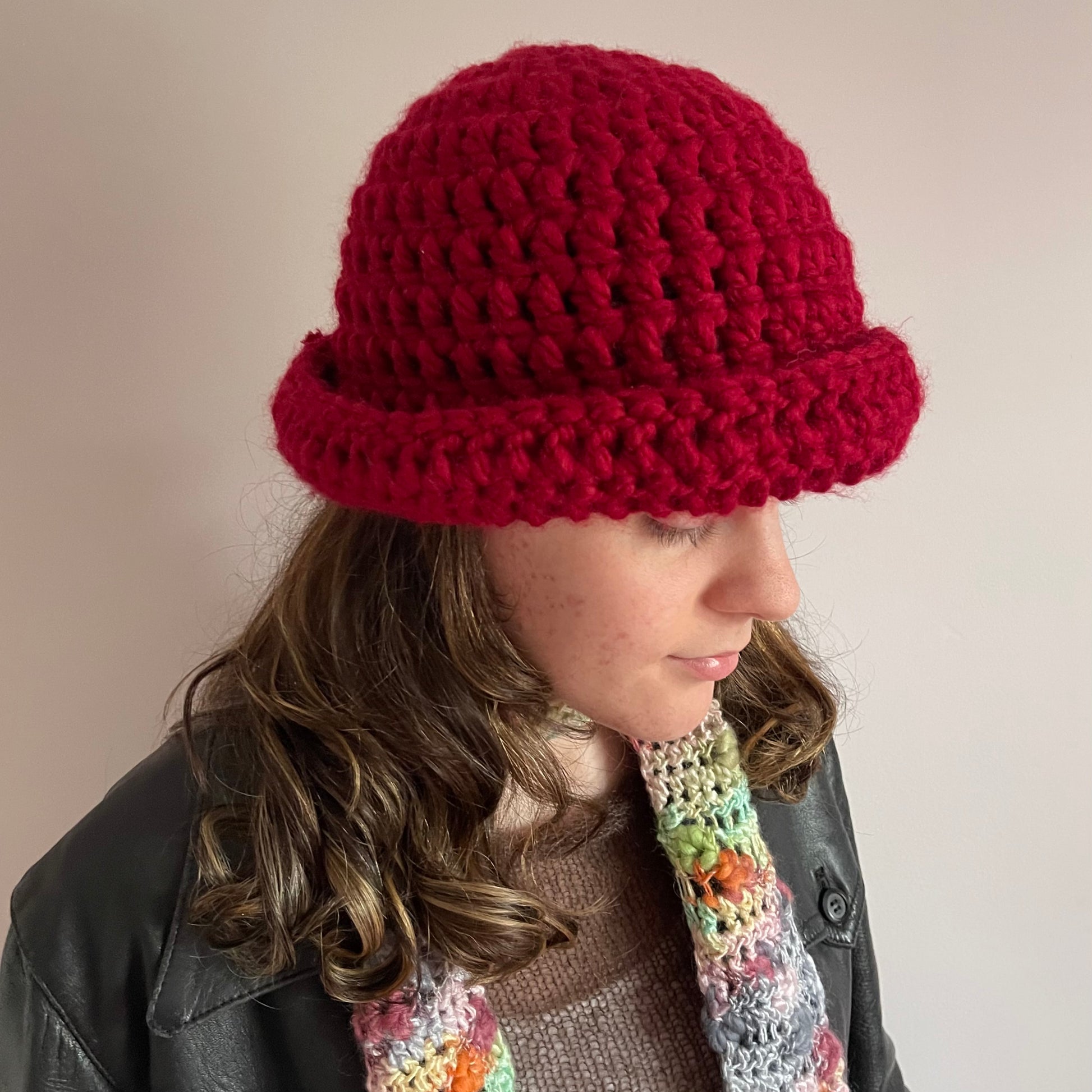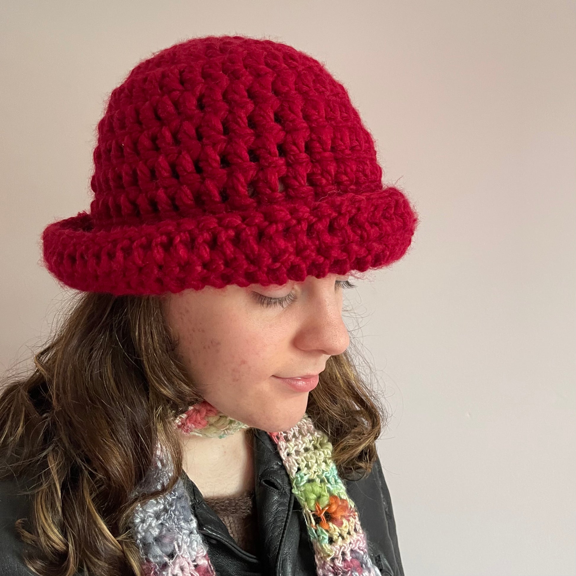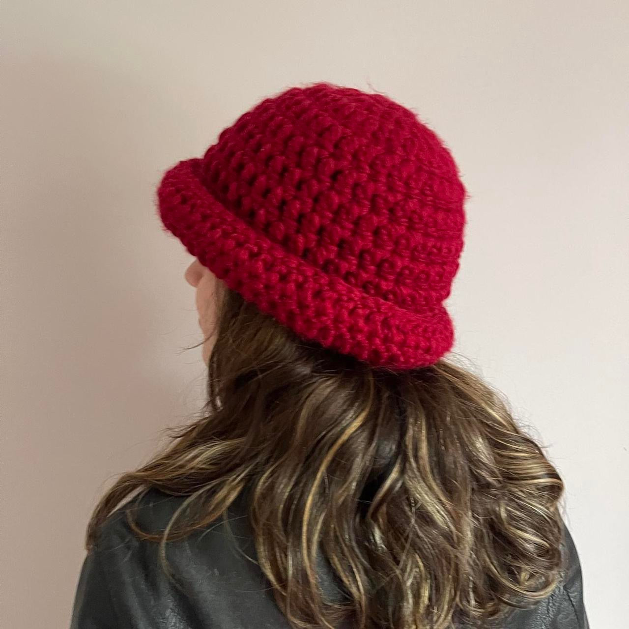 Handmade dark red chunky crochet bowler hat