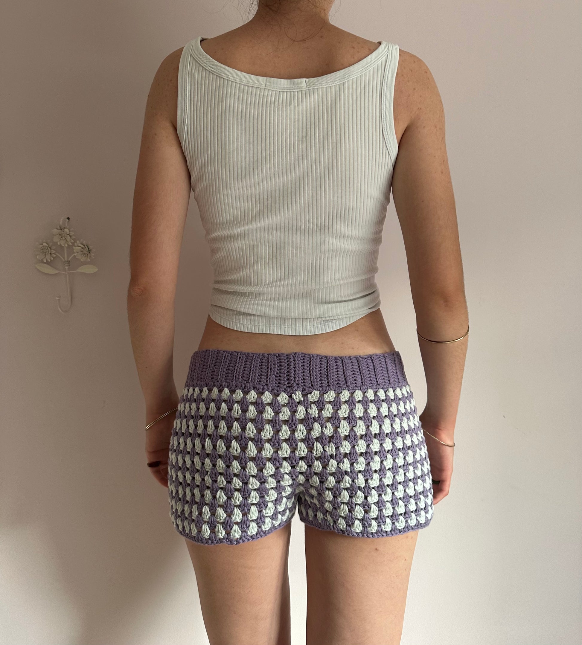 Handmade gingham crochet shorts in purple and duck egg blue (pre made in L)