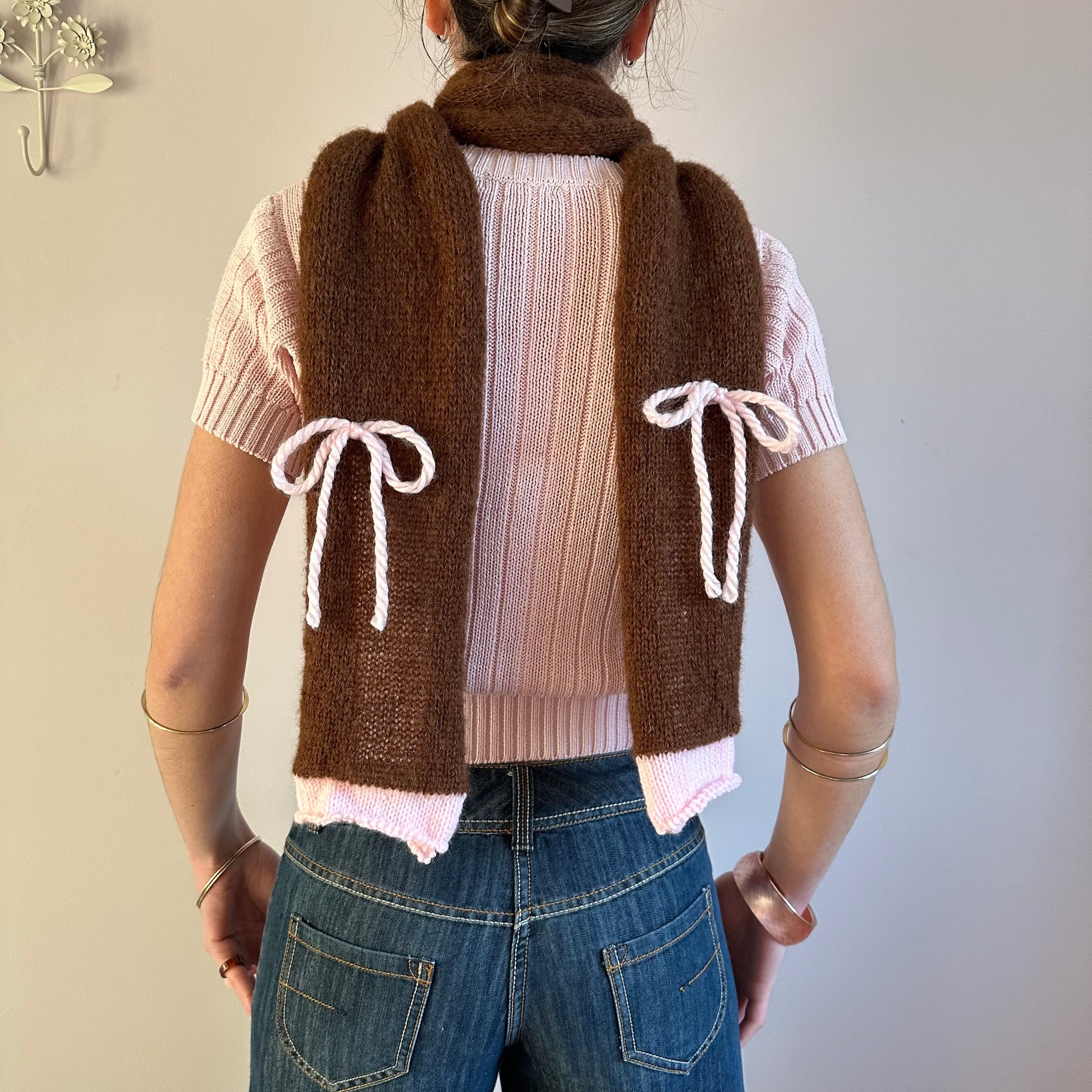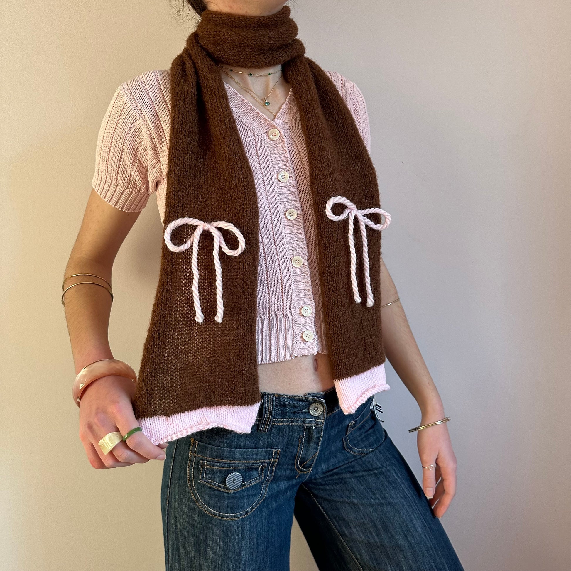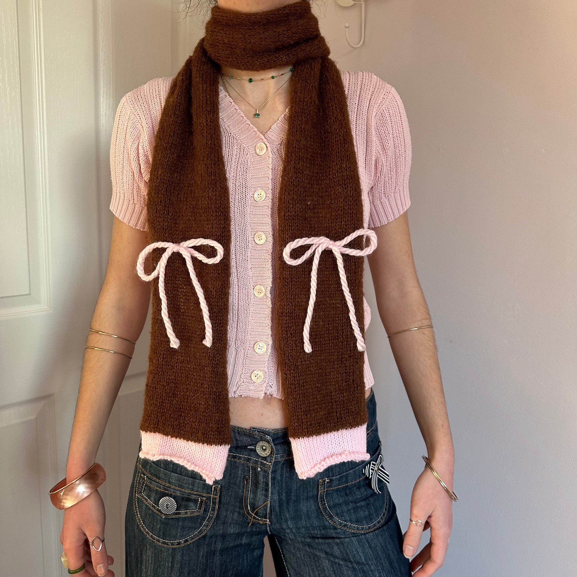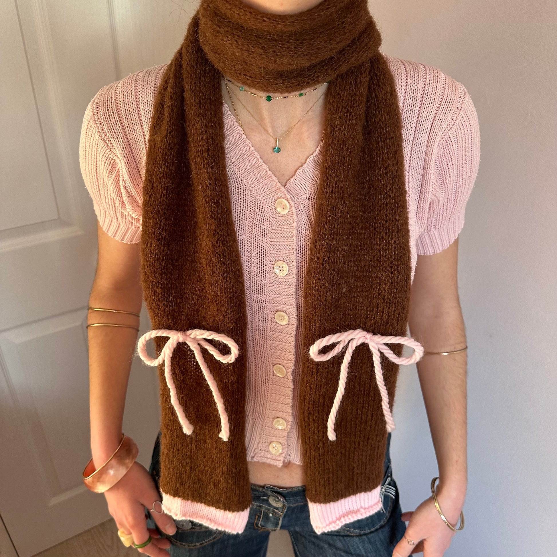 Knit brown mohair scarf with baby pink bows, the perfect addition to your outfit! So cosy 🌸🤎