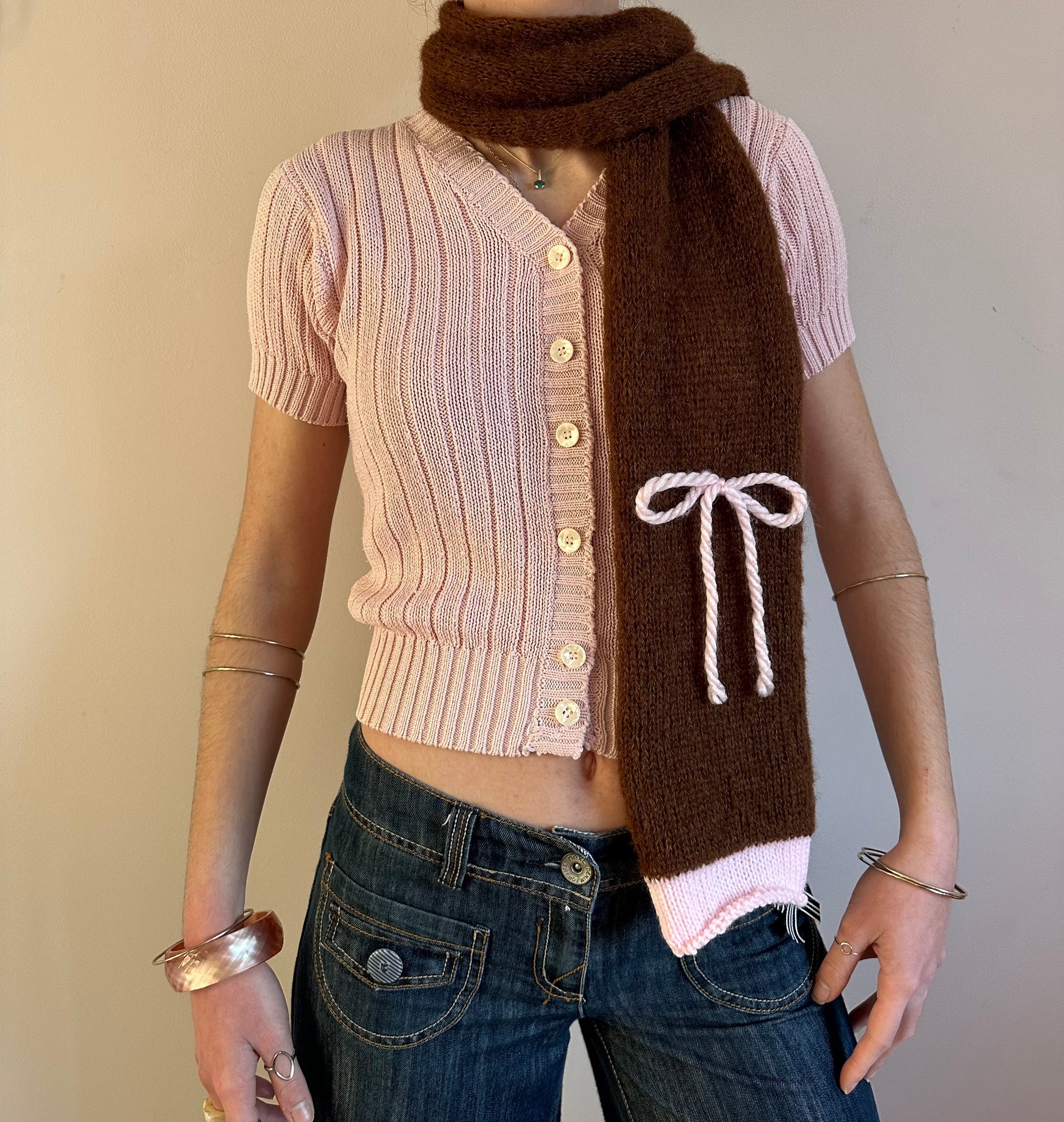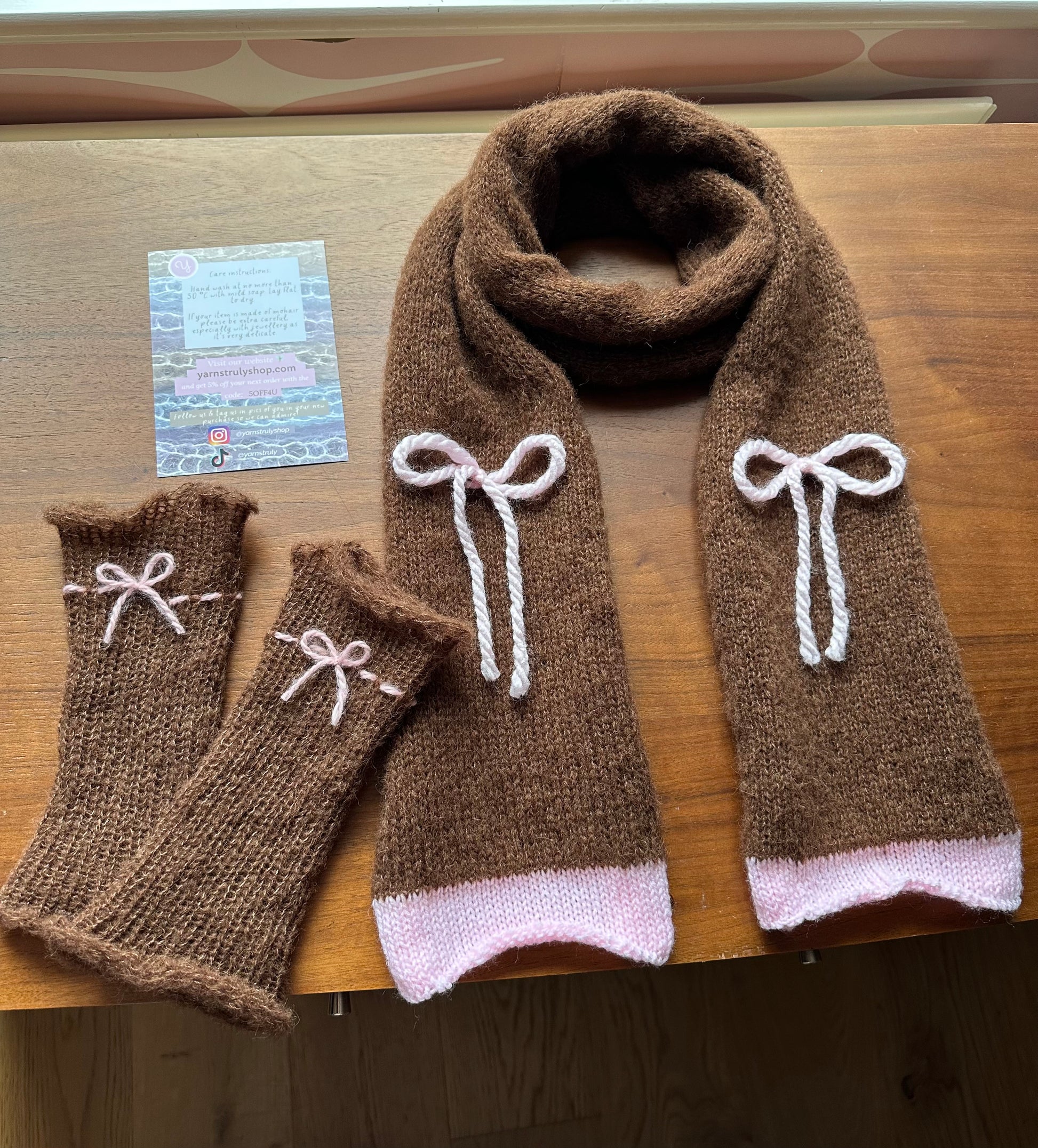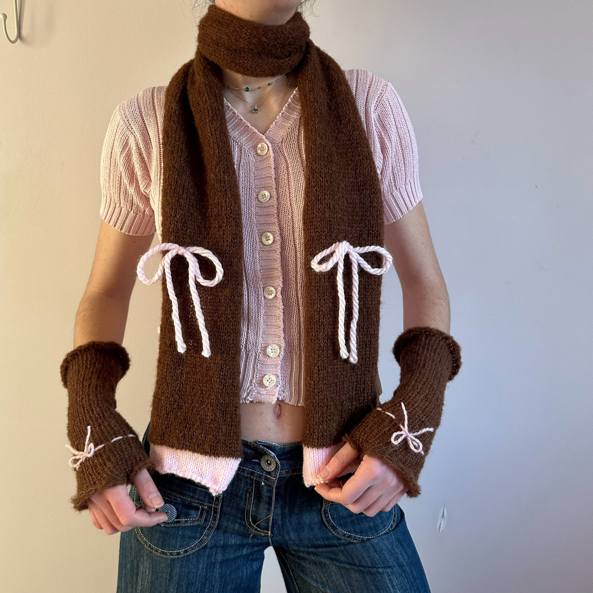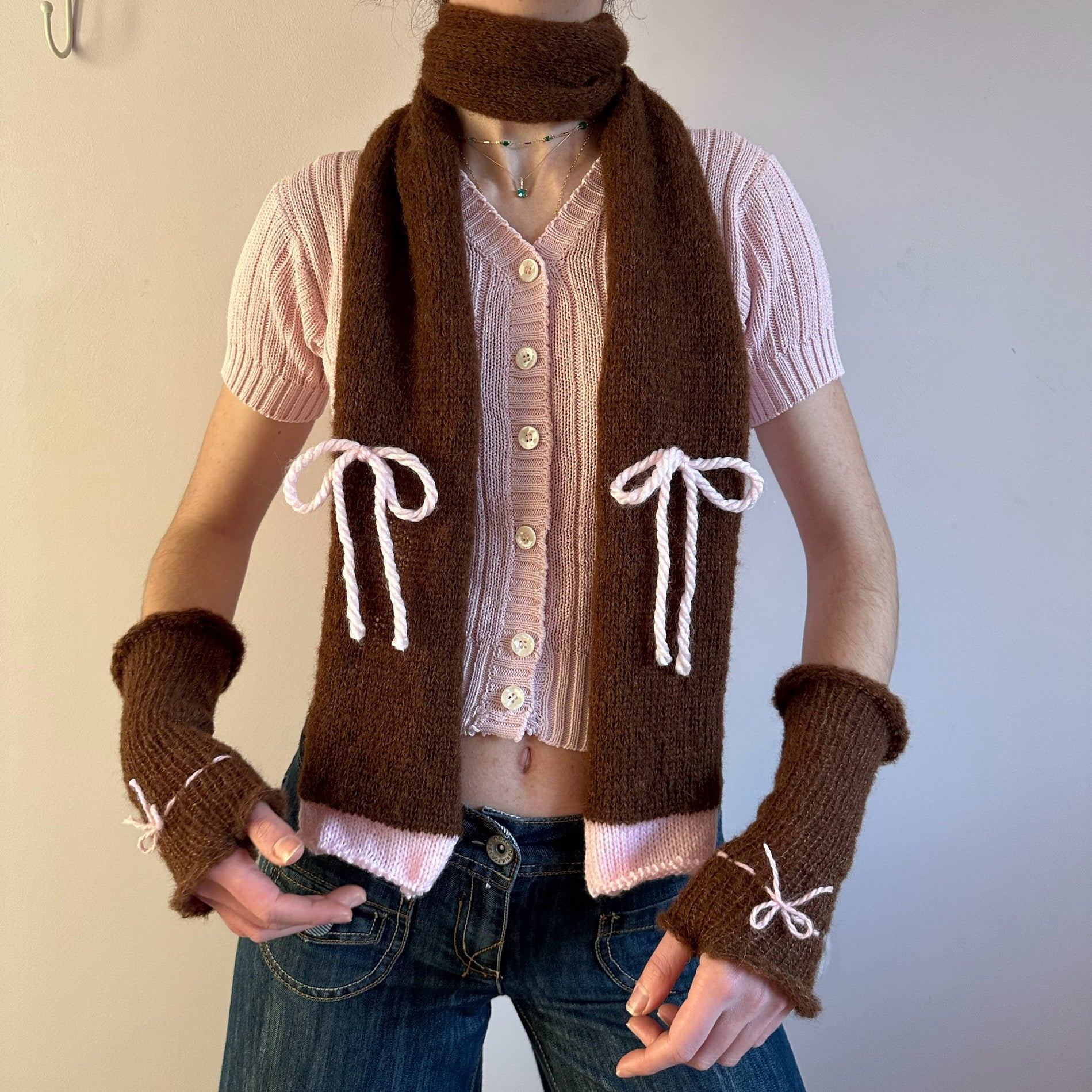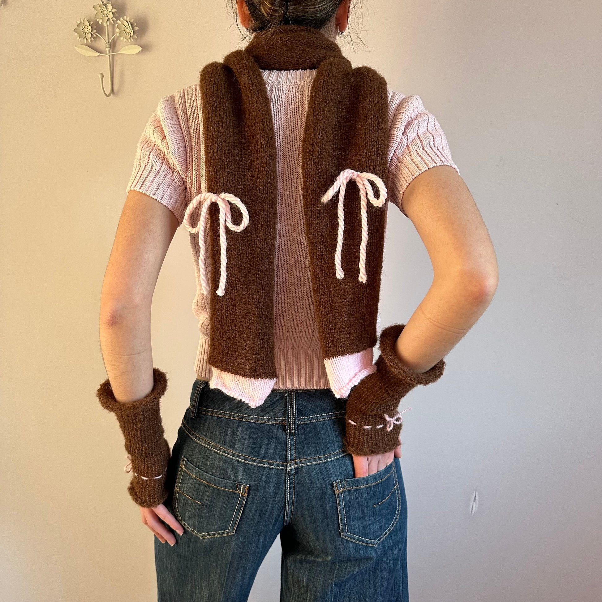 Knit brown mohair scarf with baby pink bows, the perfect addition to your outfit! So cosy 🌸🤎