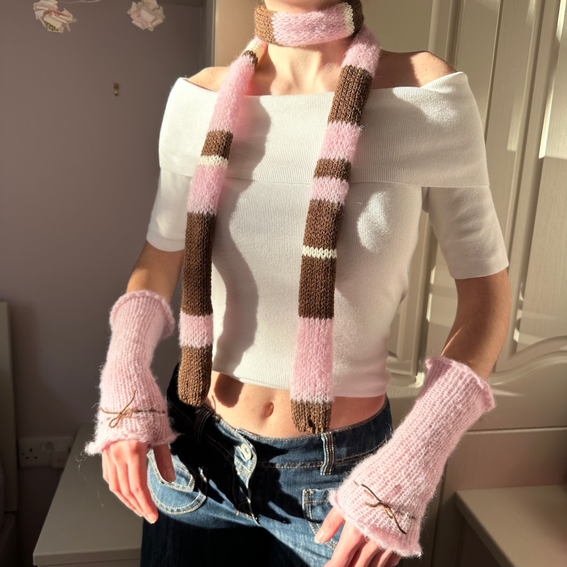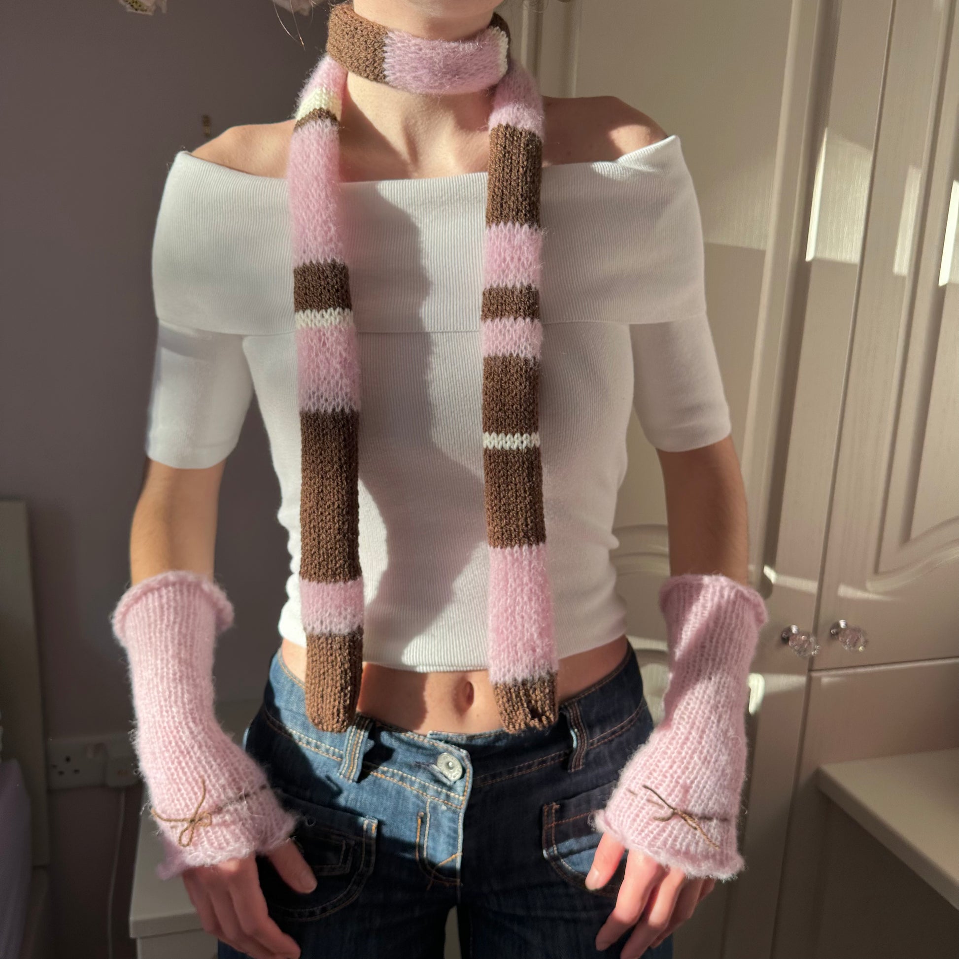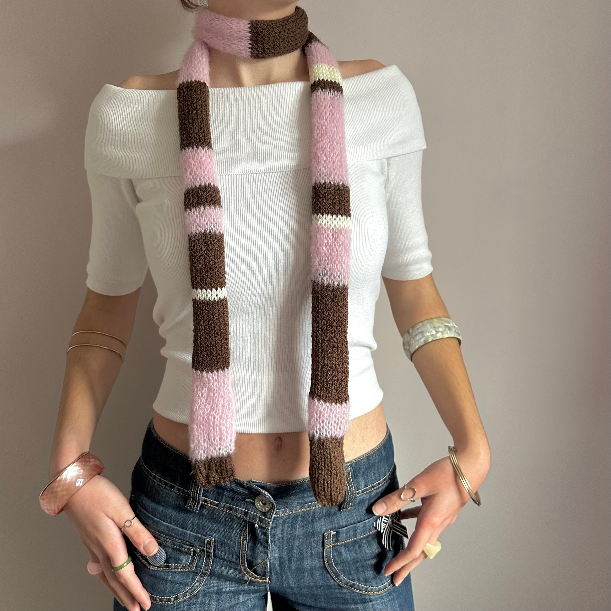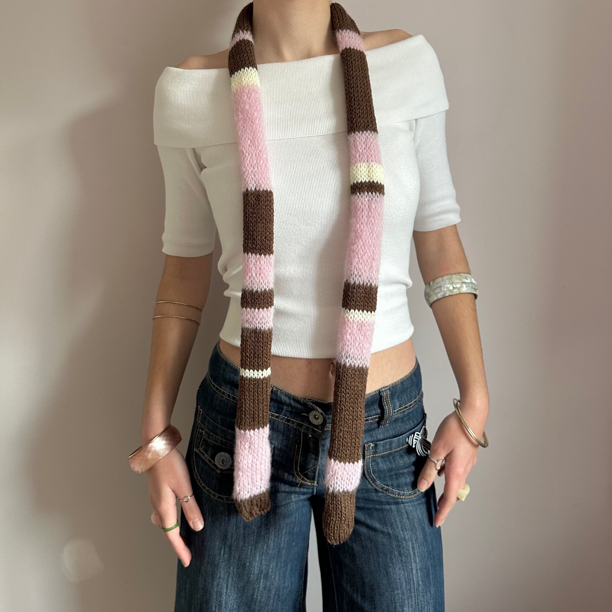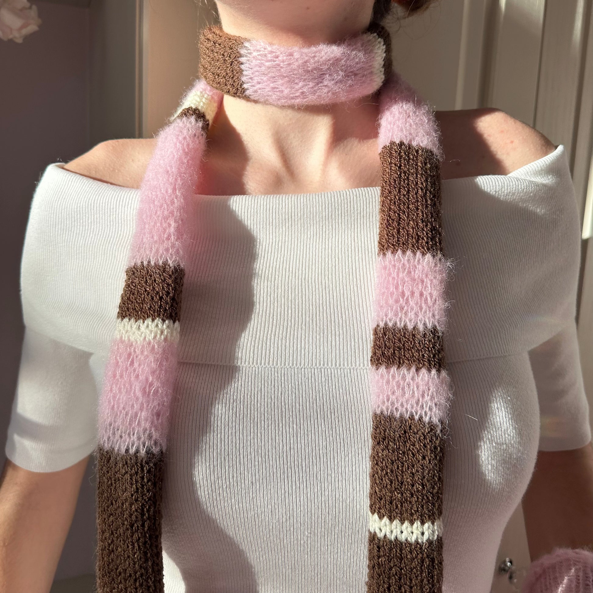 Handmade knitted brown, cream and baby pink striped skinny scarf