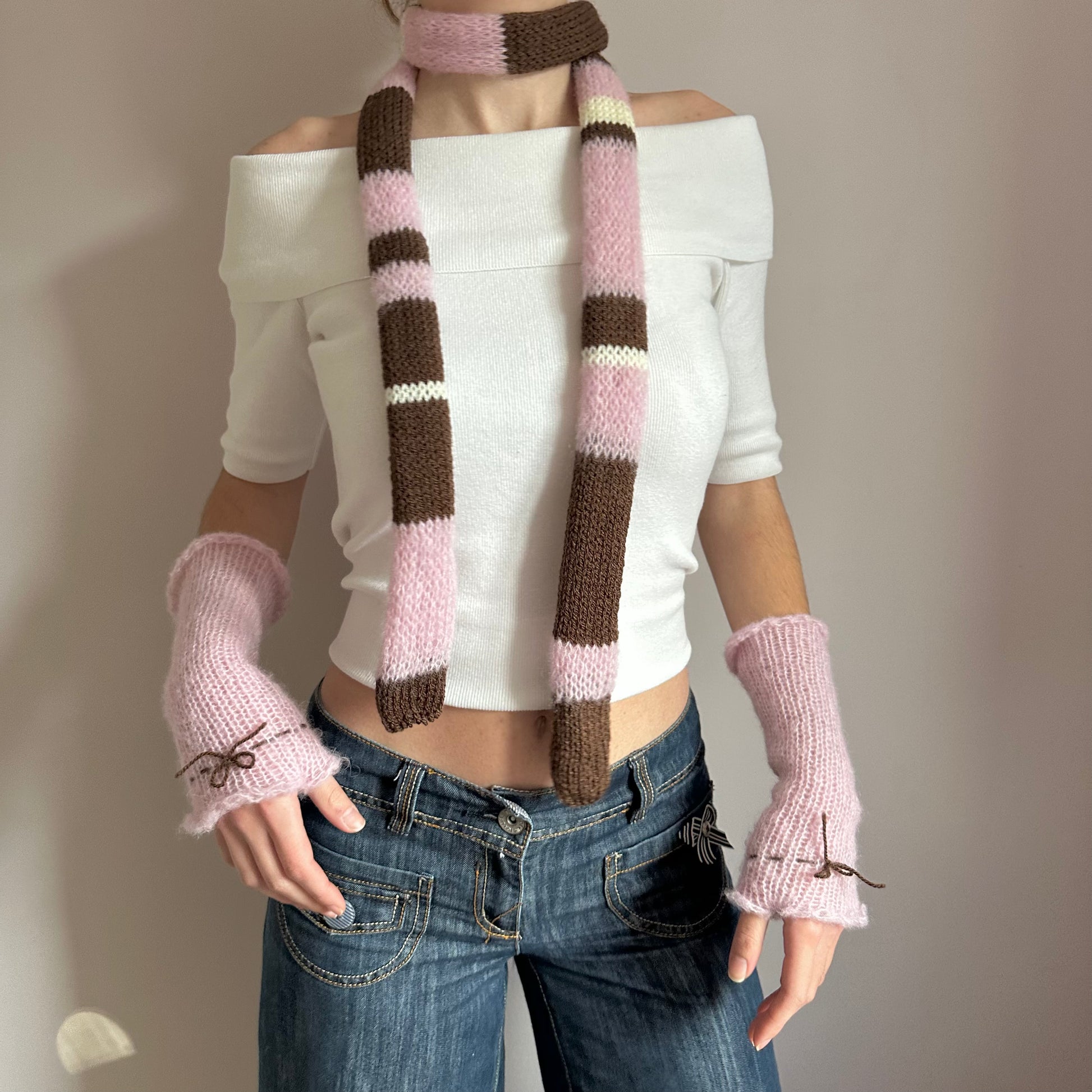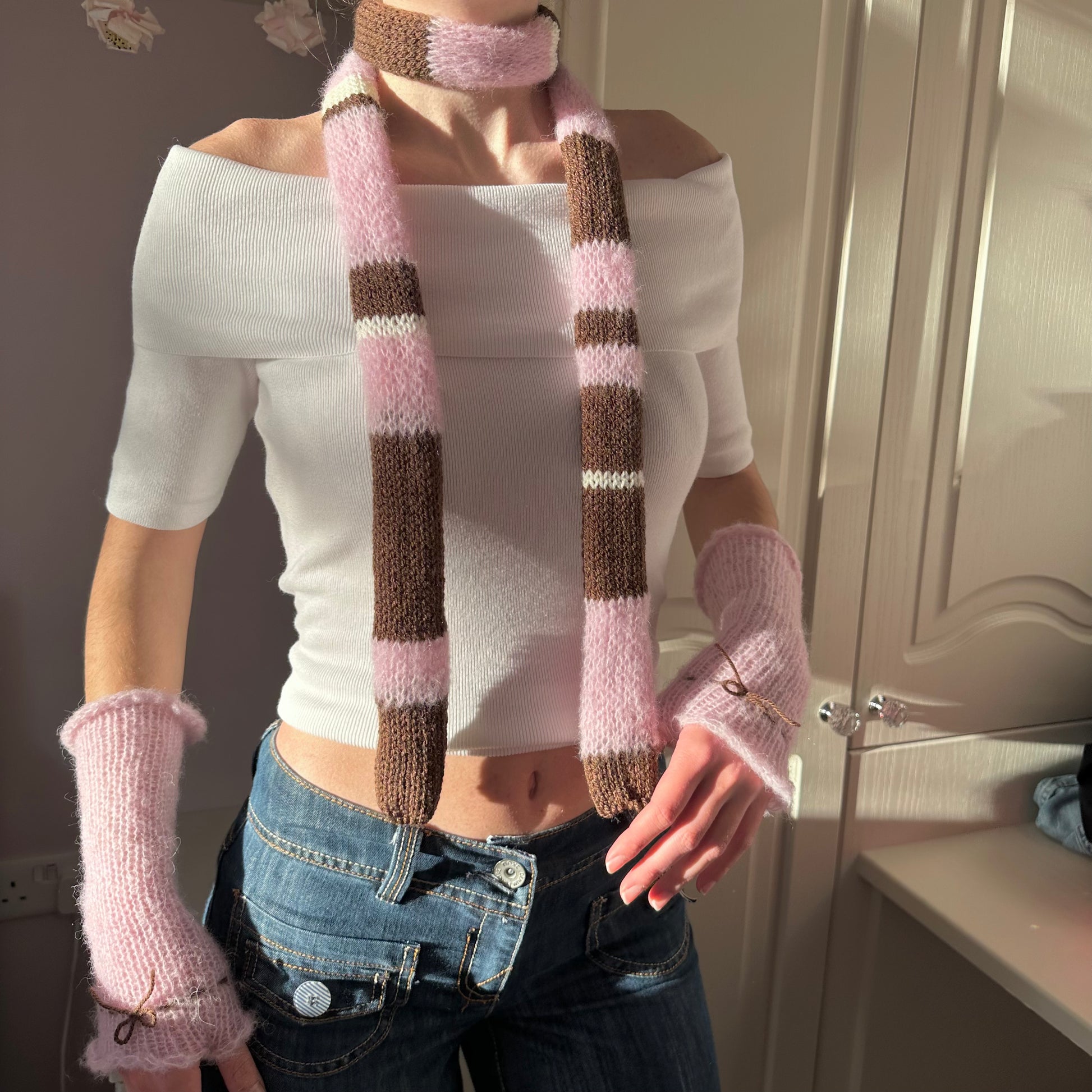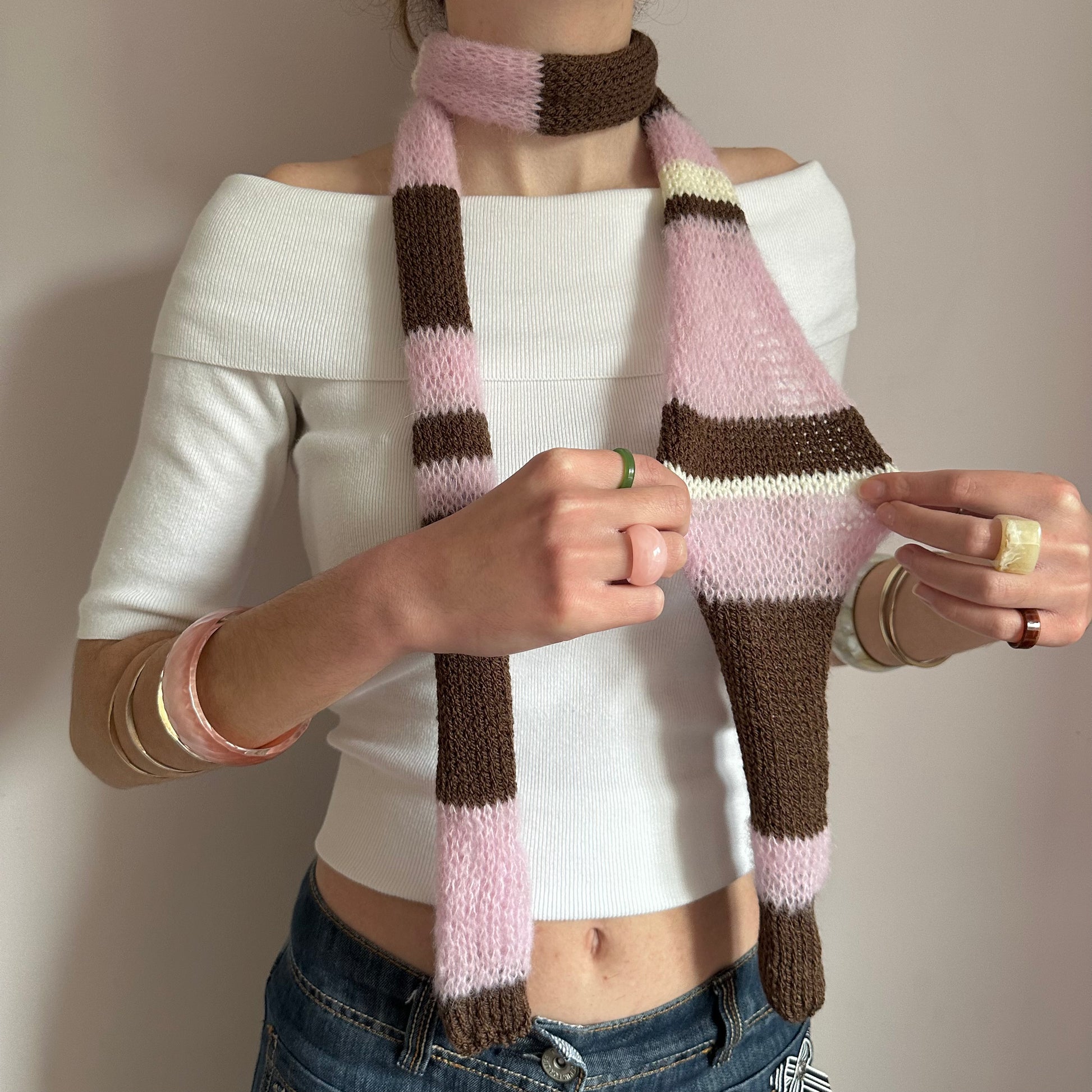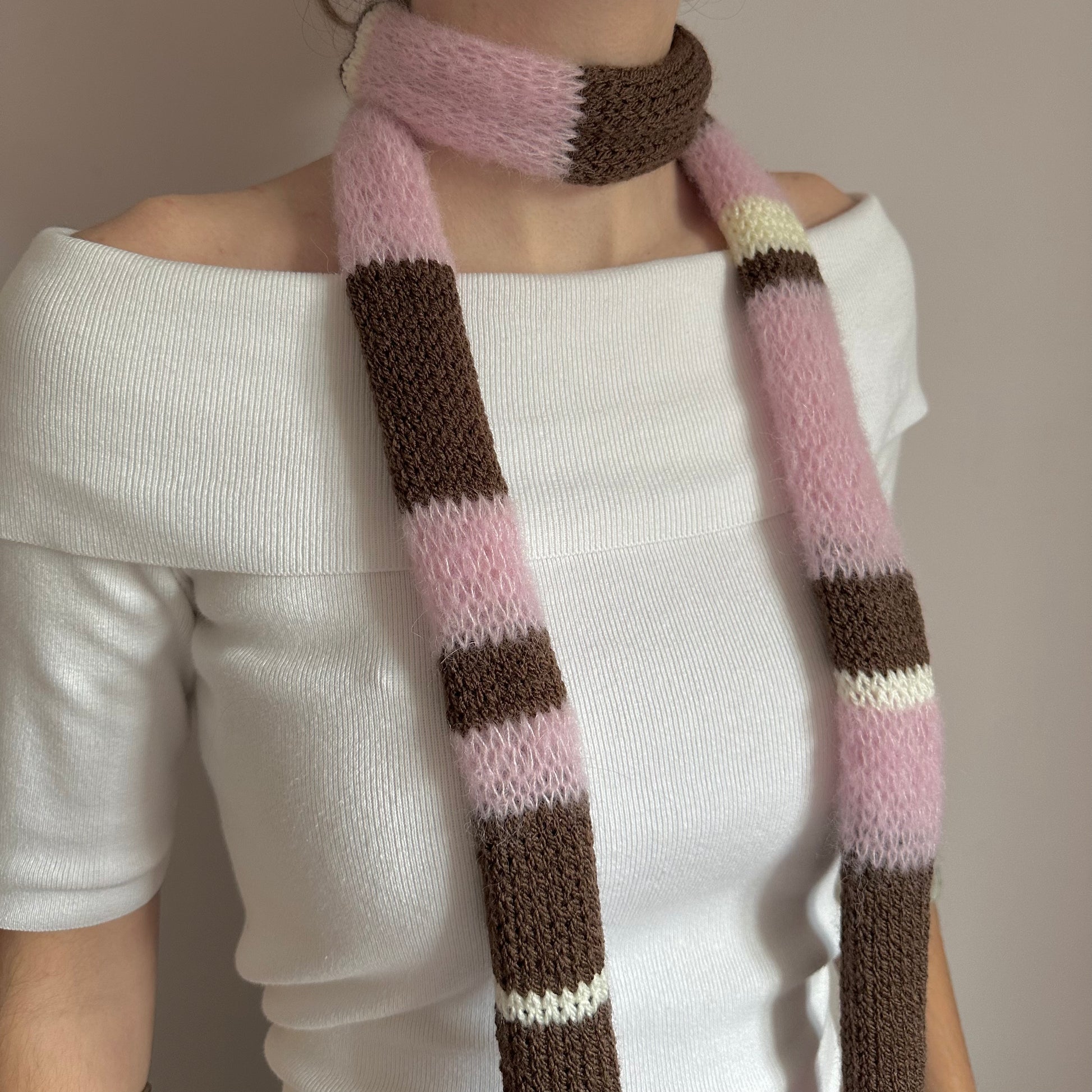 Knit skinny scarf in a gorgeous striped colourway featuring mohair, the perfect addition to your outfit and really flattering. Great for all year round! 🌸