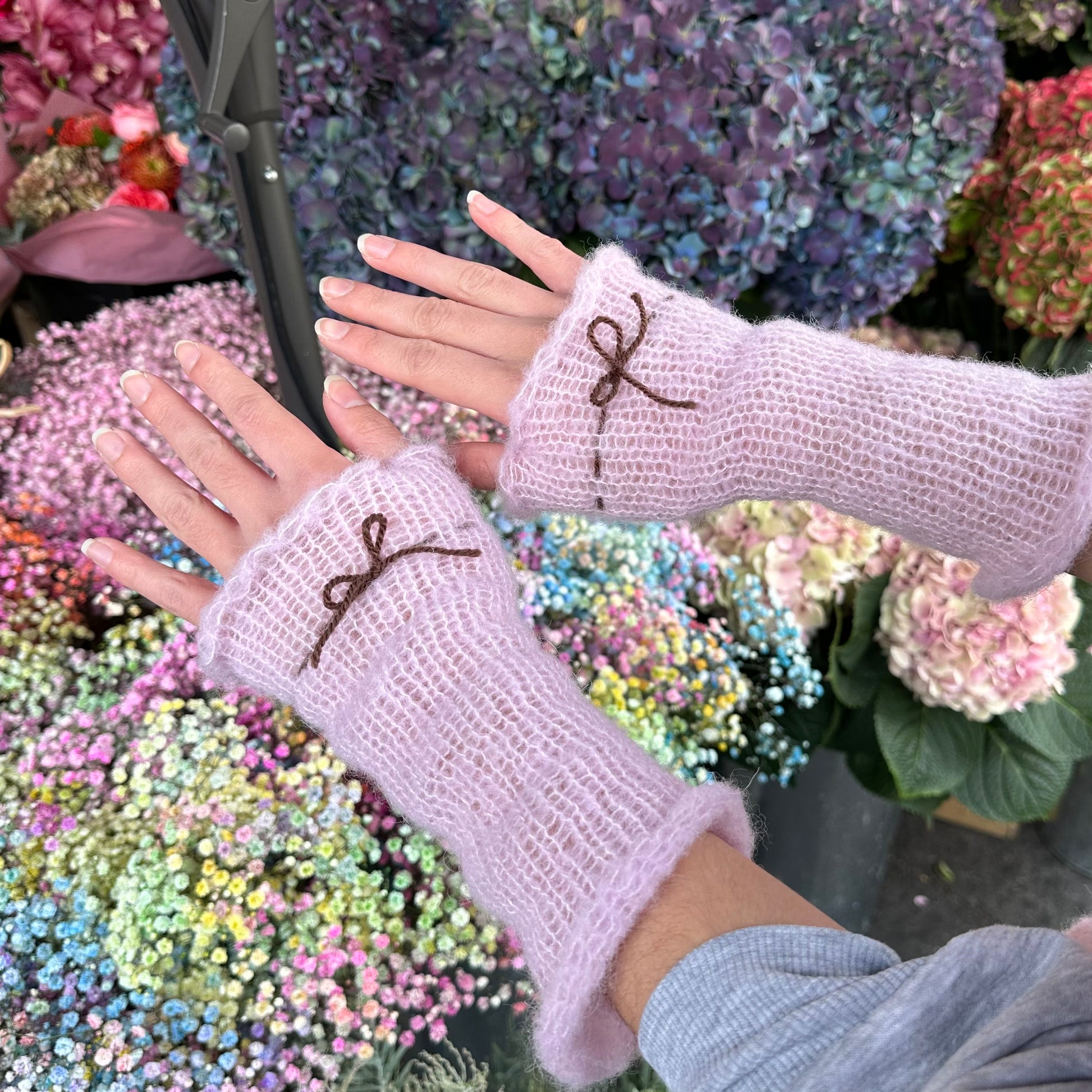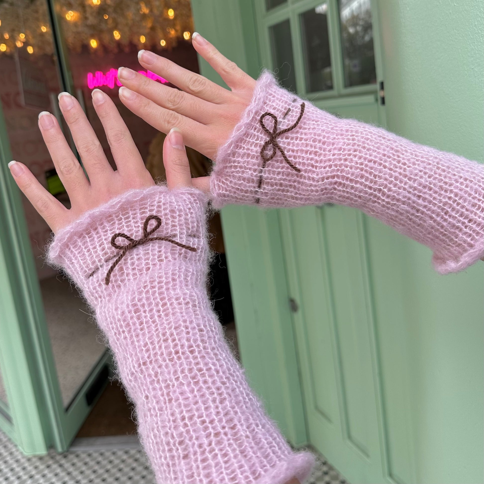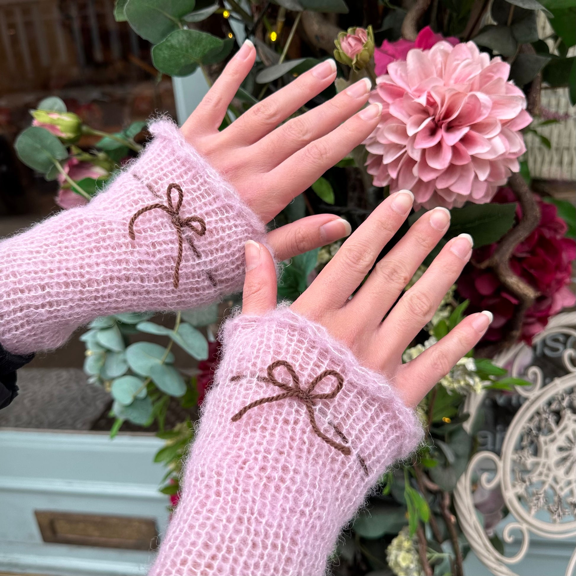 Handmade knitted mohair bow gloves in baby pink & brown - with thumb hole