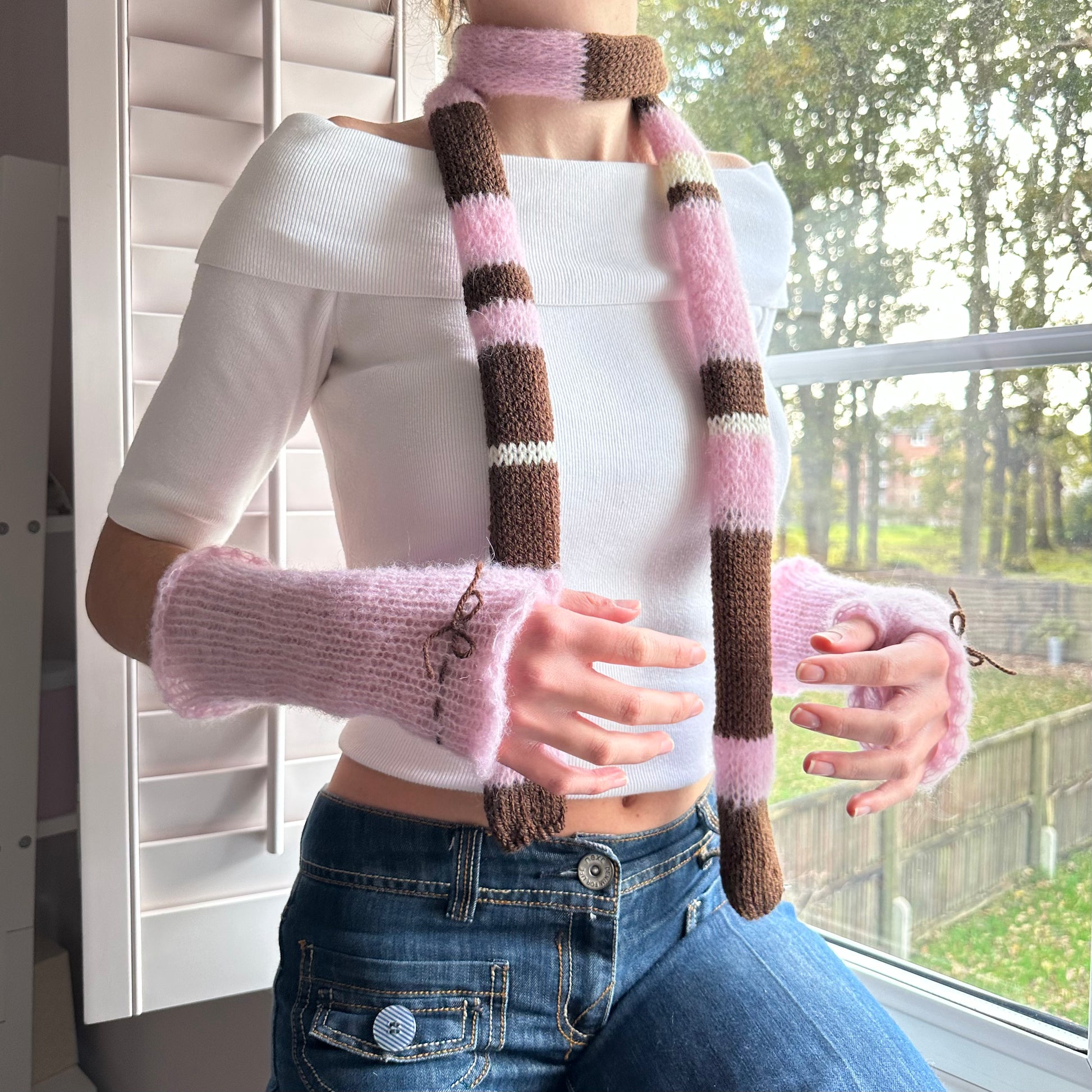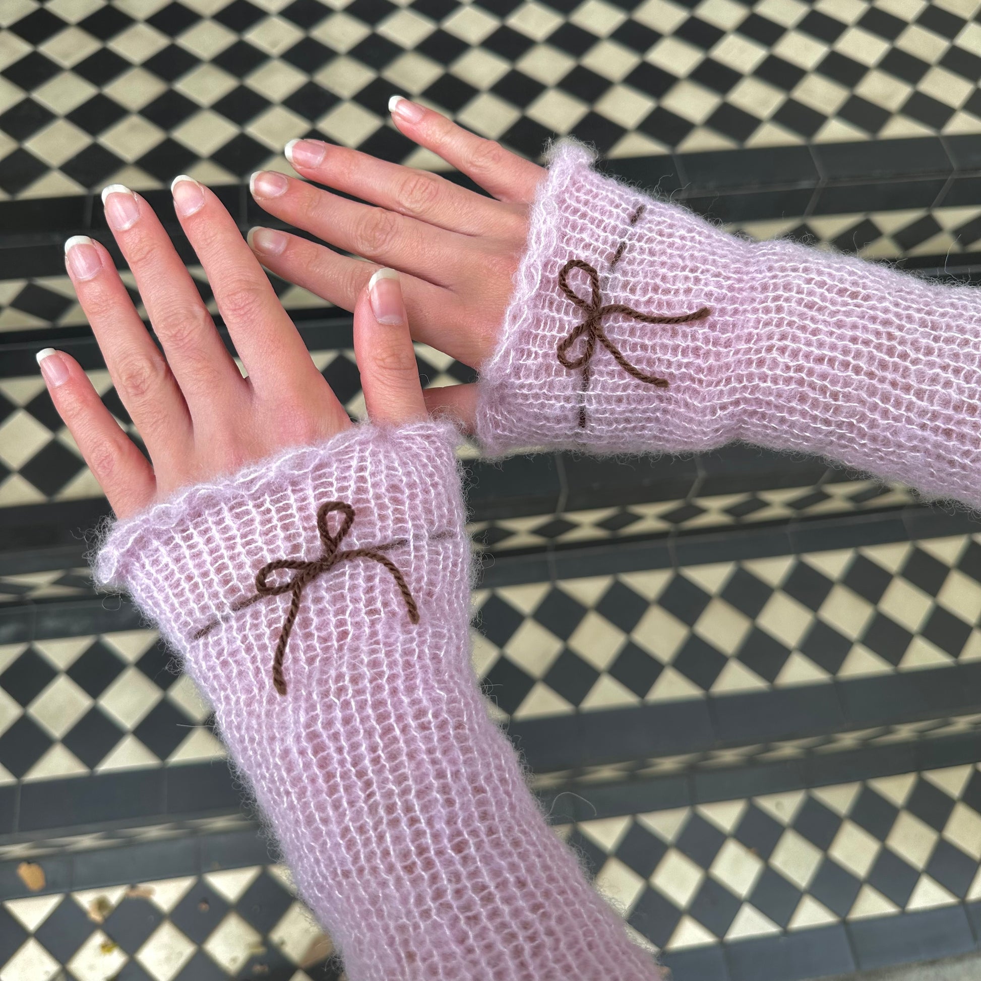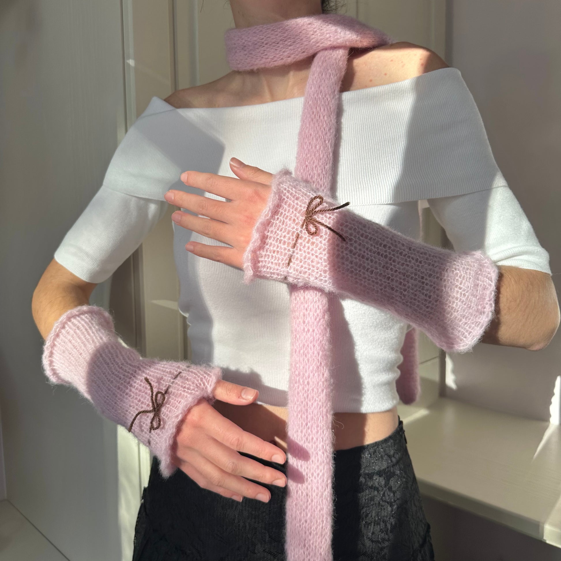 Handmade knitted mohair bow gloves in baby pink & brown - with thumb hole