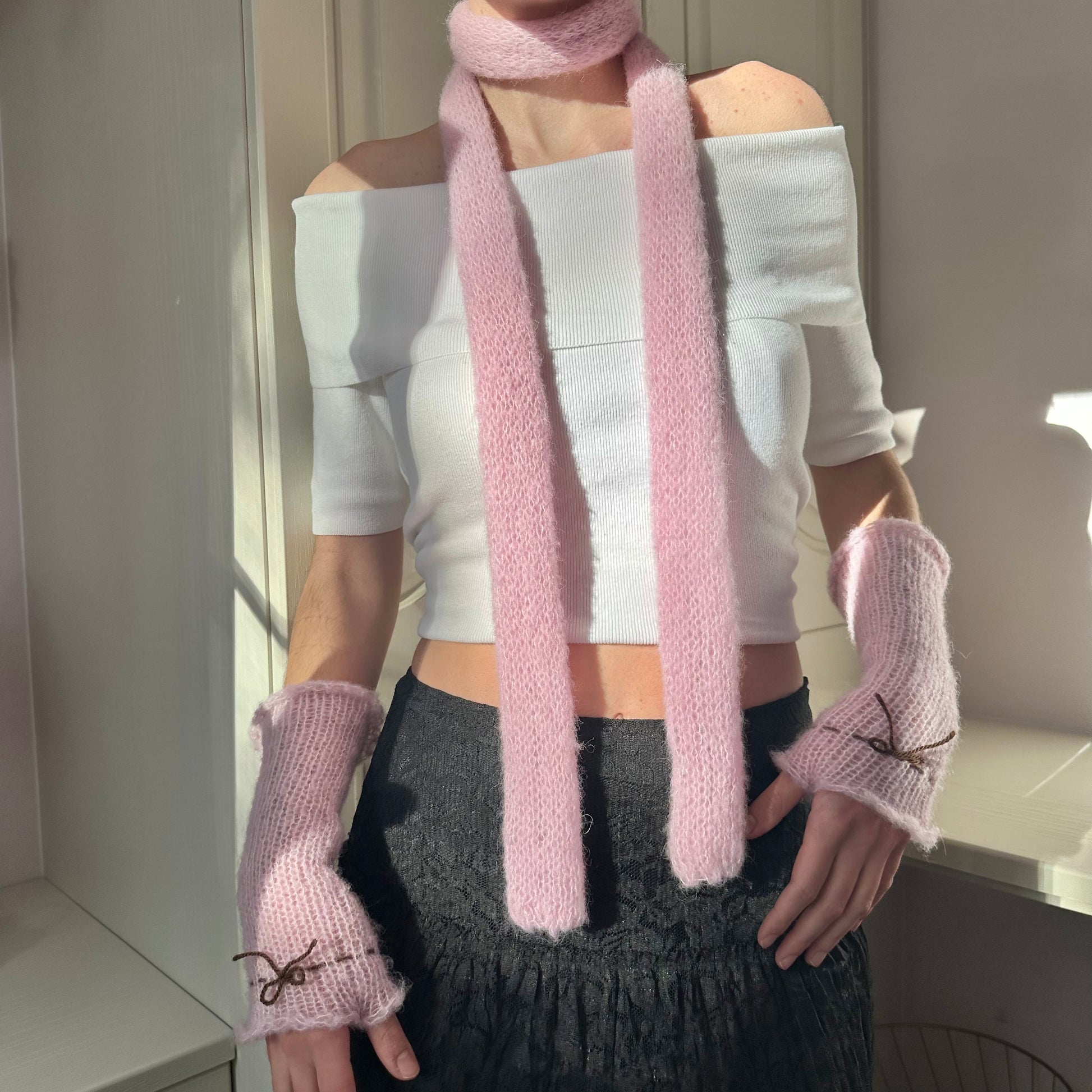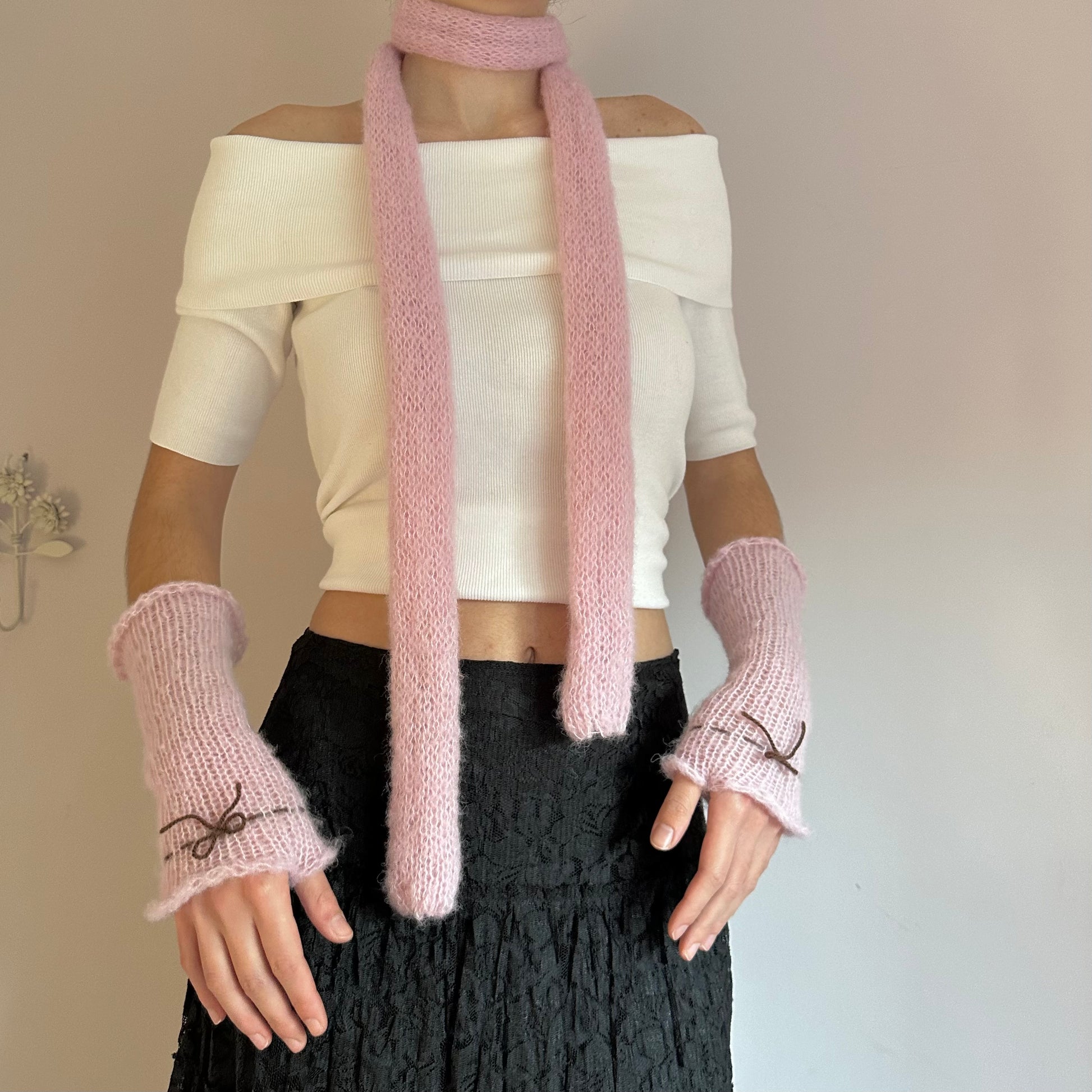The cutest baby pink mohair hand warmers with a brown bow 🎀