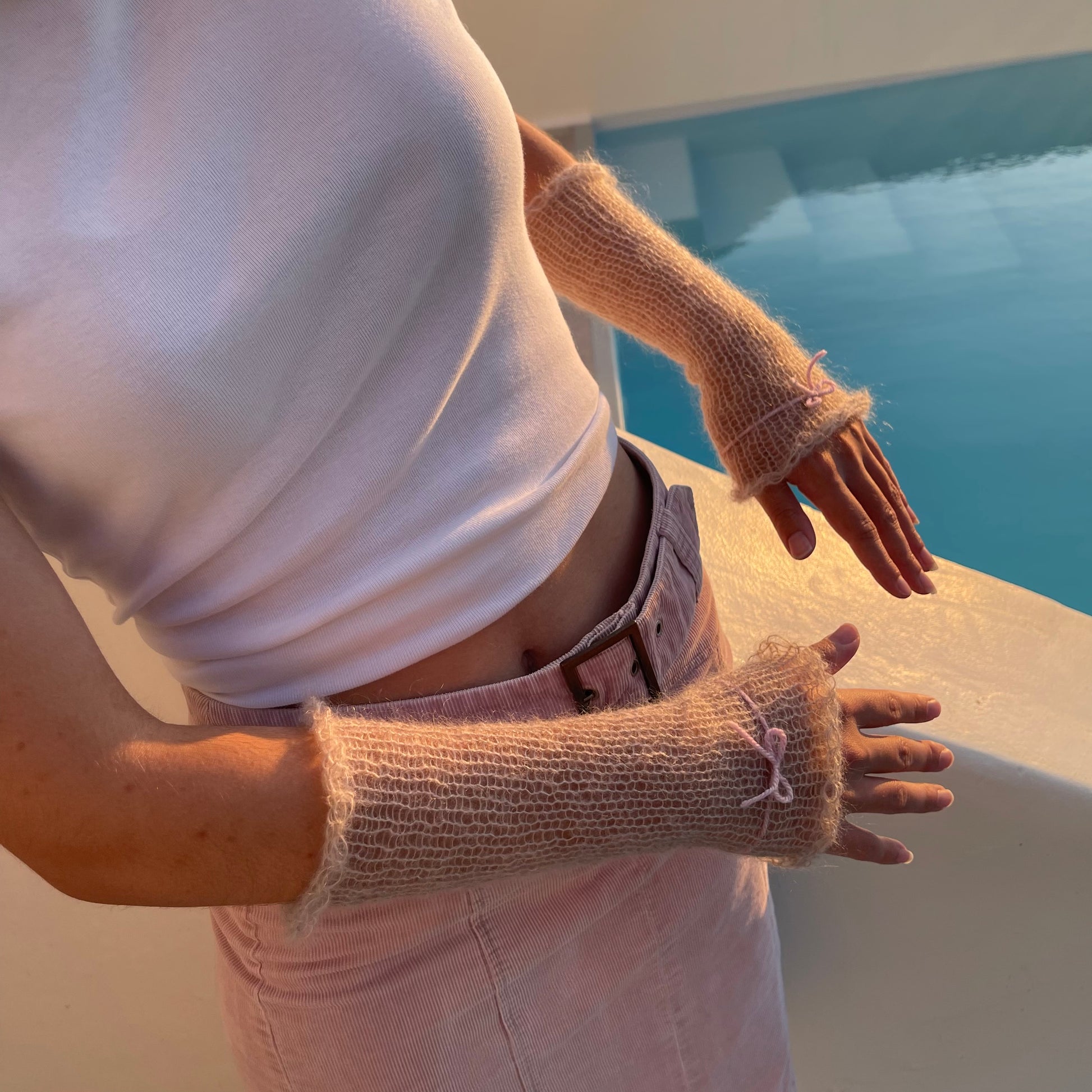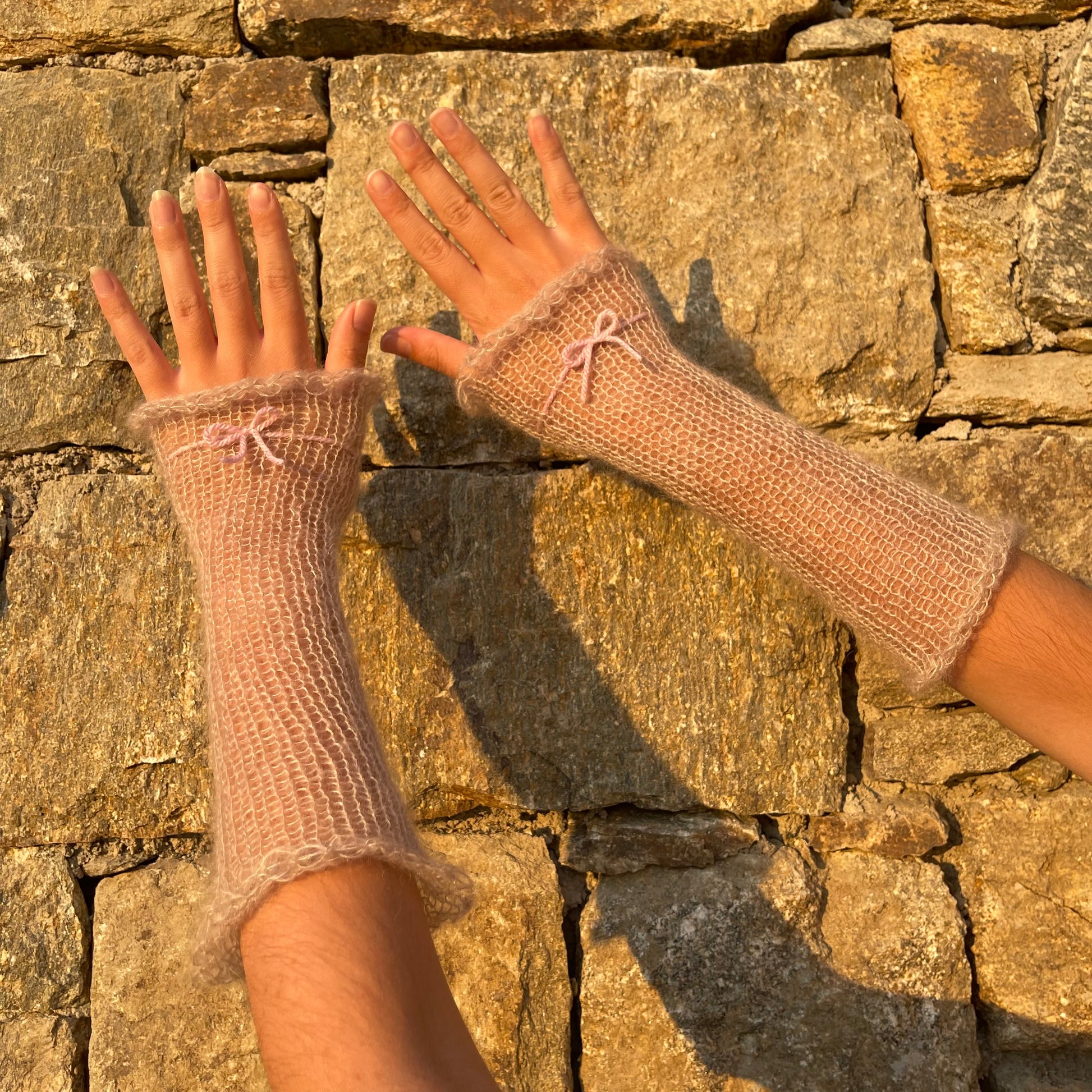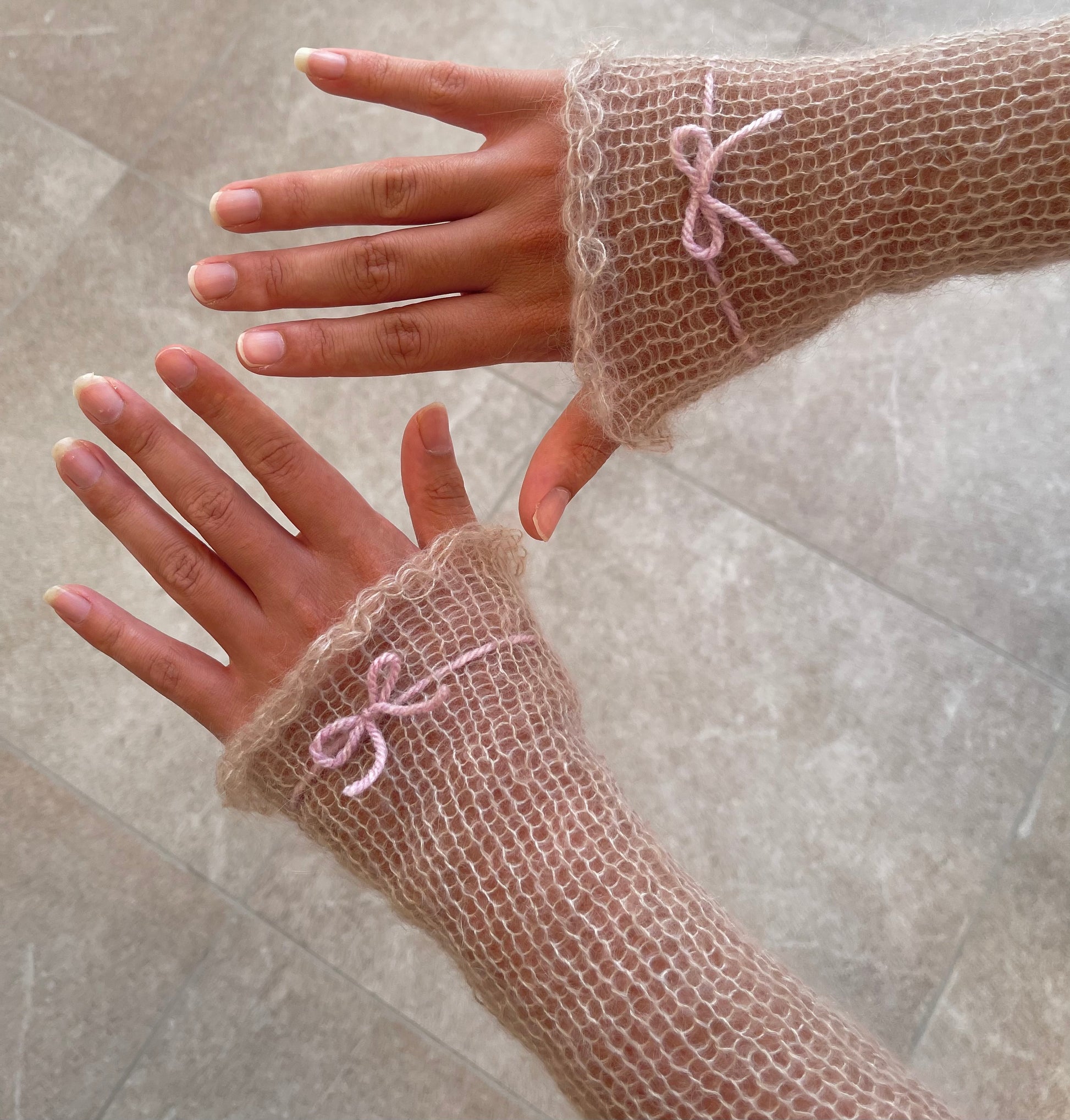 Handmade knitted mohair hand warmers in beige with dusky pink bow