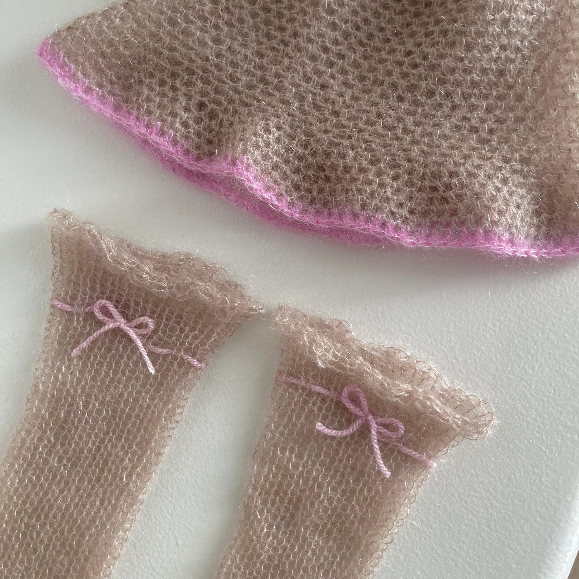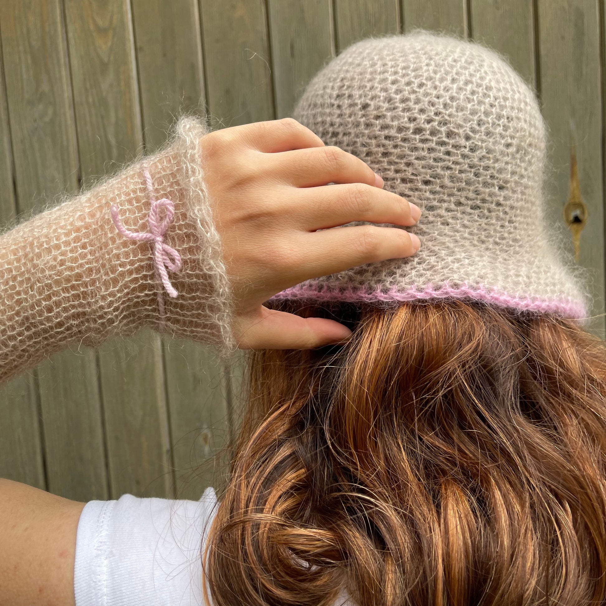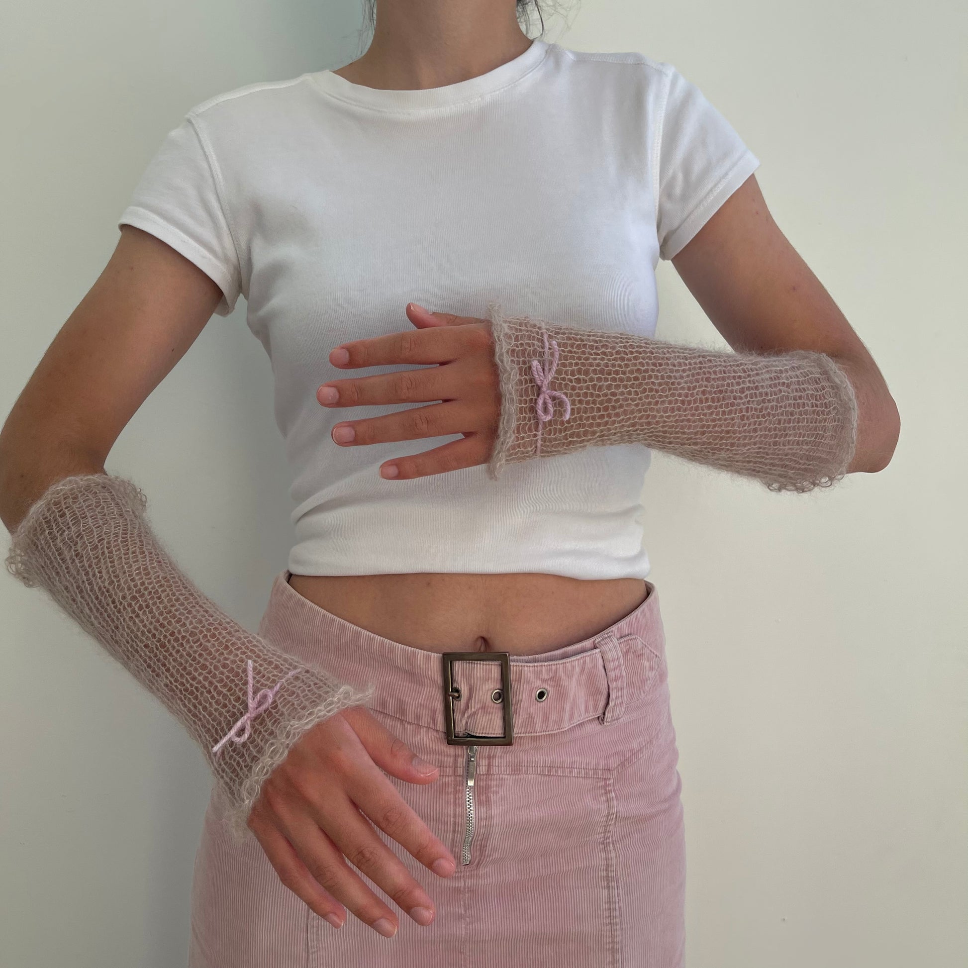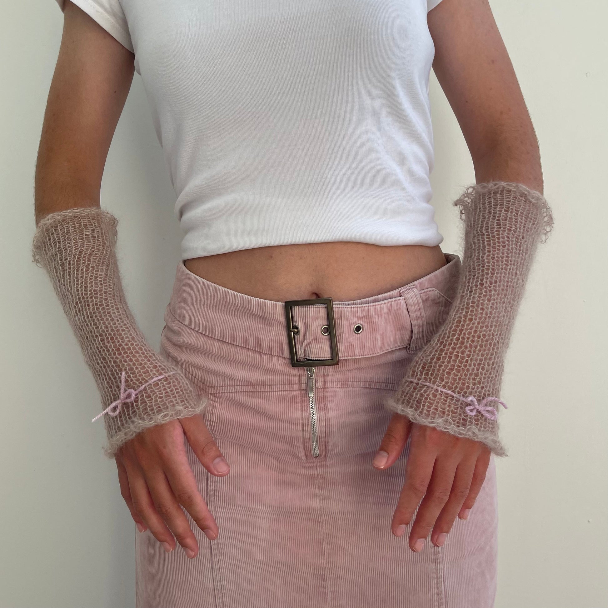 Handmade knitted mohair hand warmers in beige with dusky pink bow