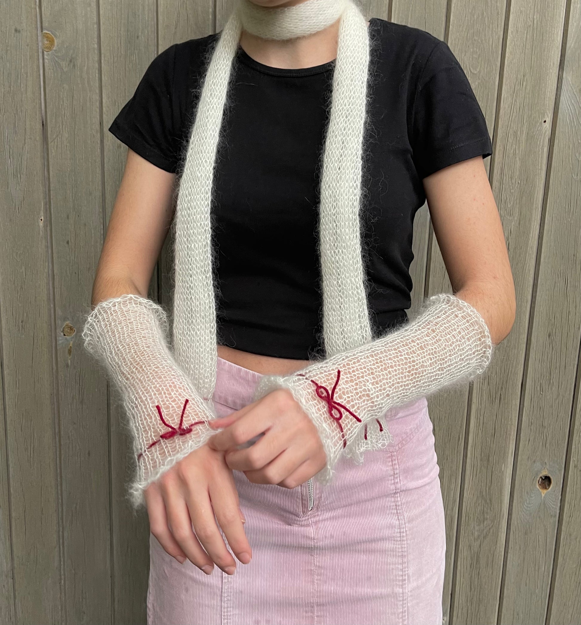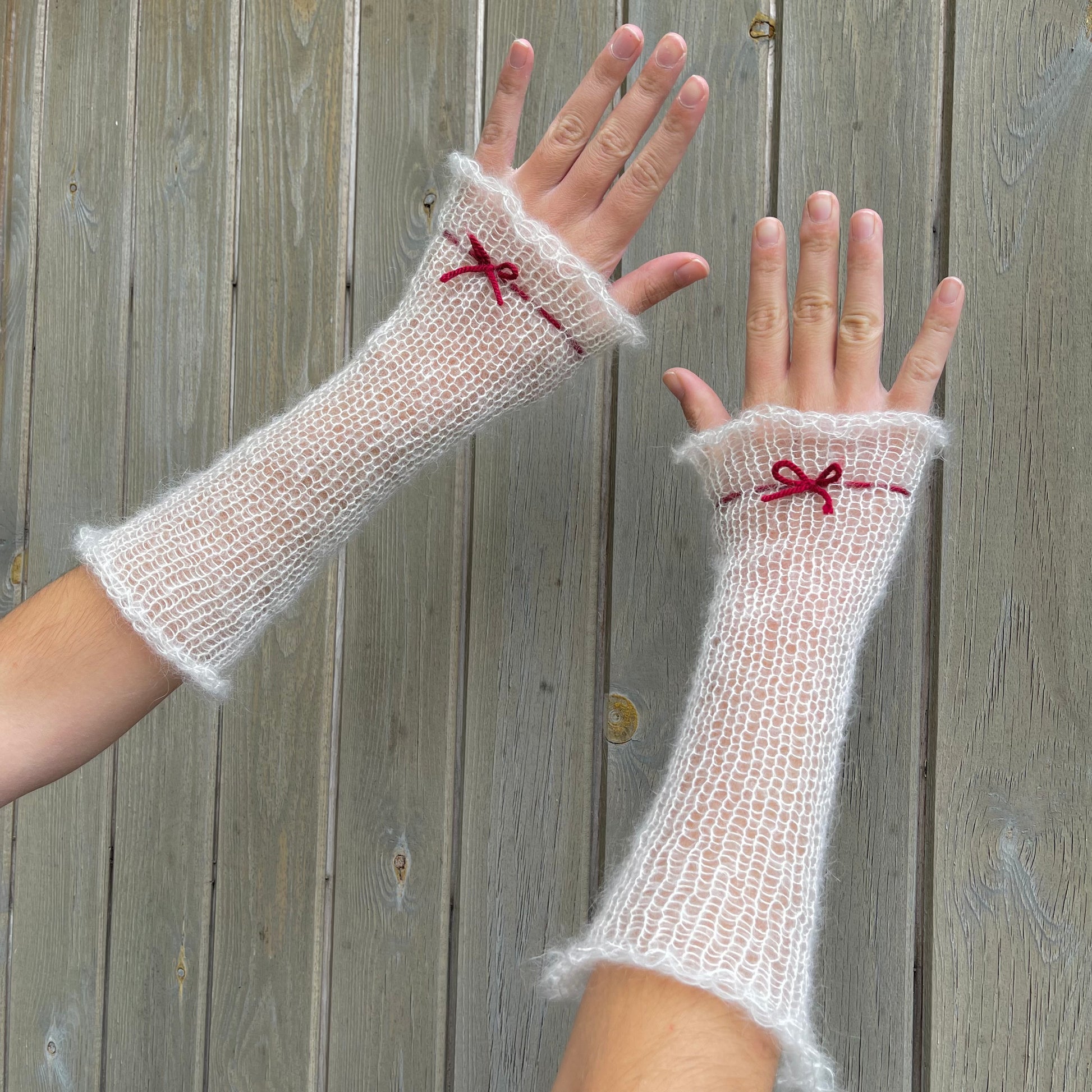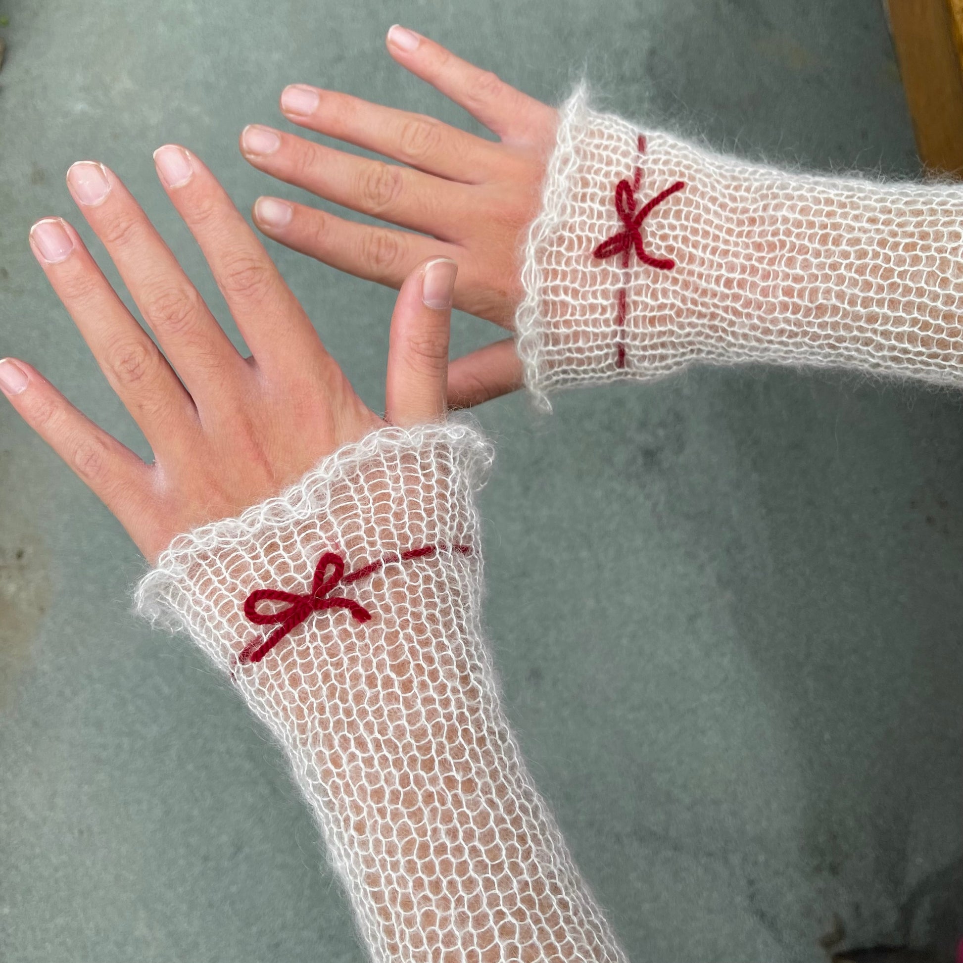 Handmade knitted mohair hand warmers in cream with dark red bow