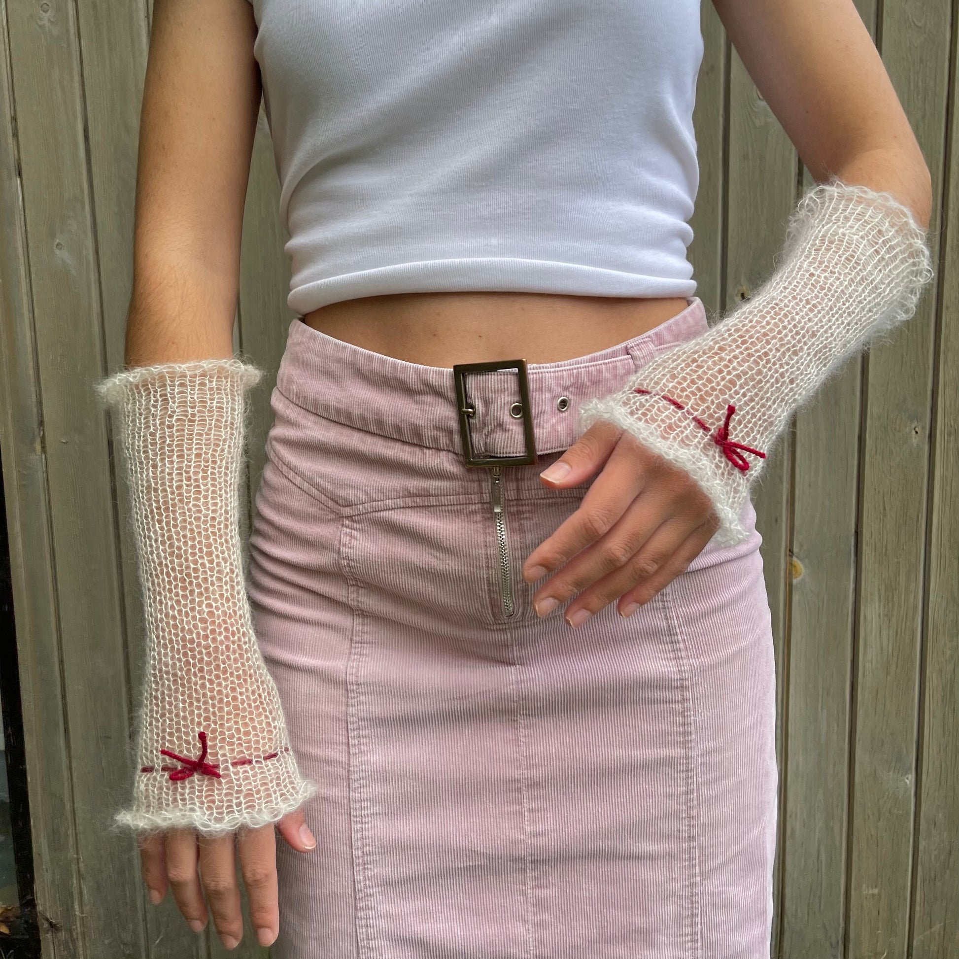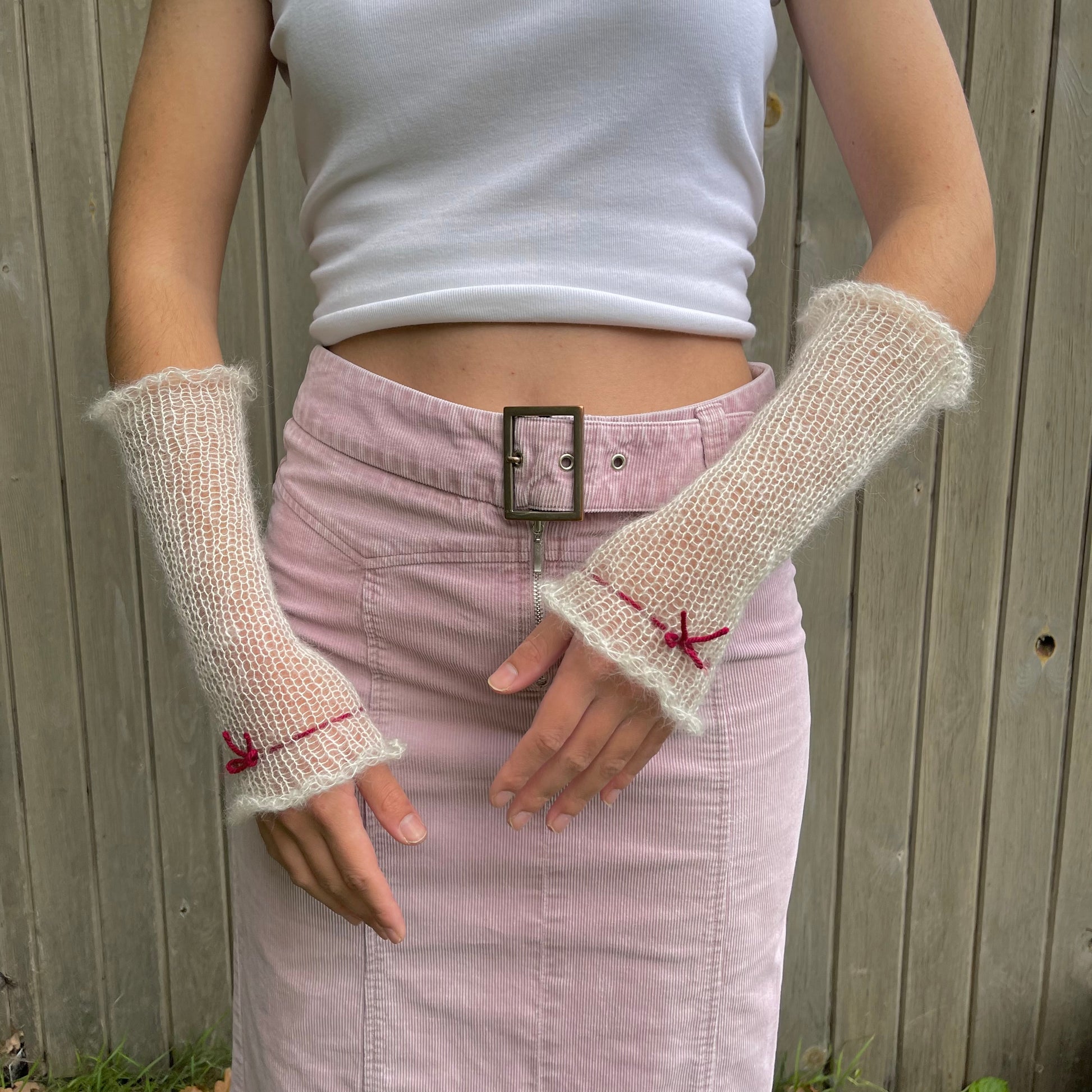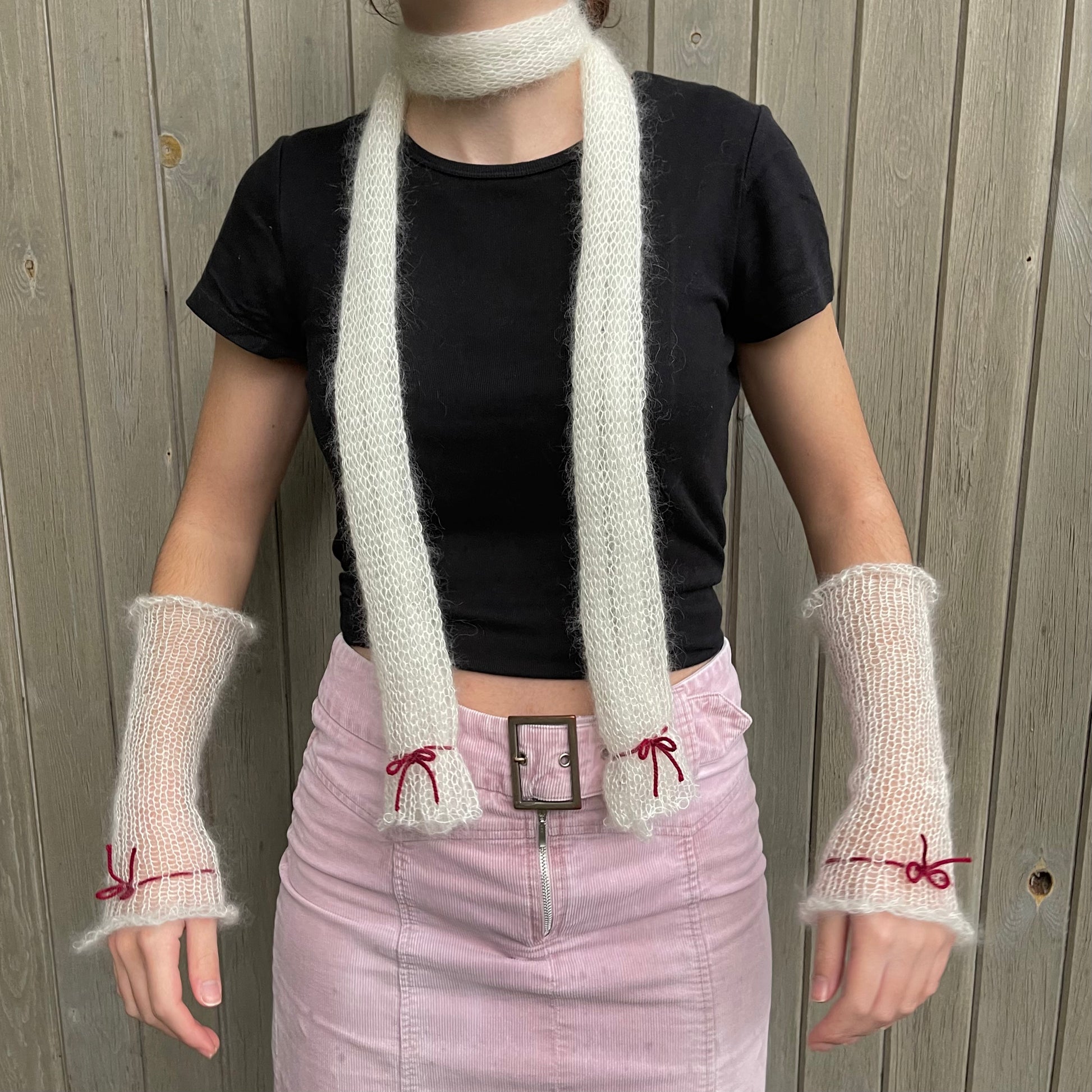 Handmade knitted mohair hand warmers in cream with dark red bow