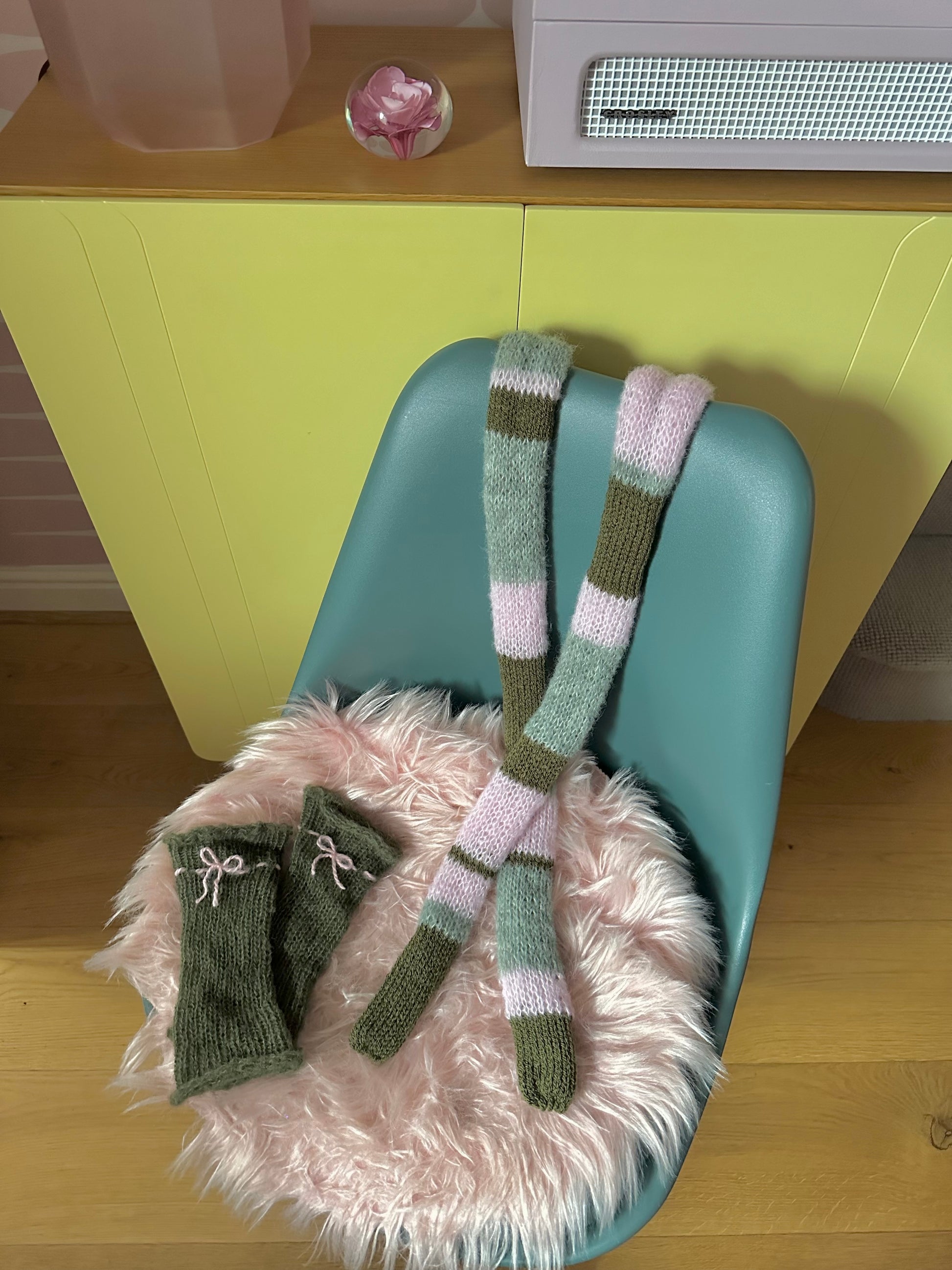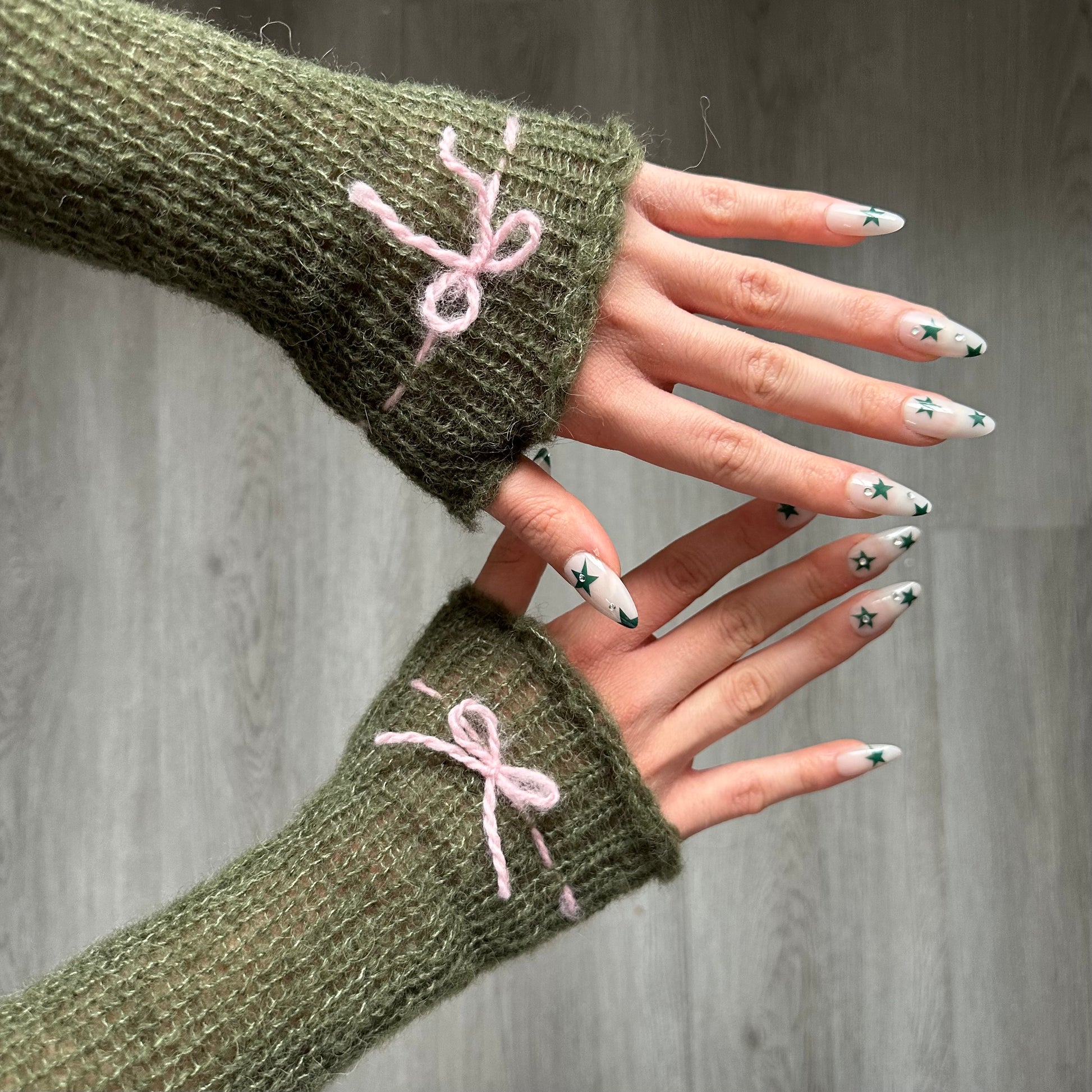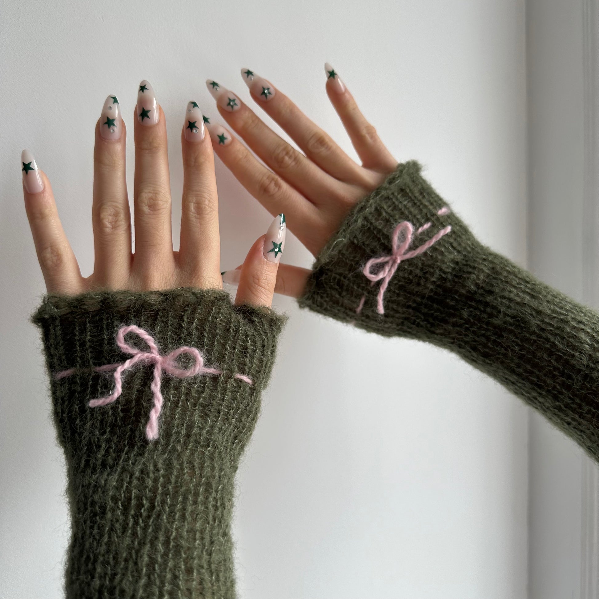 The cutest khaki green mohair bow hand warmers with a pastel pink bow 🎀