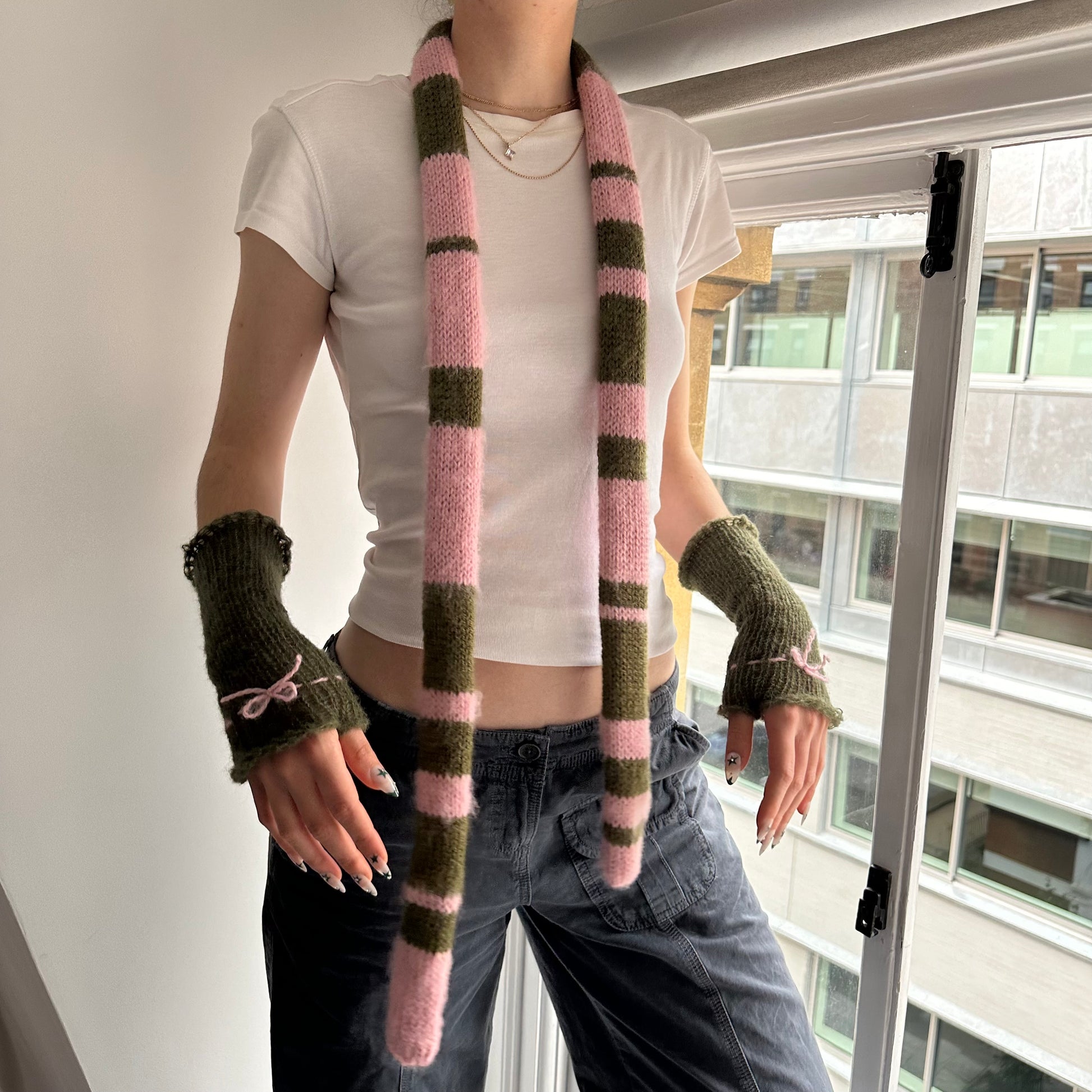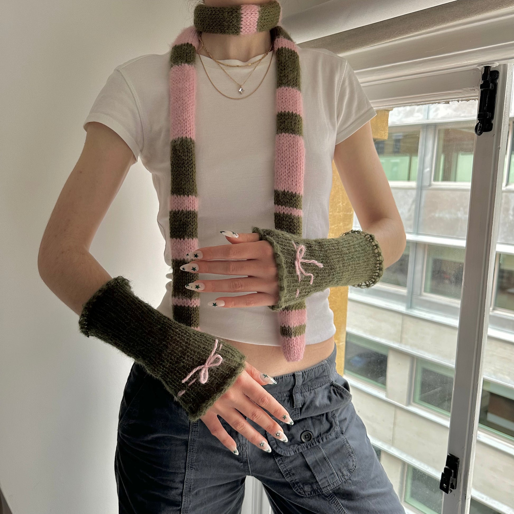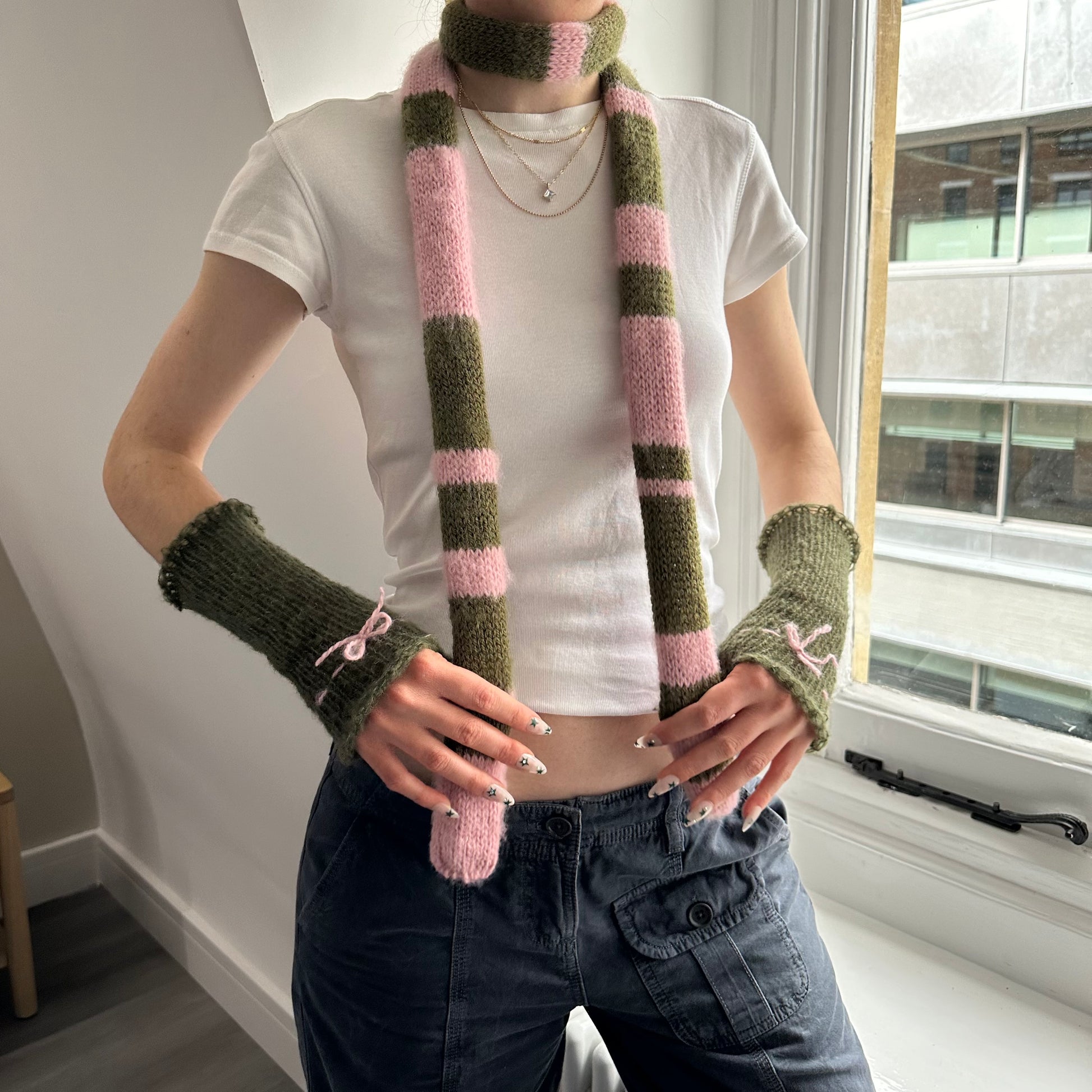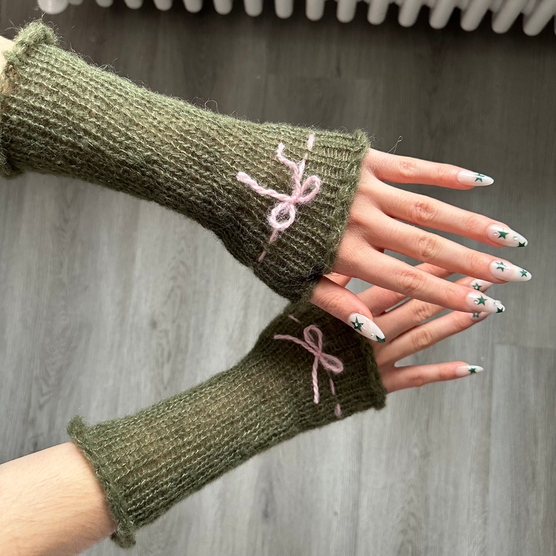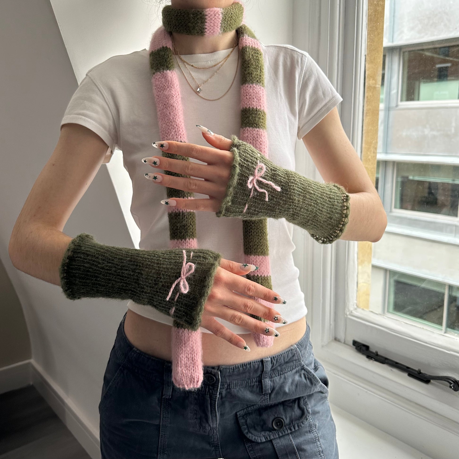 Handmade knitted mohair bow gloves in khaki green & baby pink - with thumb hole