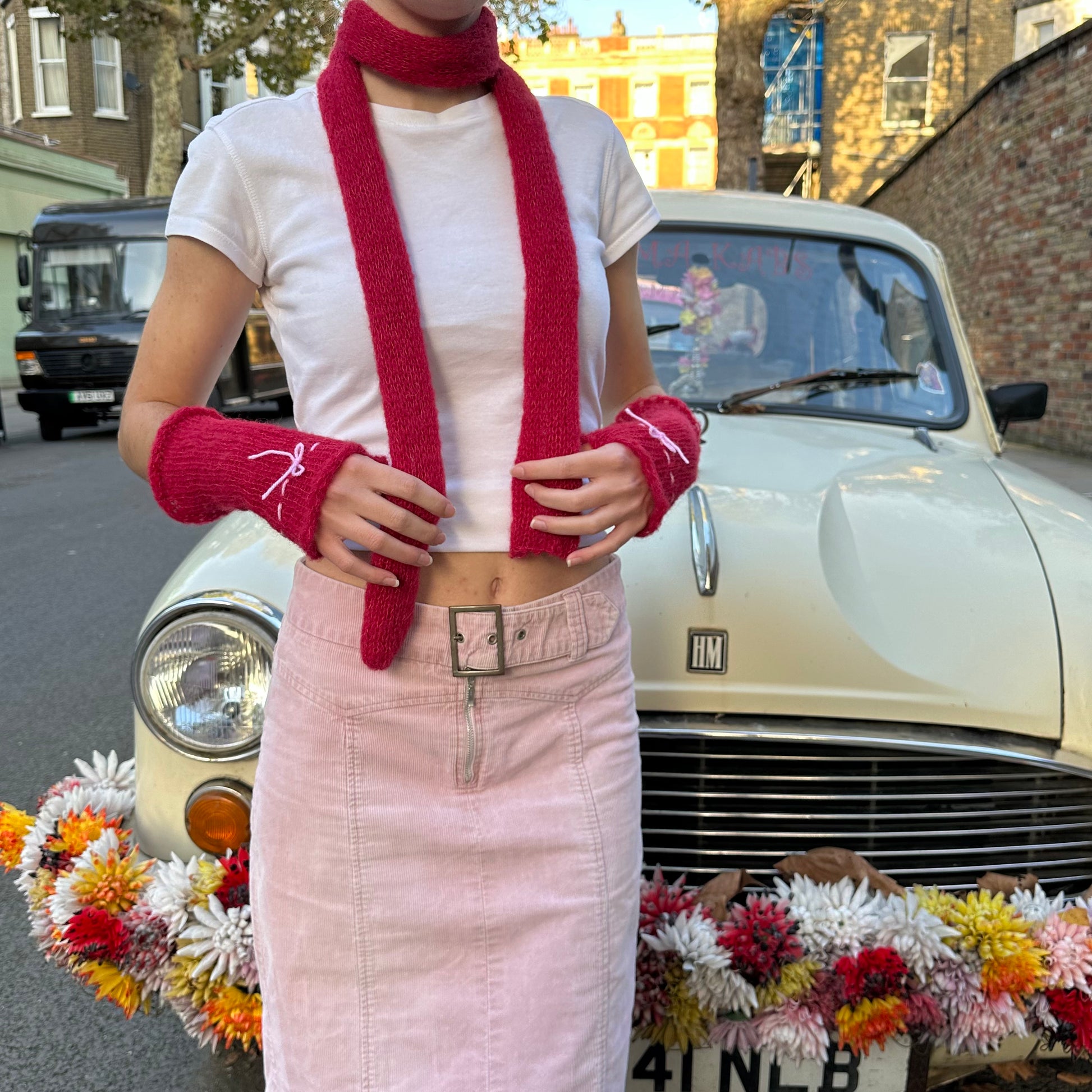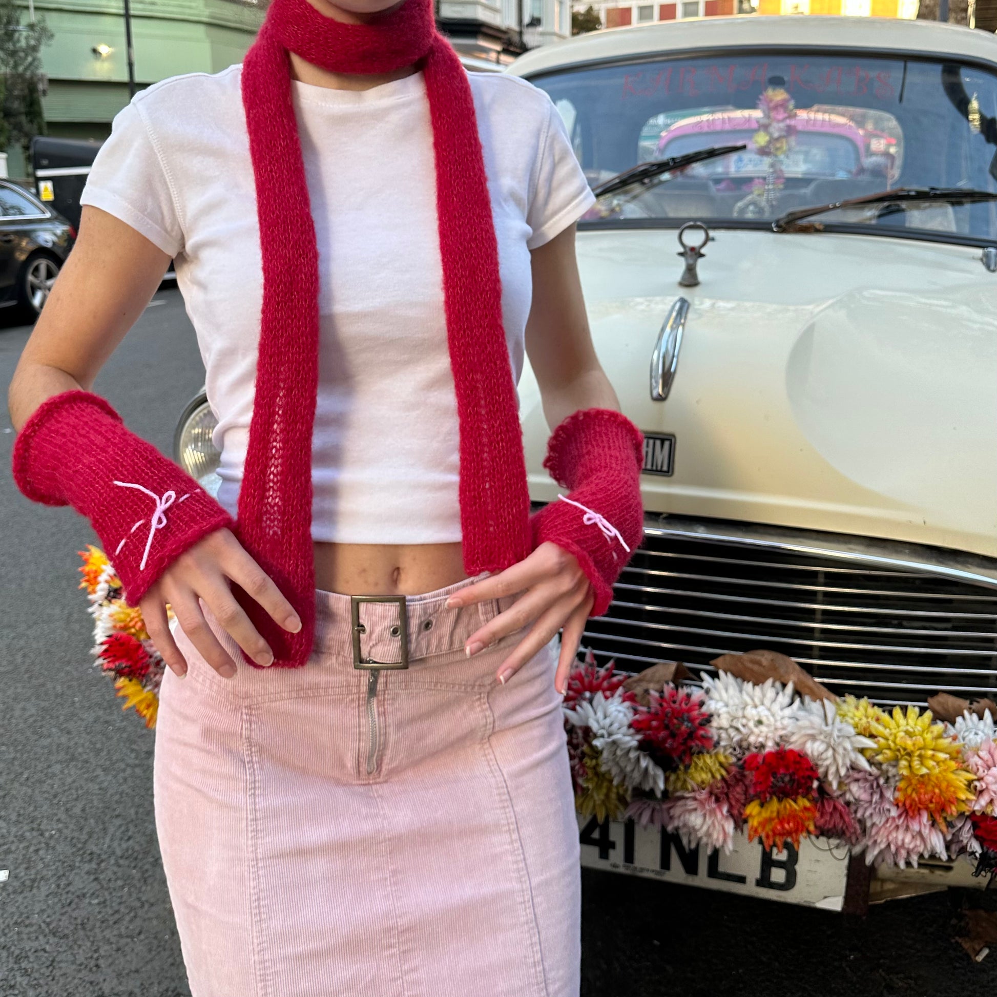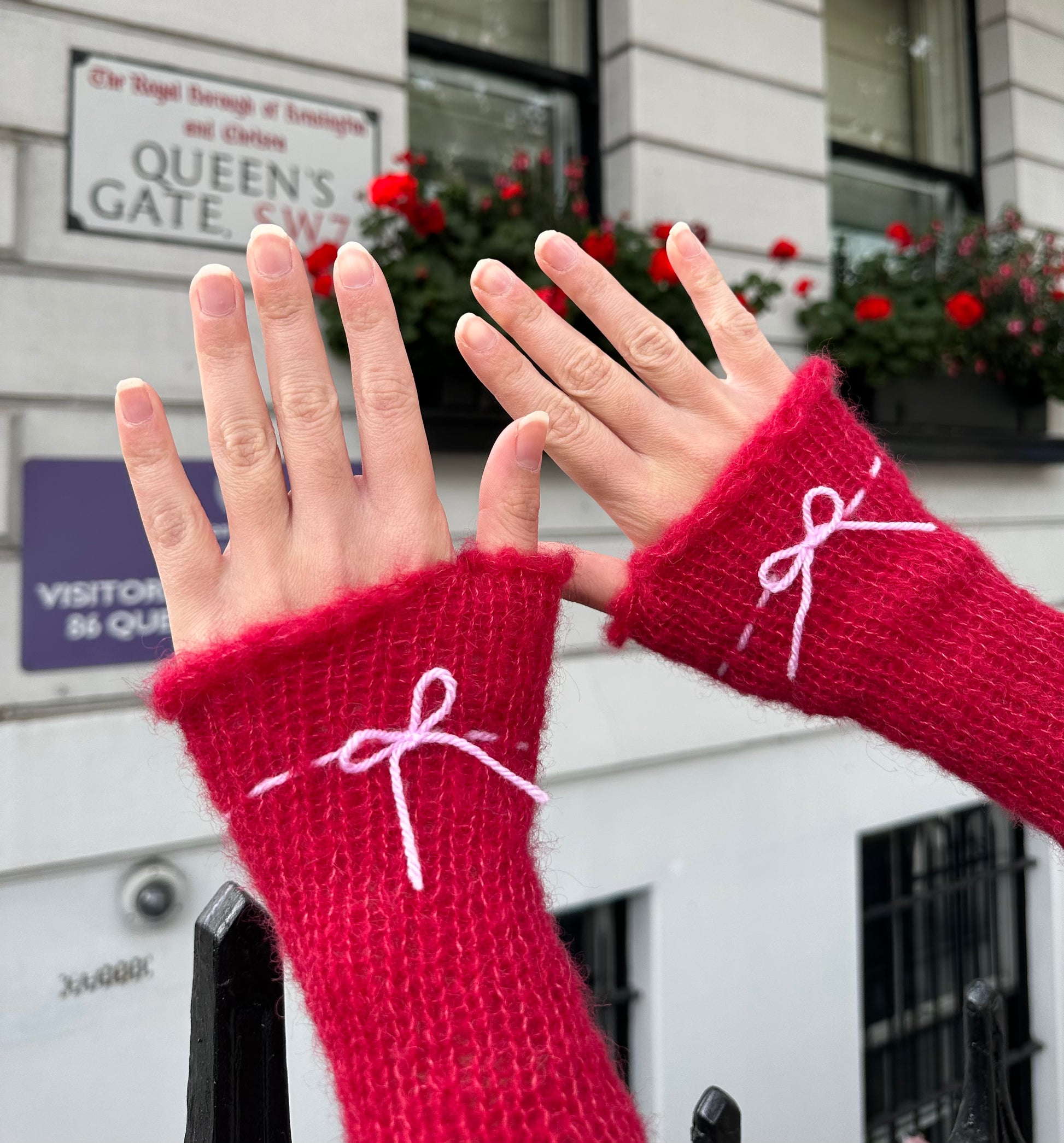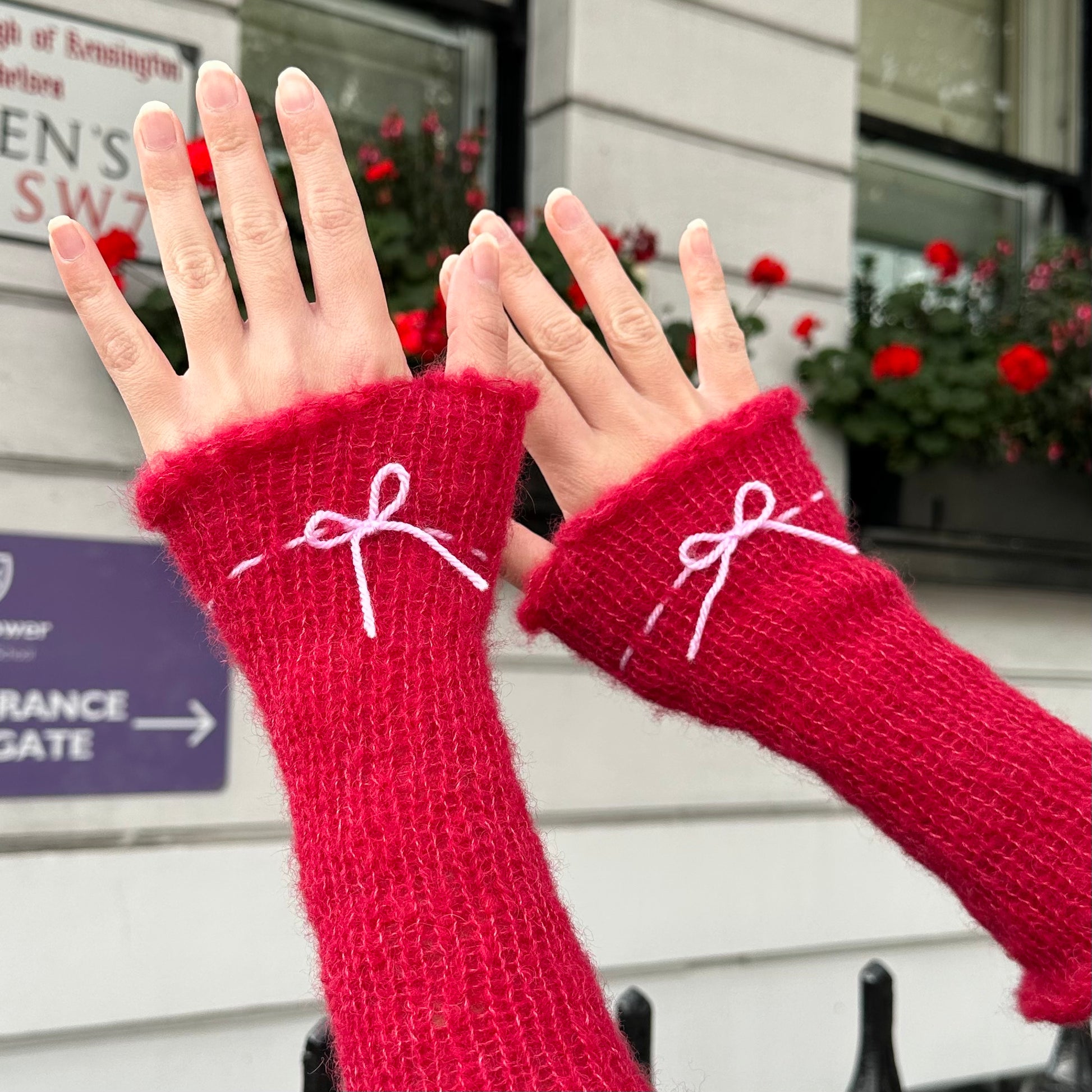 Handmade knitted mohair bow gloves in red & baby pink - with thumb hole