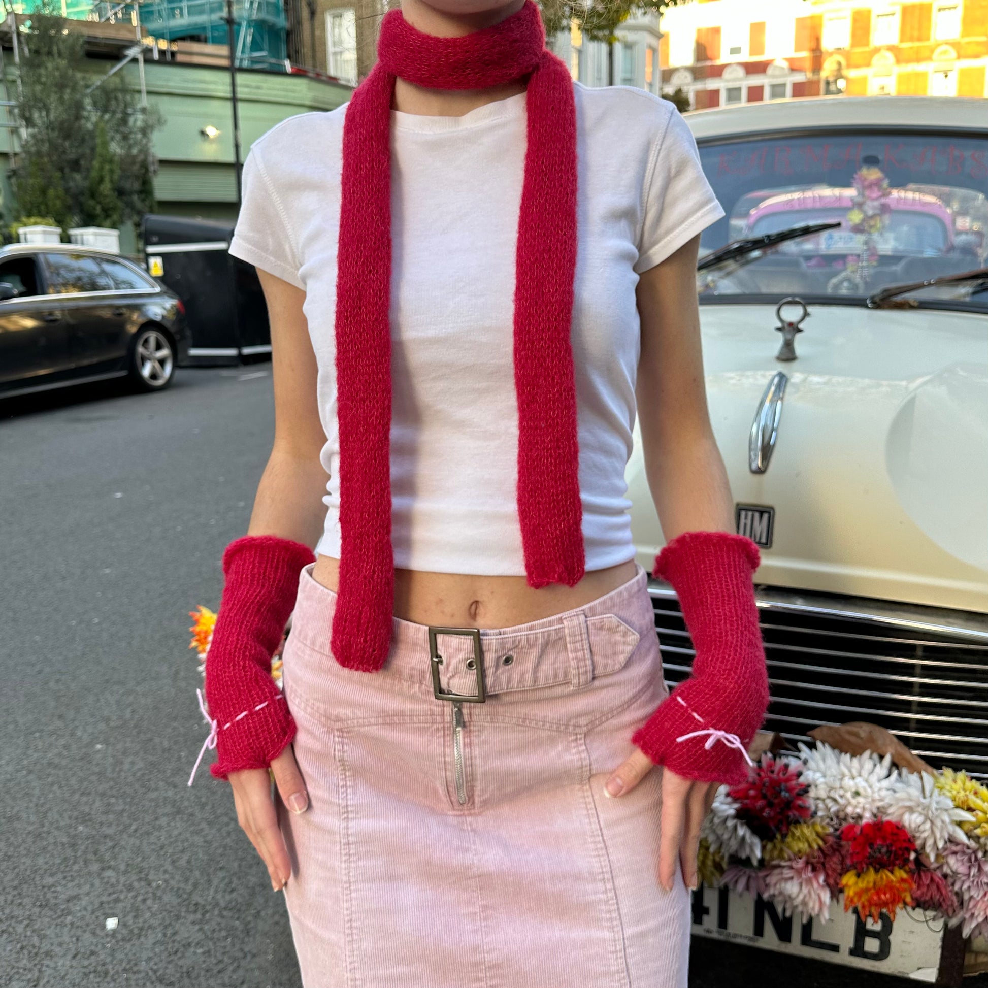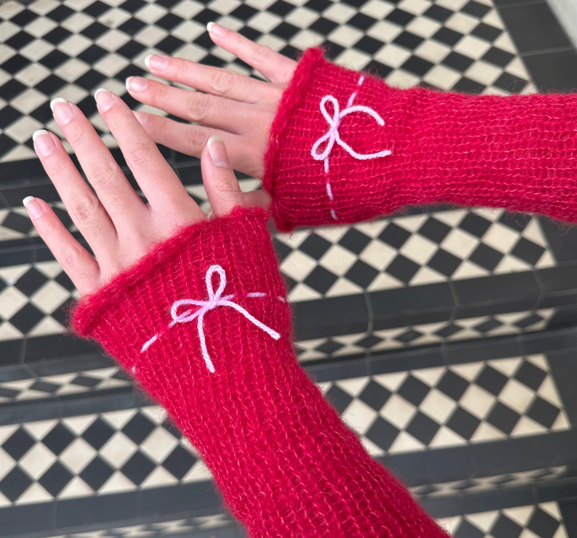 The cutest red mohair hand warmers with a baby pink bow ❤️🎀