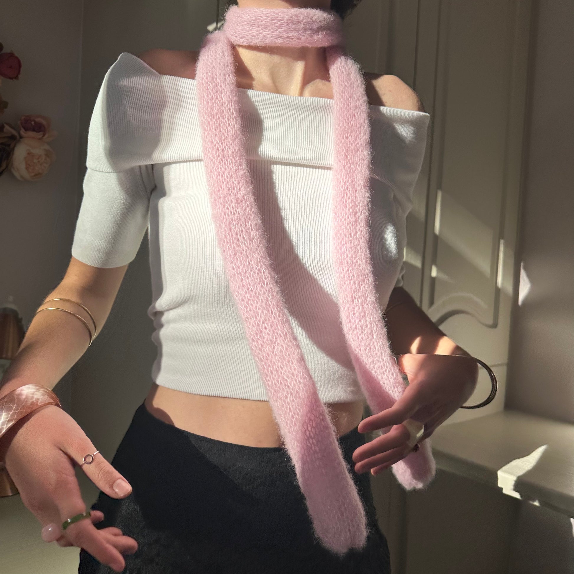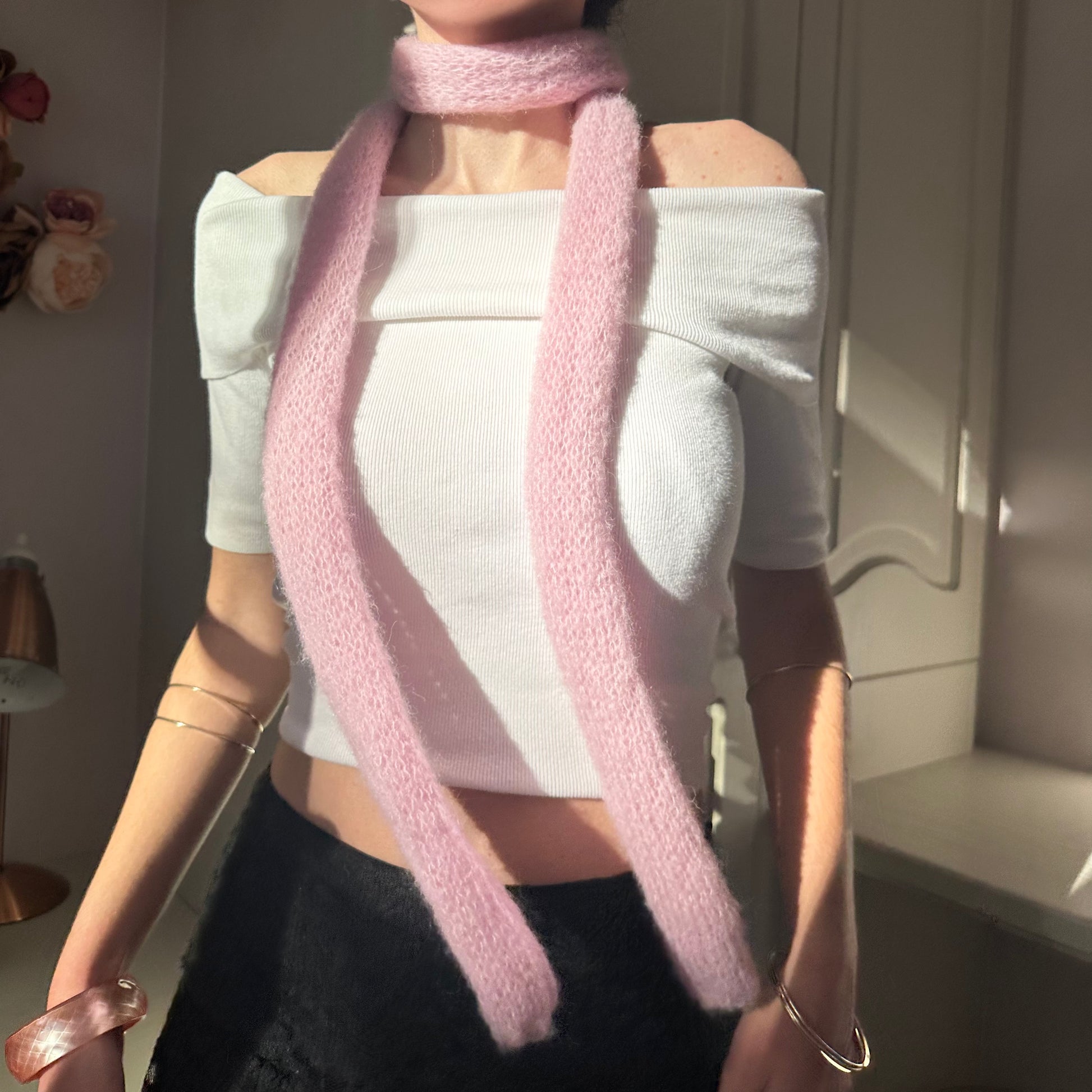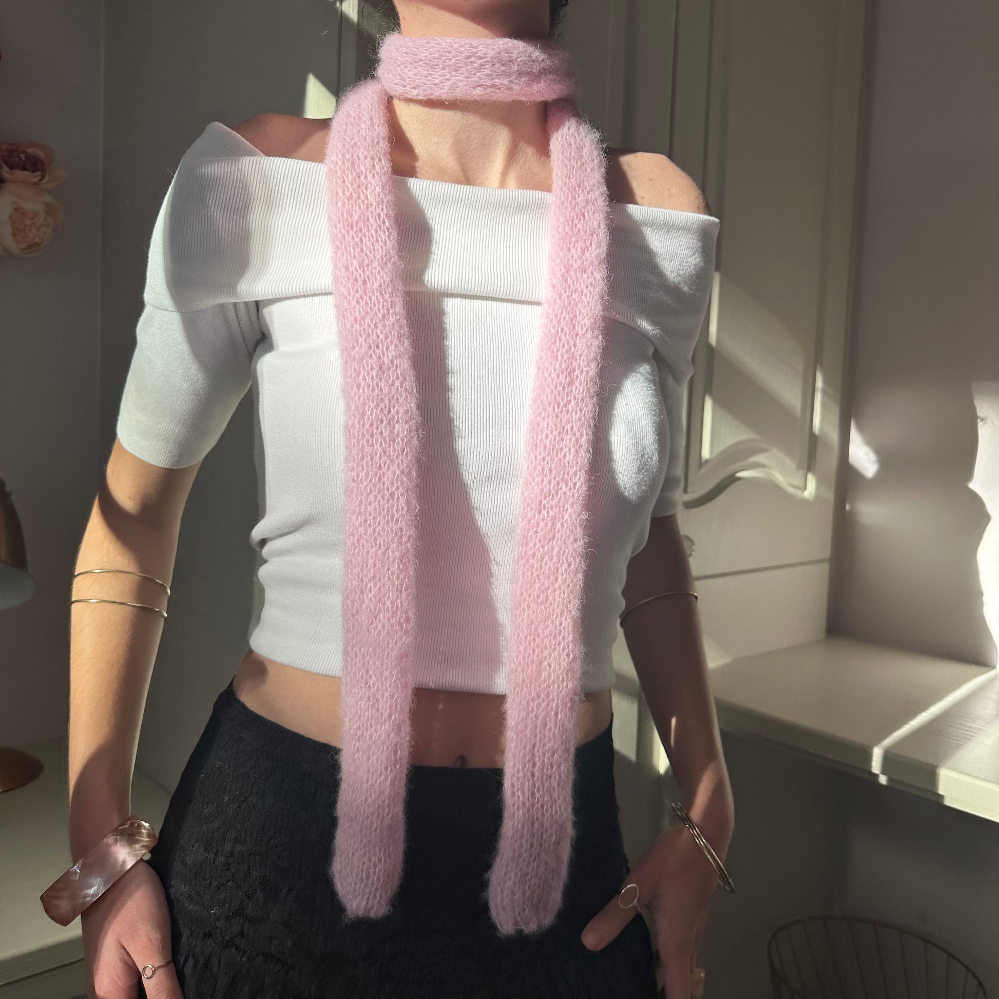 Knit mohair skinny scarf in a gorgeous pink colour, the perfect addition to your outfit and really flattering. Great for all year round! 🌸