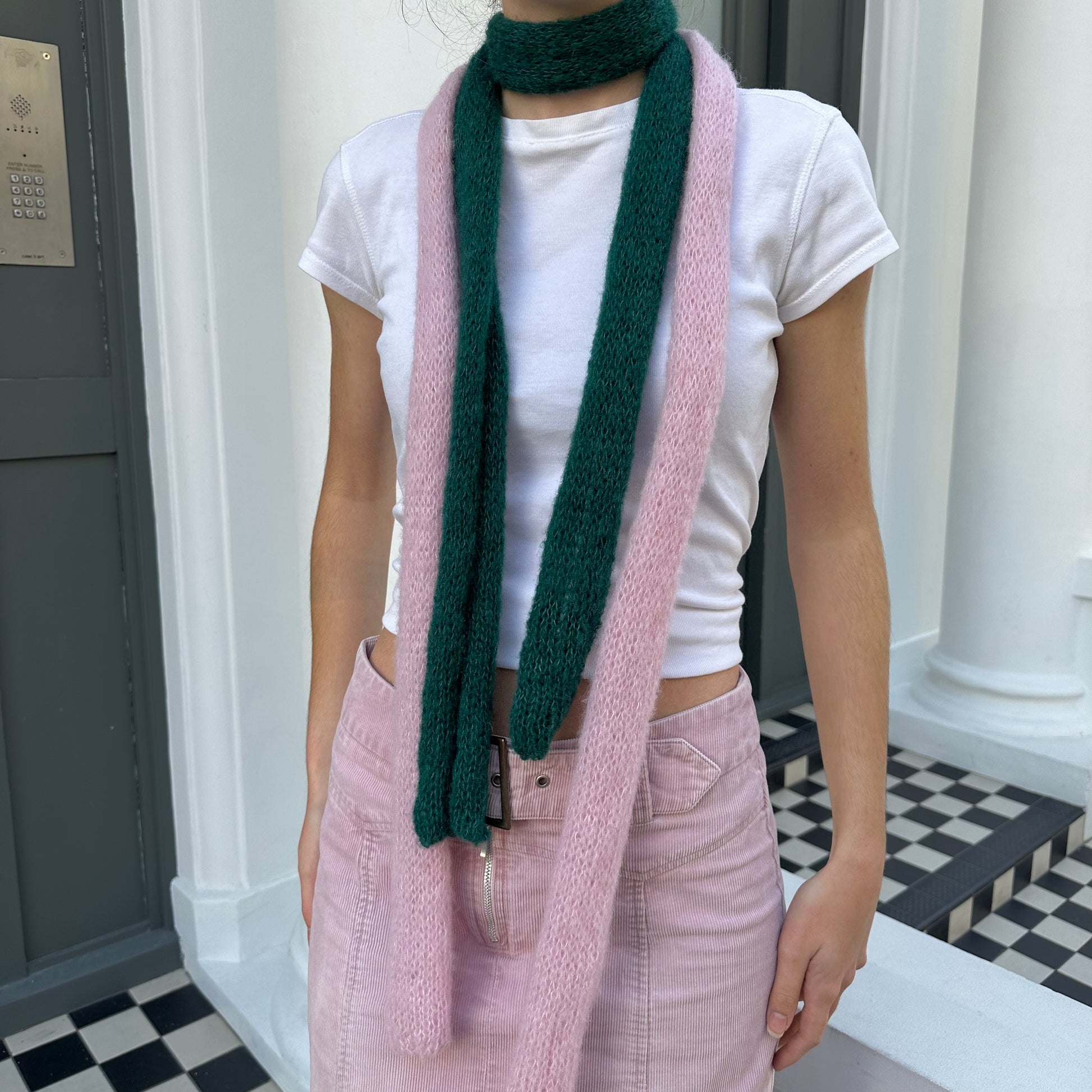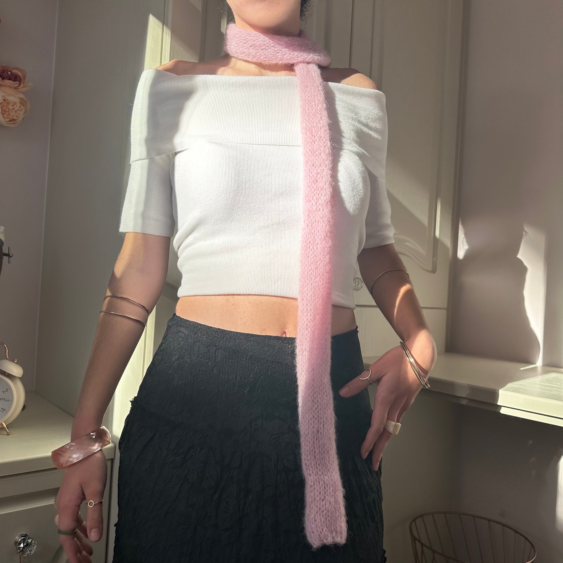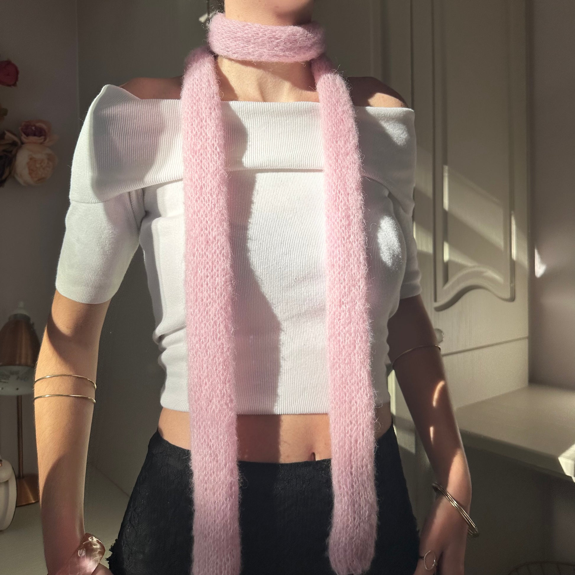 Knit mohair skinny scarf in a gorgeous pink colour, the perfect addition to your outfit and really flattering. Great for all year round! 🌸
