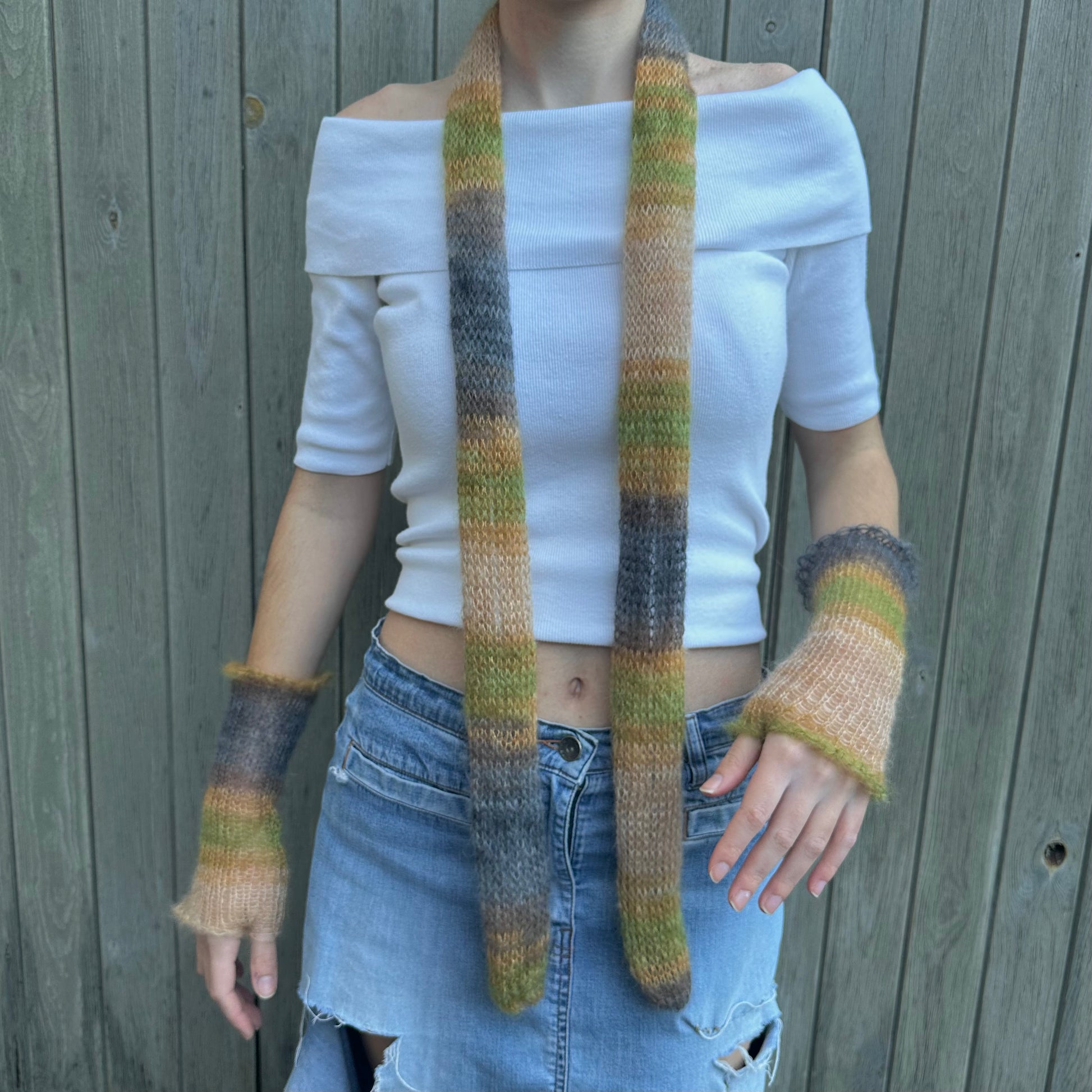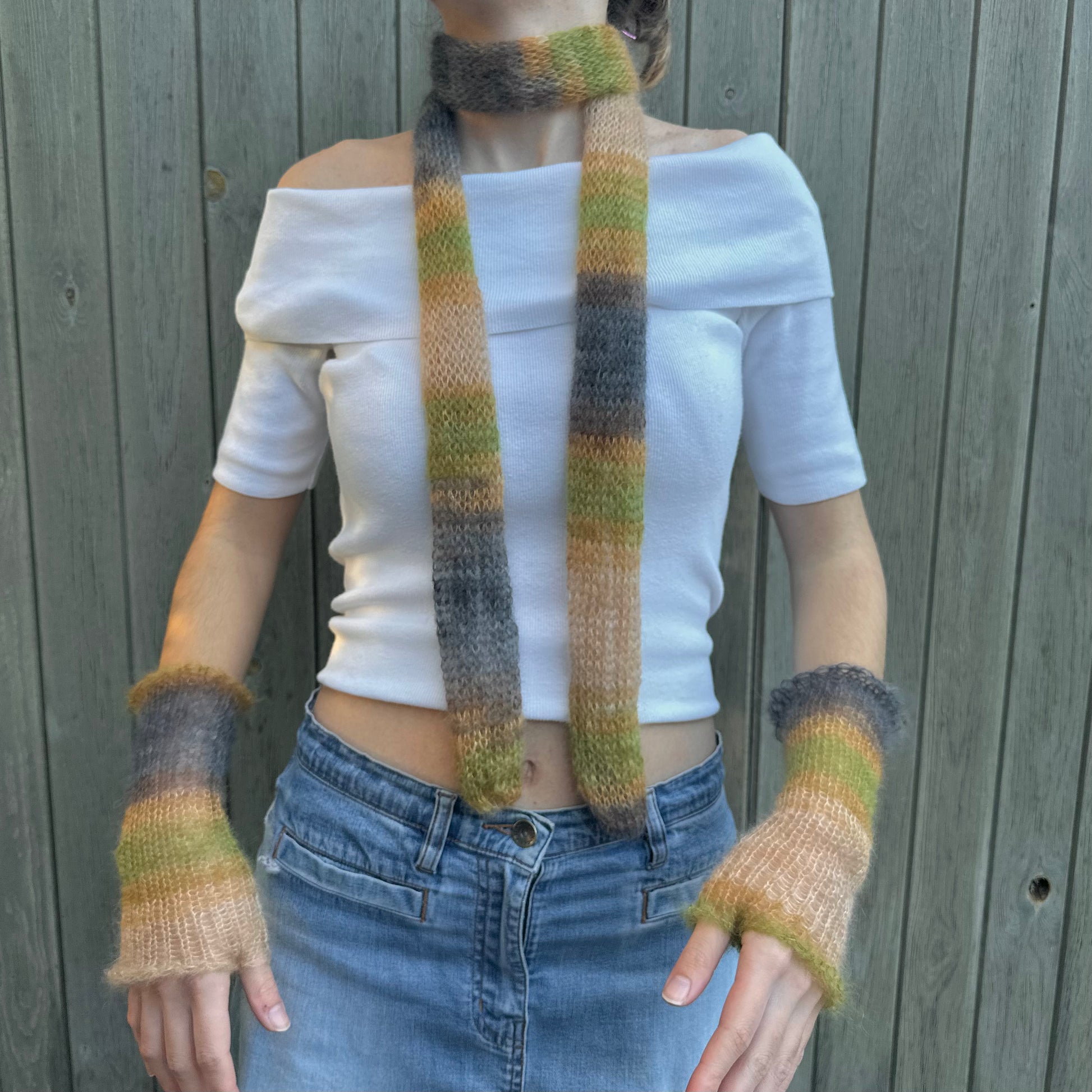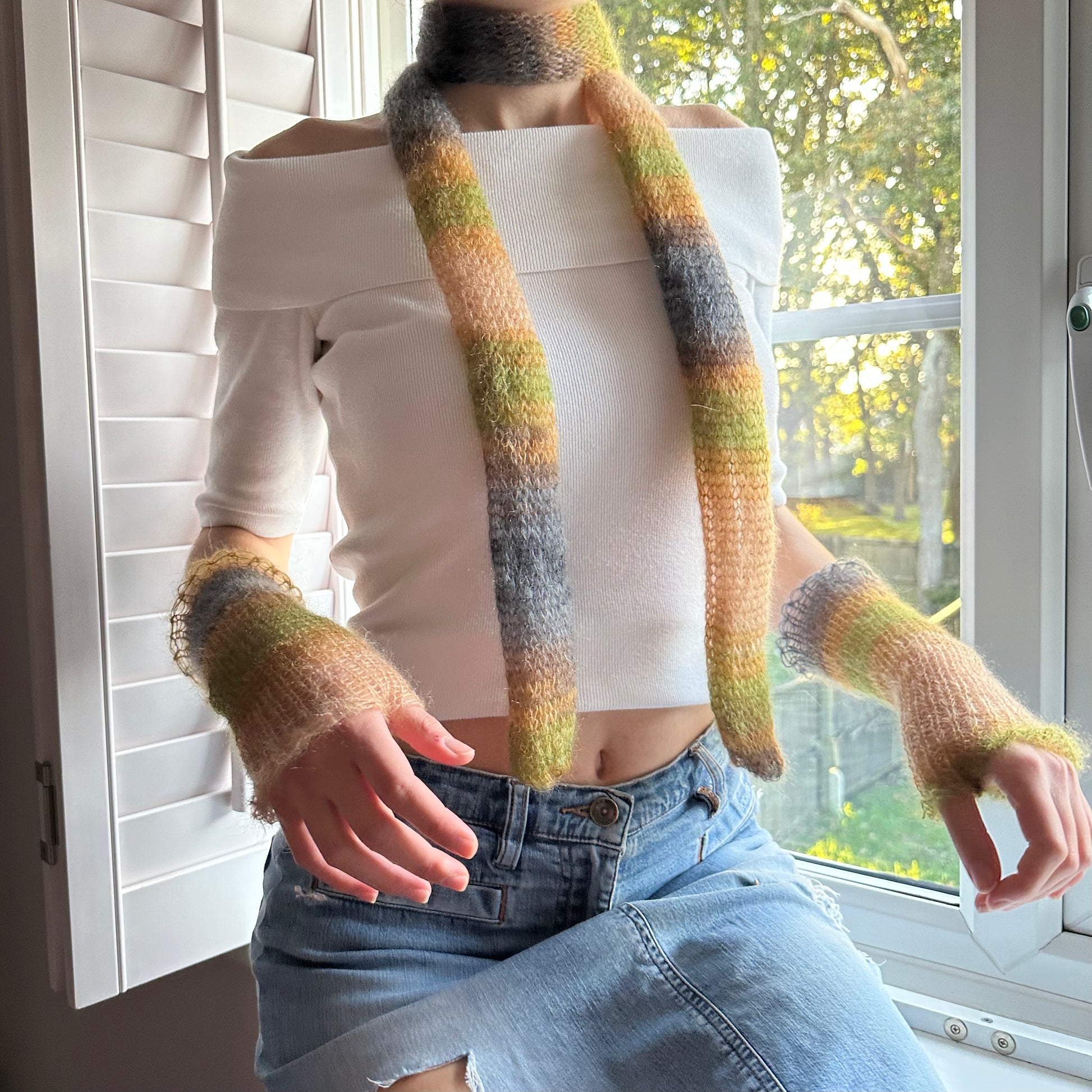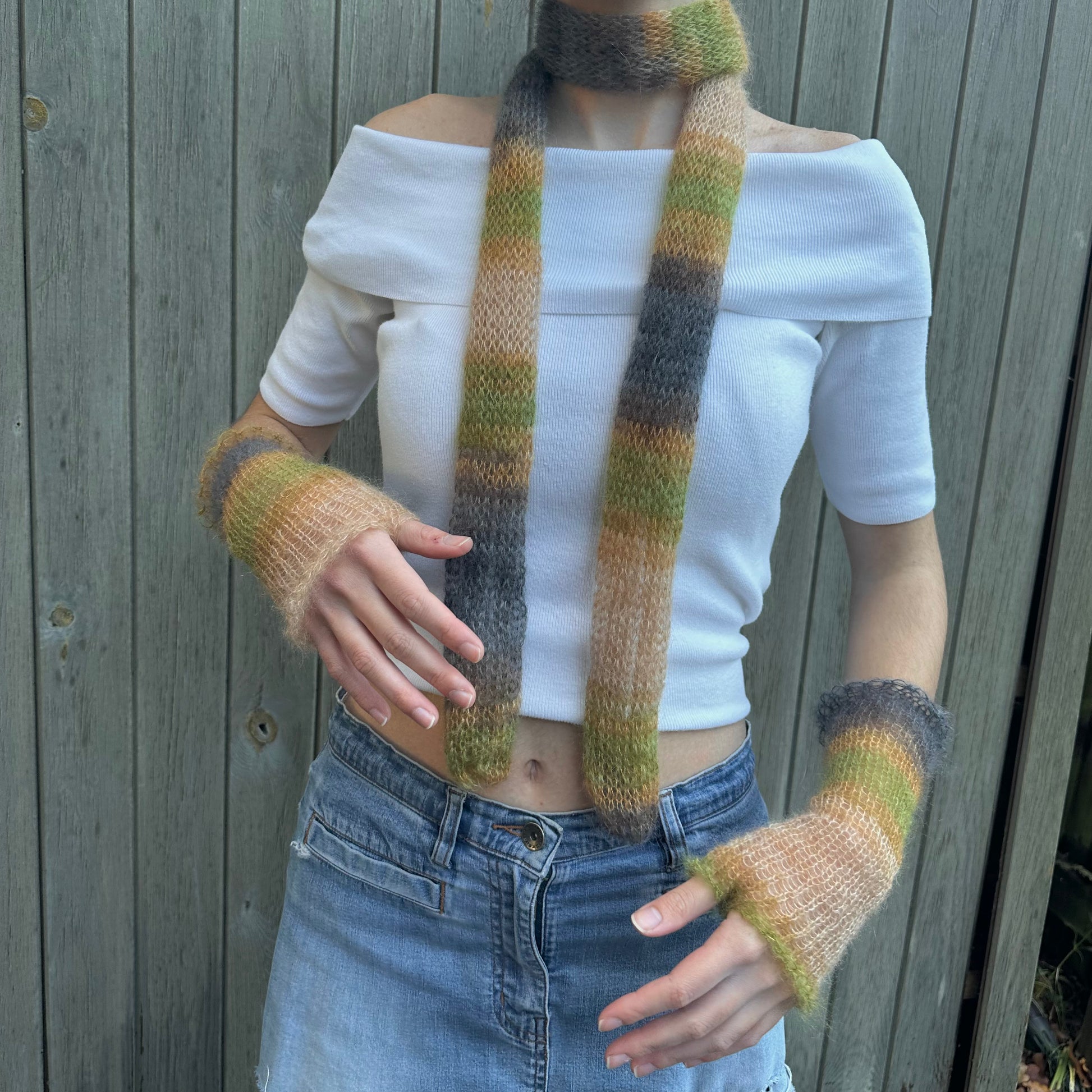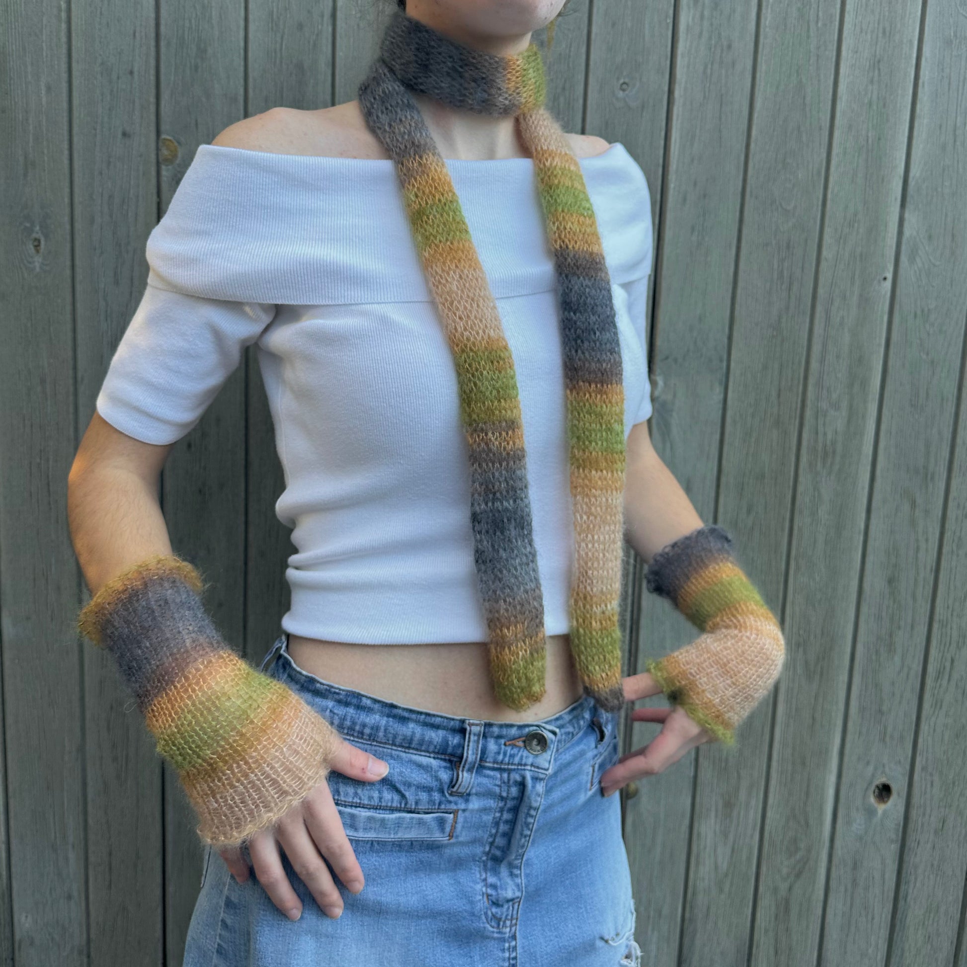 Handmade knitted mohair skinny scarf in ombré earth tones