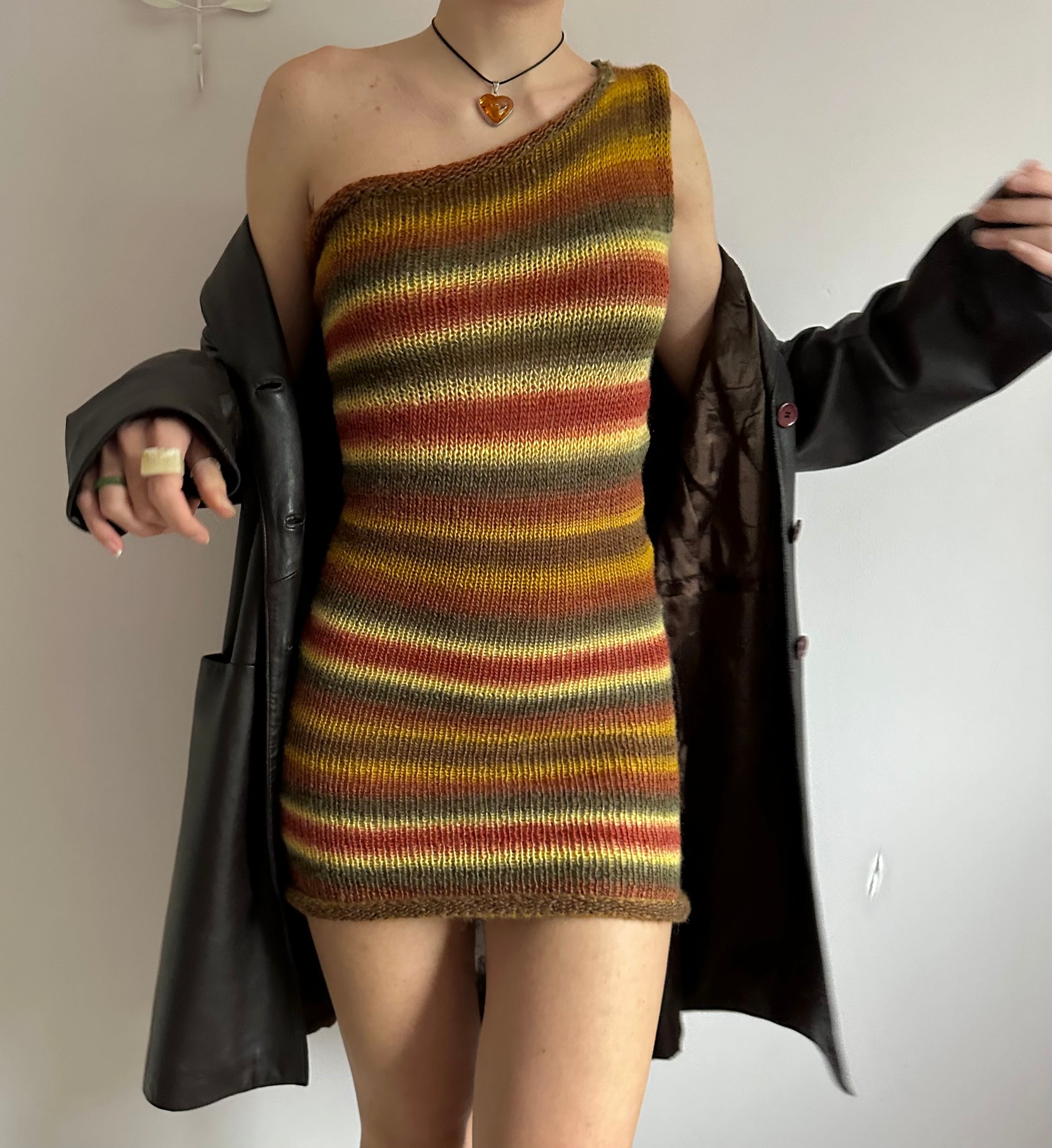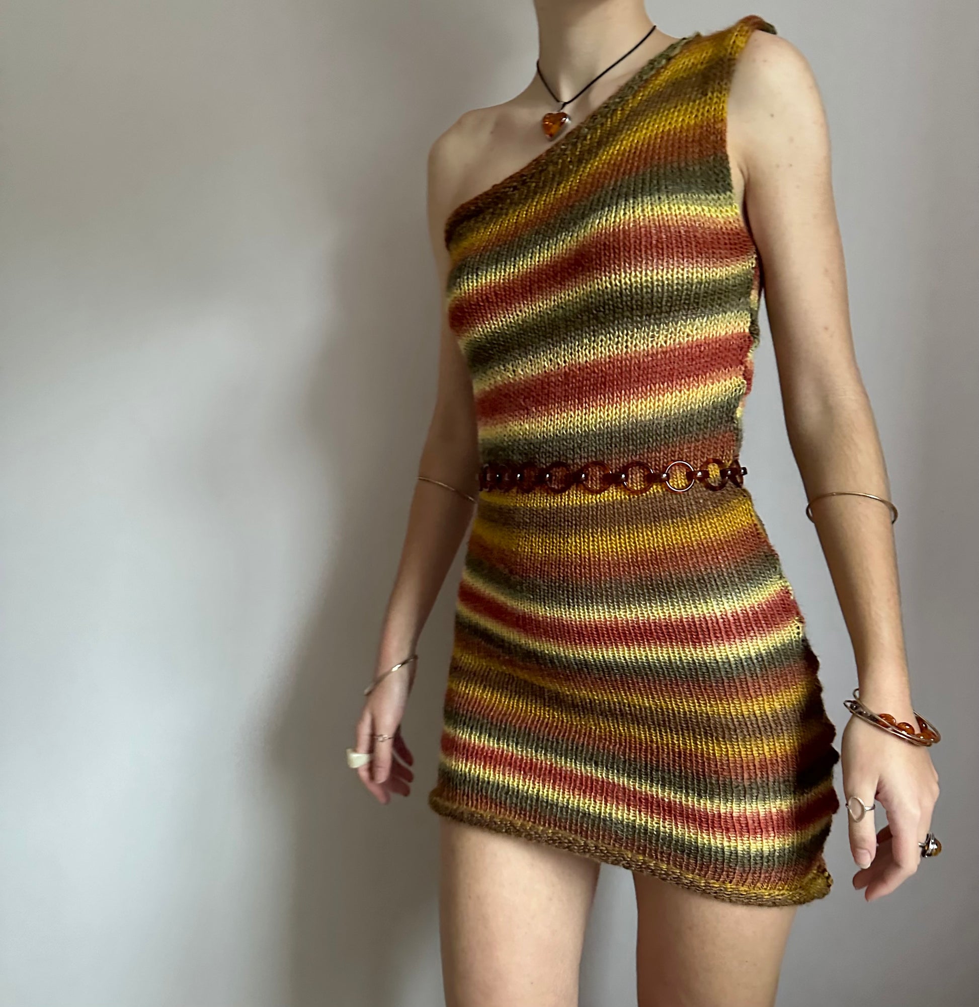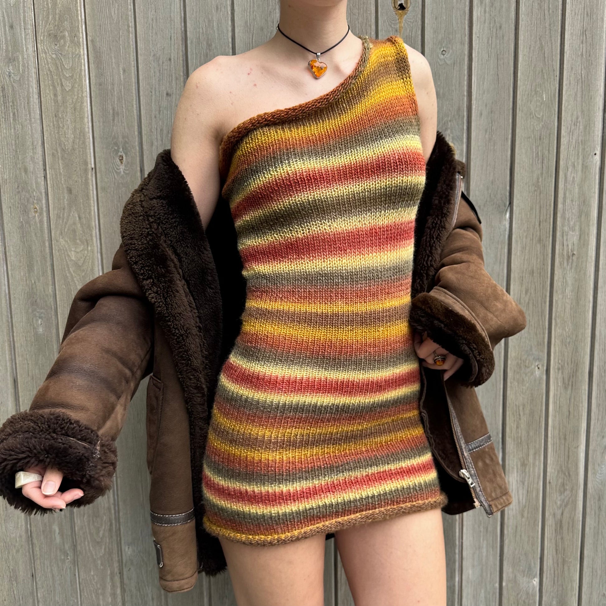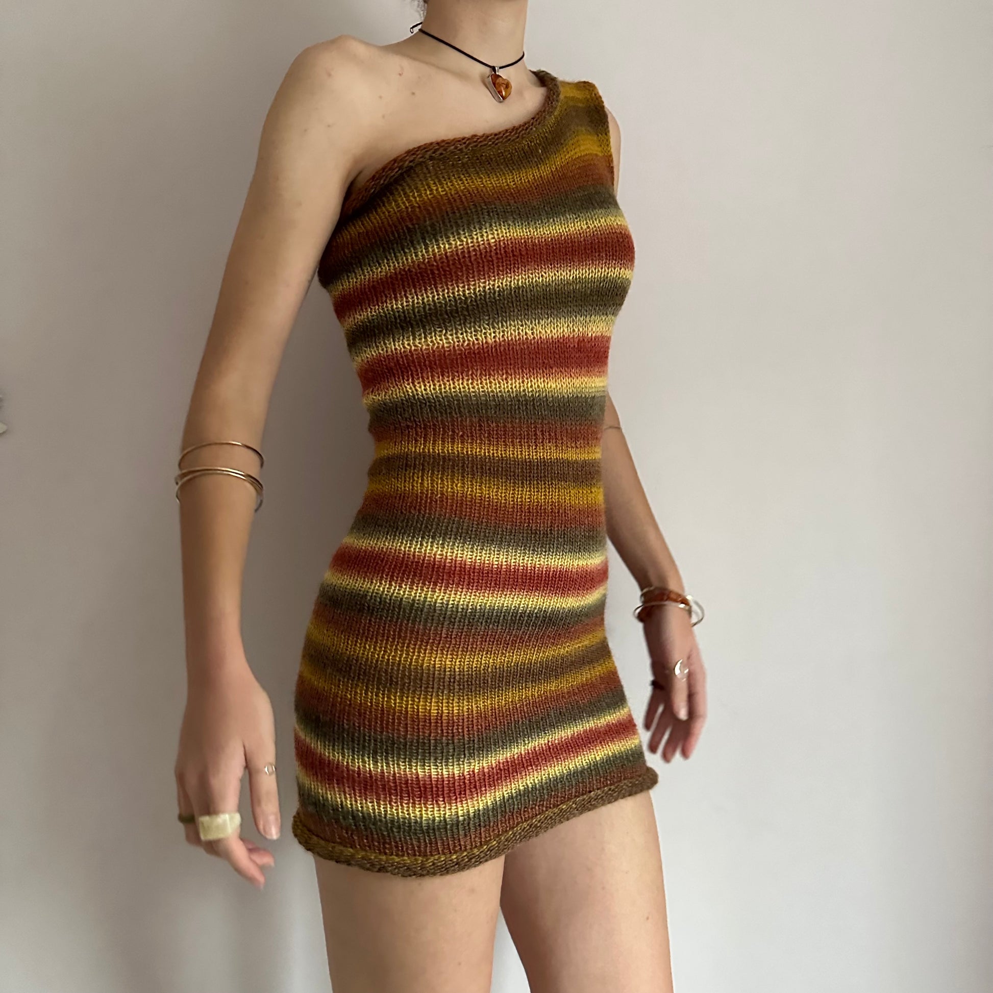 Super flattering asymmetrical one shoulder knitted mini dress in gorgeous ombré earth tones 🍁