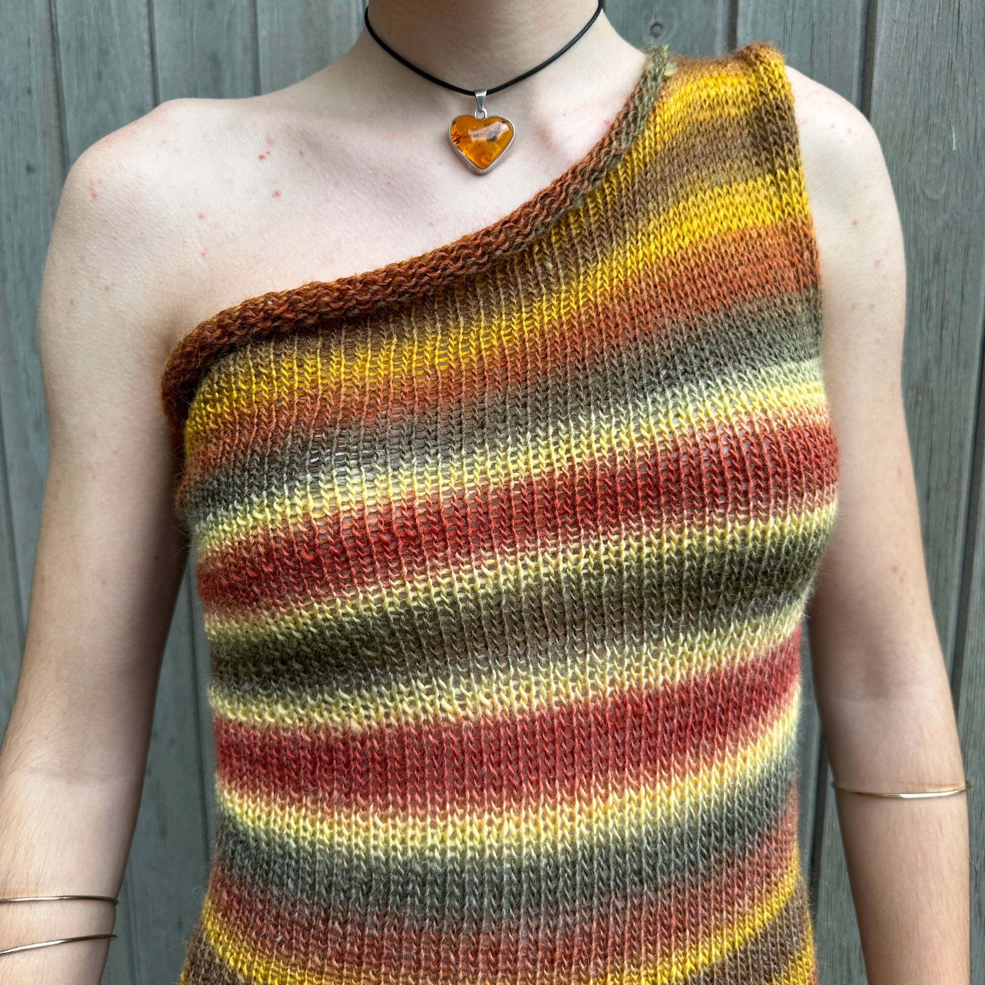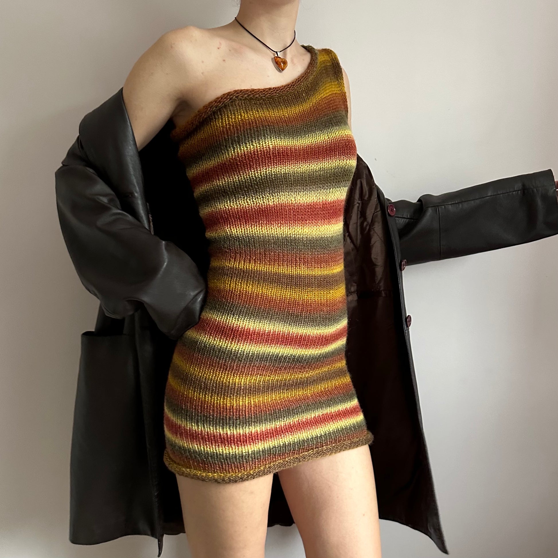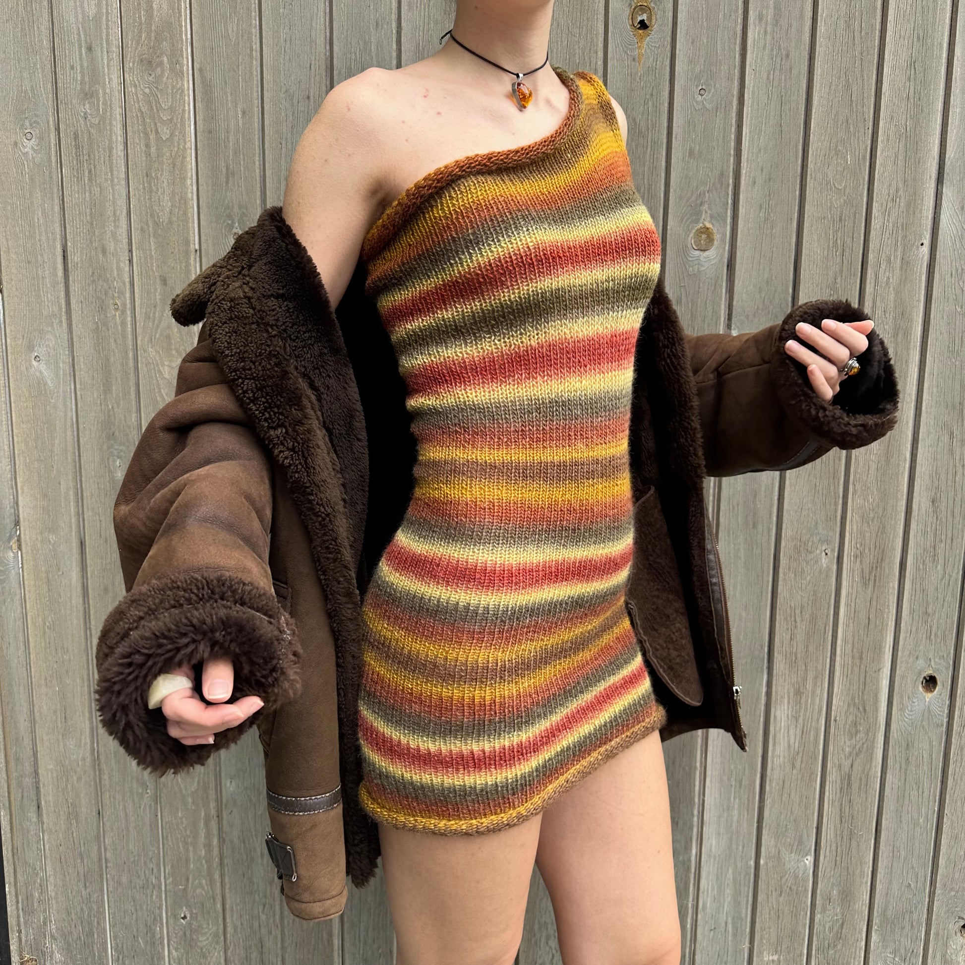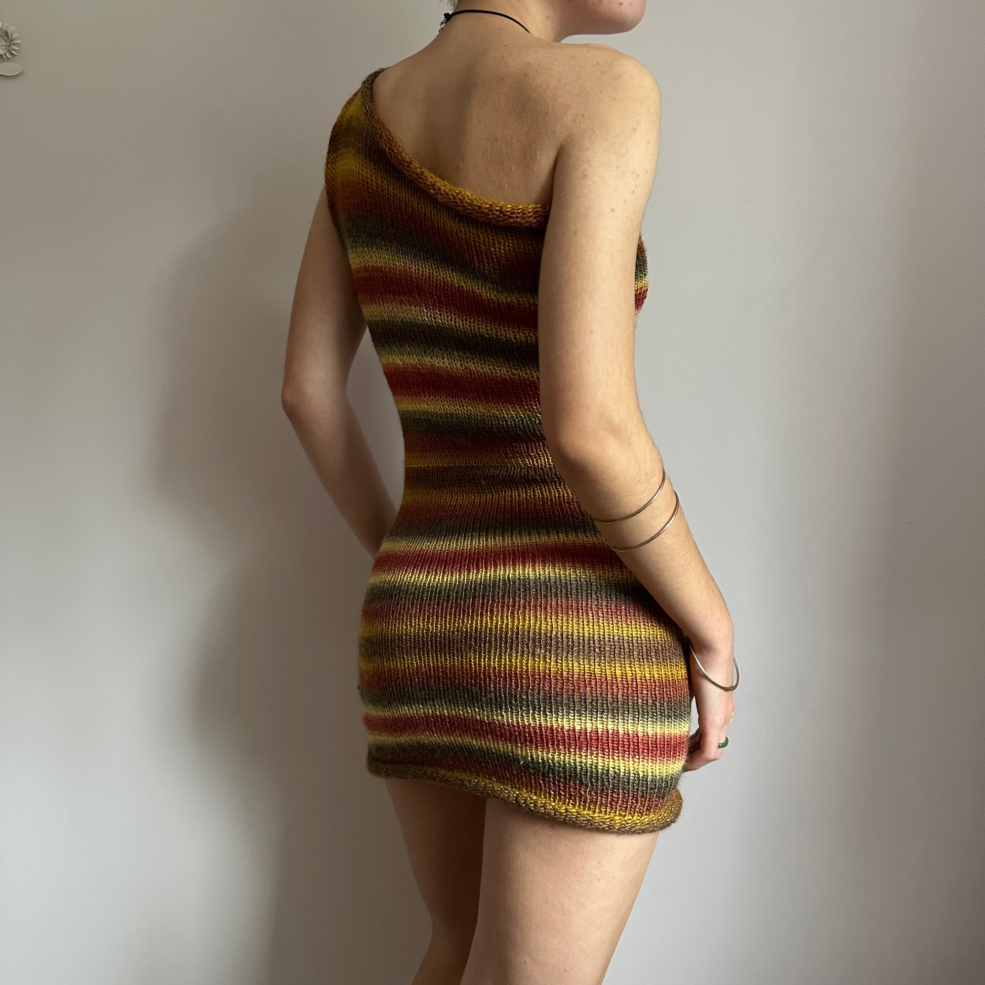 Super flattering asymmetrical one shoulder knitted mini dress in gorgeous ombré earth tones 🍁