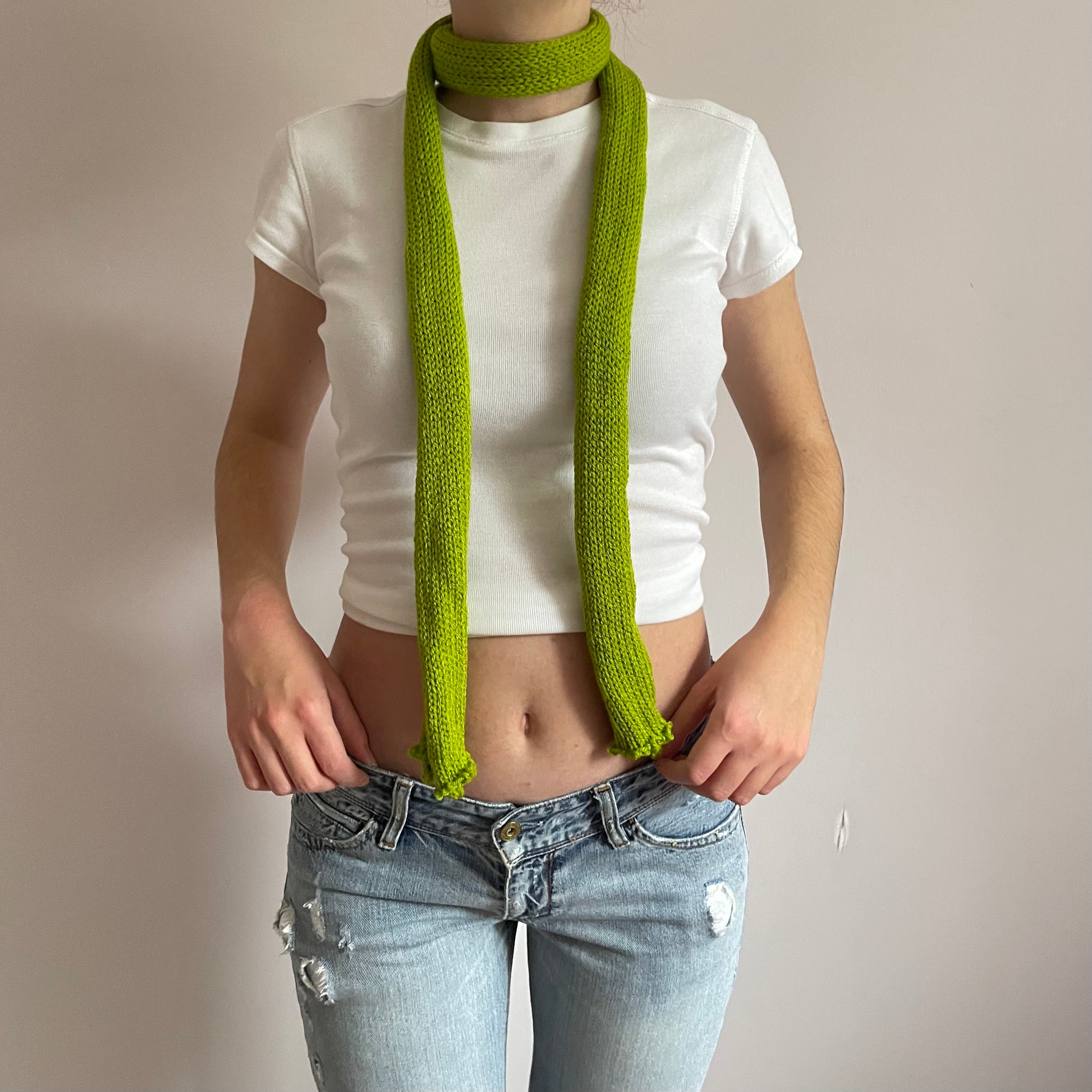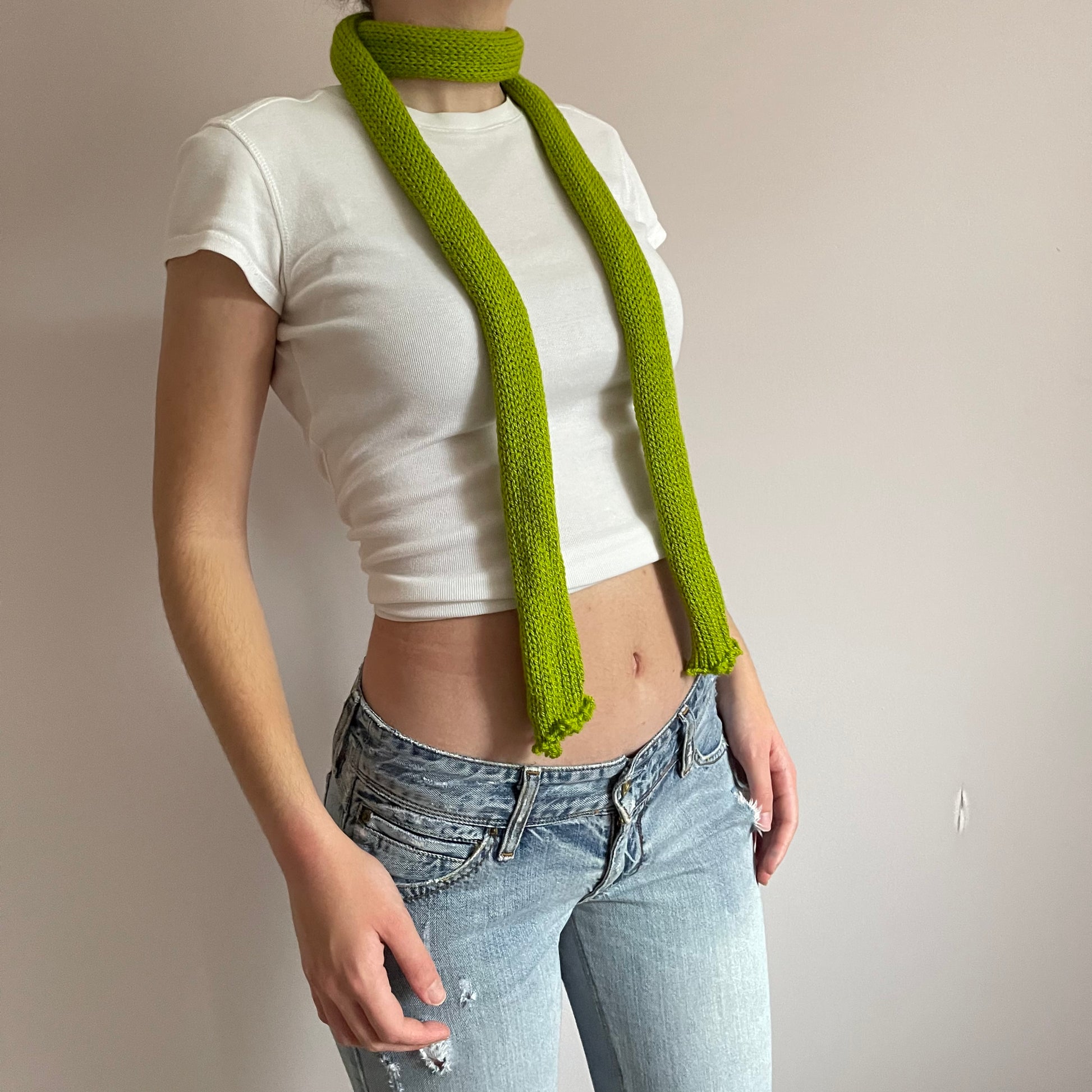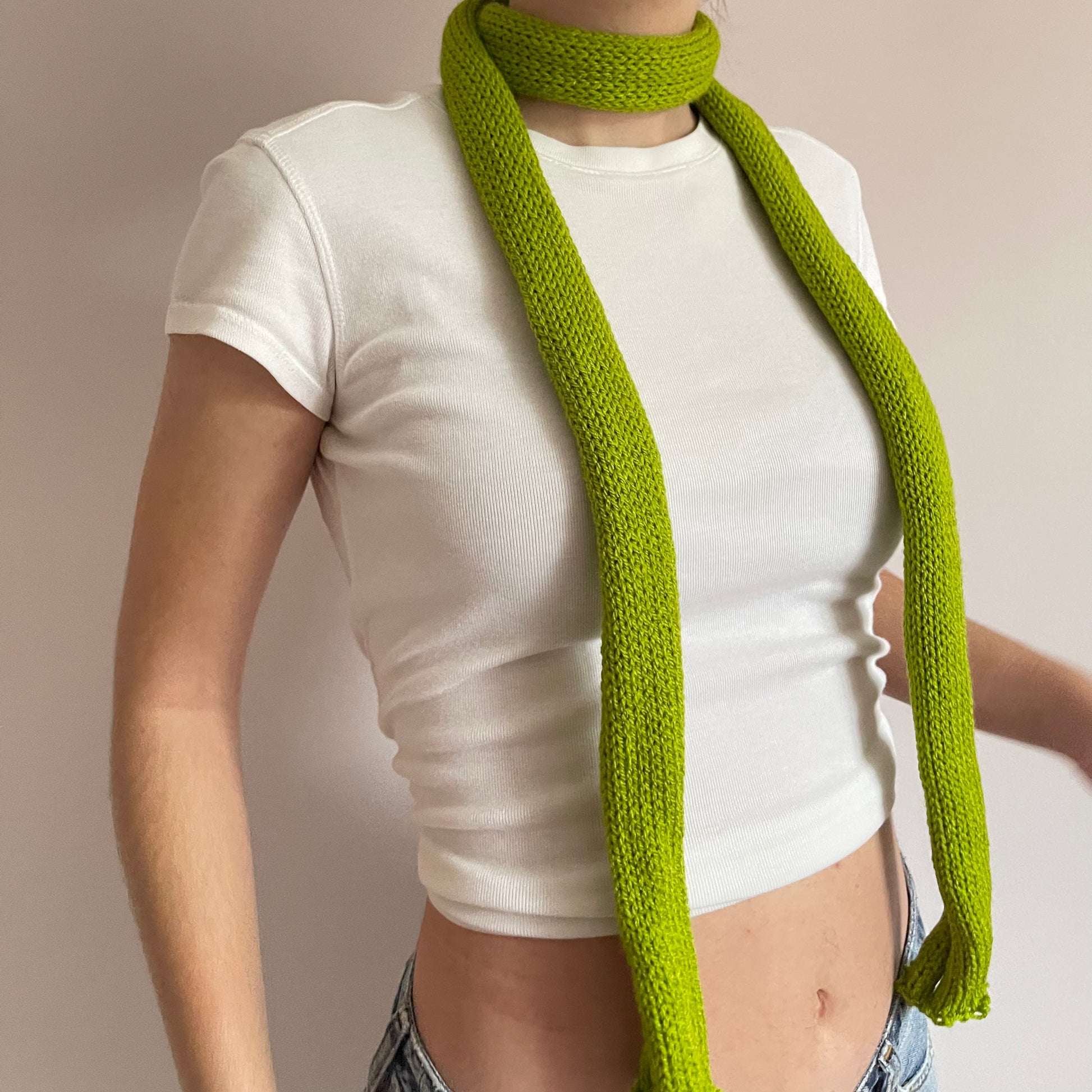 Knit skinny scarf in olive green, the perfect addition to your outfit and really flattering. Great for all year round! 🫒